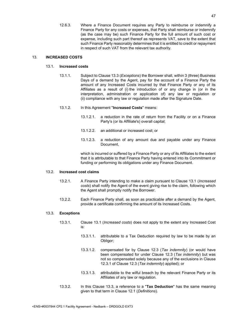 47 <ENS>#0537844 CP2.1 Facility Agreement - Nedbank – DRDGOLD EXT3 12.6.3. Where a Finance Document requires any Party to reimburse or indemnify a Finance Party for any costs or expenses, that Party shall reimburse or indemnify (as the case may be) such Finance Party for the full amount of such cost or expense, including such part thereof as represents VAT, save to the extent that such Finance Party reasonably determines that it is entitled to credit or repayment in respect of such VAT from the relevant tax authority. 13. INCREASED COSTS 13.1. Increased costs 13.1.1. Subject to Clause 13.3 (Exceptions) the Borrower shall, within 3 (three) Business Days of a demand by the Agent, pay for the account of a Finance Party the amount of any Increased Costs incurred by that Finance Party or any of its Affiliates as a result of (i) the introduction of or any change in (or in the interpretation, administration or application of) any law or regulation or (ii) compliance with any law or regulation made after the Signature Date. 13.1.2. In this Agreement "Increased Costs" means: 13.1.2.1. a reduction in the rate of return from the Facility or on a Finance Party's (or its Affiliate's) overall capital; 13.1.2.2. an additional or increased cost; or 13.1.2.3. a reduction of any amount due and payable under any Finance Document, which is incurred or suffered by a Finance Party or any of its Affiliates to the extent that it is attributable to that Finance Party having entered into its Commitment or funding or performing its obligations under any Finance Document. 13.2. Increased cost claims 13.2.1. A Finance Party intending to make a claim pursuant to Clause 13.1 (Increased costs) shall notify the Agent of the event giving rise to the claim, following which the Agent shall promptly notify the Borrower. 13.2.2. Each Finance Party shall, as soon as practicable after a demand by the Agent, provide a certificate confirming the amount of its Increased Costs. 13.3. Exceptions 13.3.1. Clause 13.1 (Increased costs) does not apply to the extent any Increased Cost is: 13.3.1.1. attributable to a Tax Deduction required by law to be made by an Obligor; 13.3.1.2. compensated for by Clause 12.3 (Tax indemnity) (or would have been compensated for under Clause 12.3 (Tax indemnity) but was not so compensated solely because any of the exclusions in Clause 12.3.1 of Clause 12.3 (Tax indemnity) applied); or 13.3.1.3. attributable to the wilful breach by the relevant Finance Party or its Affiliates of any law or regulation. 13.3.2. In this Clause 13.3, a reference to a "Tax Deduction" has the same meaning given to that term in Clause 12.1 (Definitions).