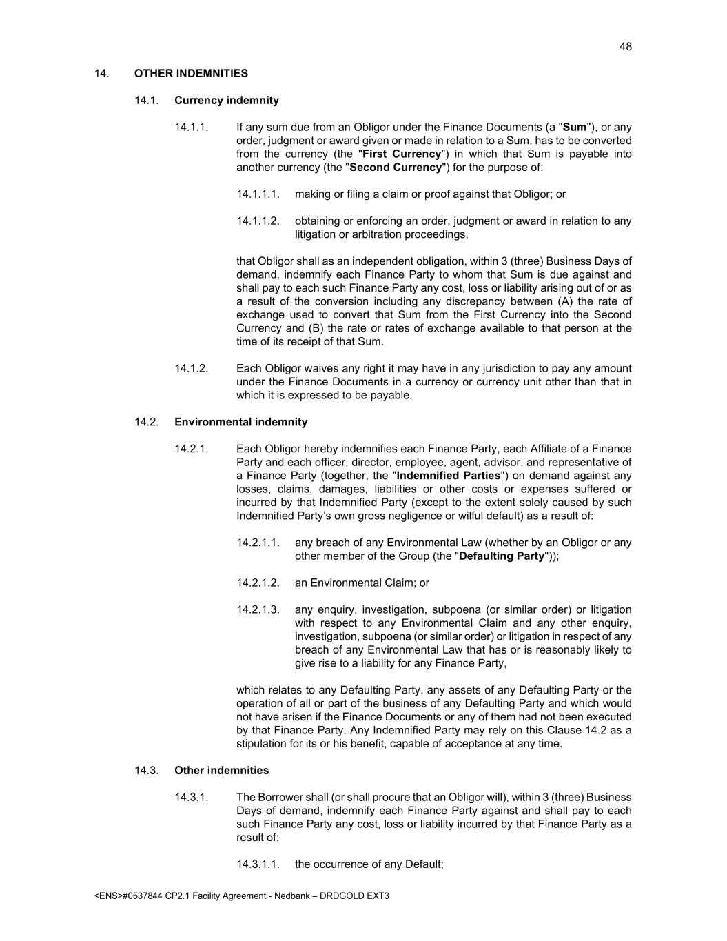 48 <ENS>#0537844 CP2.1 Facility Agreement - Nedbank – DRDGOLD EXT3 14. OTHER INDEMNITIES 14.1. Currency indemnity 14.1.1. If any sum due from an Obligor under the Finance Documents (a "Sum"), or any order, judgment or award given or made in relation to a Sum, has to be converted from the currency (the "First Currency") in which that Sum is payable into another currency (the "Second Currency") for the purpose of: 14.1.1.1. making or filing a claim or proof against that Obligor; or 14.1.1.2. obtaining or enforcing an order, judgment or award in relation to any litigation or arbitration proceedings, that Obligor shall as an independent obligation, within 3 (three) Business Days of demand, indemnify each Finance Party to whom that Sum is due against and shall pay to each such Finance Party any cost, loss or liability arising out of or as a result of the conversion including any discrepancy between (A) the rate of exchange used to convert that Sum from the First Currency into the Second Currency and (B) the rate or rates of exchange available to that person at the time of its receipt of that Sum. 14.1.2. Each Obligor waives any right it may have in any jurisdiction to pay any amount under the Finance Documents in a currency or currency unit other than that in which it is expressed to be payable. 14.2. Environmental indemnity 14.2.1. Each Obligor hereby indemnifies each Finance Party, each Affiliate of a Finance Party and each officer, director, employee, agent, advisor, and representative of a Finance Party (together, the "Indemnified Parties") on demand against any losses, claims, damages, liabilities or other costs or expenses suffered or incurred by that Indemnified Party (except to the extent solely caused by such Indemnified Party’s own gross negligence or wilful default) as a result of: 14.2.1.1. any breach of any Environmental Law (whether by an Obligor or any other member of the Group (the "Defaulting Party")); 14.2.1.2. an Environmental Claim; or 14.2.1.3. any enquiry, investigation, subpoena (or similar order) or litigation with respect to any Environmental Claim and any other enquiry, investigation, subpoena (or similar order) or litigation in respect of any breach of any Environmental Law that has or is reasonably likely to give rise to a liability for any Finance Party, which relates to any Defaulting Party, any assets of any Defaulting Party or the operation of all or part of the business of any Defaulting Party and which would not have arisen if the Finance Documents or any of them had not been executed by that Finance Party. Any Indemnified Party may rely on this Clause 14.2 as a stipulation for its or his benefit, capable of acceptance at any time. 14.3. Other indemnities 14.3.1. The Borrower shall (or shall procure that an Obligor will), within 3 (three) Business Days of demand, indemnify each Finance Party against and shall pay to each such Finance Party any cost, loss or liability incurred by that Finance Party as a result of: 14.3.1.1. the occurrence of any Default;