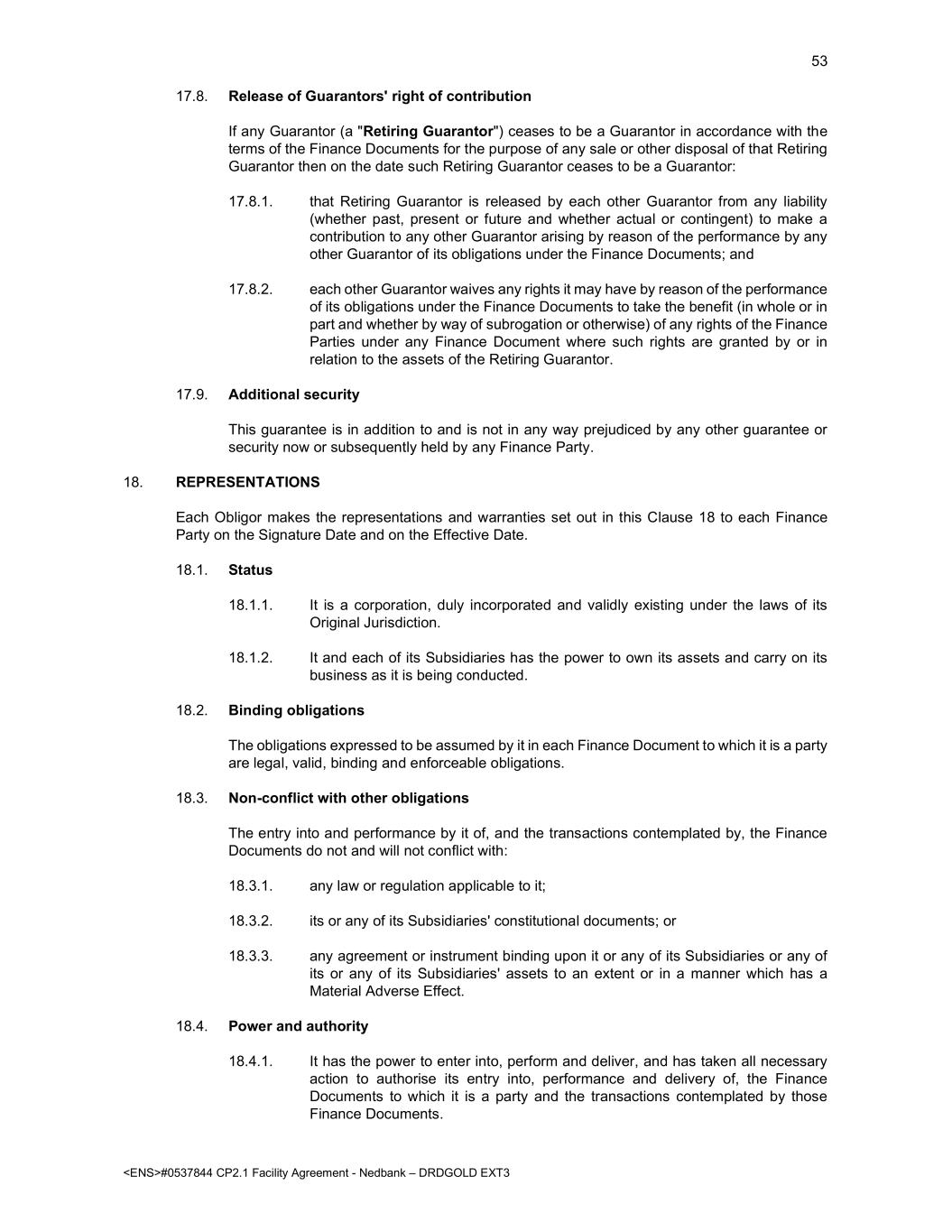 53 <ENS>#0537844 CP2.1 Facility Agreement - Nedbank – DRDGOLD EXT3 17.8. Release of Guarantors' right of contribution If any Guarantor (a "Retiring Guarantor") ceases to be a Guarantor in accordance with the terms of the Finance Documents for the purpose of any sale or other disposal of that Retiring Guarantor then on the date such Retiring Guarantor ceases to be a Guarantor: 17.8.1. that Retiring Guarantor is released by each other Guarantor from any liability (whether past, present or future and whether actual or contingent) to make a contribution to any other Guarantor arising by reason of the performance by any other Guarantor of its obligations under the Finance Documents; and 17.8.2. each other Guarantor waives any rights it may have by reason of the performance of its obligations under the Finance Documents to take the benefit (in whole or in part and whether by way of subrogation or otherwise) of any rights of the Finance Parties under any Finance Document where such rights are granted by or in relation to the assets of the Retiring Guarantor. 17.9. Additional security This guarantee is in addition to and is not in any way prejudiced by any other guarantee or security now or subsequently held by any Finance Party. 18. REPRESENTATIONS Each Obligor makes the representations and warranties set out in this Clause 18 to each Finance Party on the Signature Date and on the Effective Date. 18.1. Status 18.1.1. It is a corporation, duly incorporated and validly existing under the laws of its Original Jurisdiction. 18.1.2. It and each of its Subsidiaries has the power to own its assets and carry on its business as it is being conducted. 18.2. Binding obligations The obligations expressed to be assumed by it in each Finance Document to which it is a party are legal, valid, binding and enforceable obligations. 18.3. Non-conflict with other obligations The entry into and performance by it of, and the transactions contemplated by, the Finance Documents do not and will not conflict with: 18.3.1. any law or regulation applicable to it; 18.3.2. its or any of its Subsidiaries' constitutional documents; or 18.3.3. any agreement or instrument binding upon it or any of its Subsidiaries or any of its or any of its Subsidiaries' assets to an extent or in a manner which has a Material Adverse Effect. 18.4. Power and authority 18.4.1. It has the power to enter into, perform and deliver, and has taken all necessary action to authorise its entry into, performance and delivery of, the Finance Documents to which it is a party and the transactions contemplated by those Finance Documents.