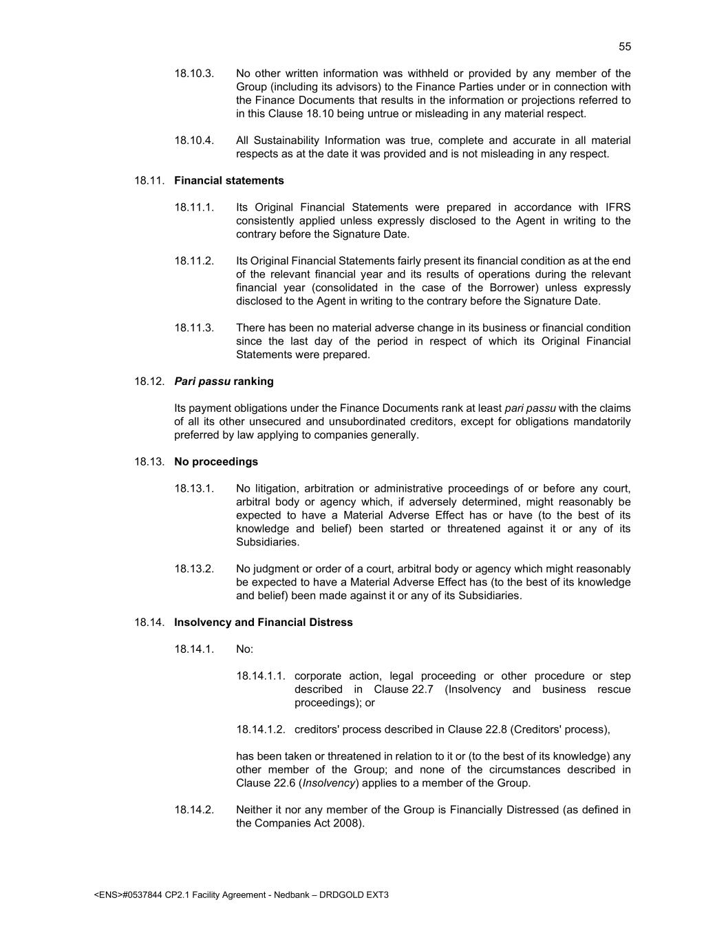 55 <ENS>#0537844 CP2.1 Facility Agreement - Nedbank – DRDGOLD EXT3 18.10.3. No other written information was withheld or provided by any member of the Group (including its advisors) to the Finance Parties under or in connection with the Finance Documents that results in the information or projections referred to in this Clause 18.10 being untrue or misleading in any material respect. 18.10.4. All Sustainability Information was true, complete and accurate in all material respects as at the date it was provided and is not misleading in any respect. 18.11. Financial statements 18.11.1. Its Original Financial Statements were prepared in accordance with IFRS consistently applied unless expressly disclosed to the Agent in writing to the contrary before the Signature Date. 18.11.2. Its Original Financial Statements fairly present its financial condition as at the end of the relevant financial year and its results of operations during the relevant financial year (consolidated in the case of the Borrower) unless expressly disclosed to the Agent in writing to the contrary before the Signature Date. 18.11.3. There has been no material adverse change in its business or financial condition since the last day of the period in respect of which its Original Financial Statements were prepared. 18.12. Pari passu ranking Its payment obligations under the Finance Documents rank at least pari passu with the claims of all its other unsecured and unsubordinated creditors, except for obligations mandatorily preferred by law applying to companies generally. 18.13. No proceedings 18.13.1. No litigation, arbitration or administrative proceedings of or before any court, arbitral body or agency which, if adversely determined, might reasonably be expected to have a Material Adverse Effect has or have (to the best of its knowledge and belief) been started or threatened against it or any of its Subsidiaries. 18.13.2. No judgment or order of a court, arbitral body or agency which might reasonably be expected to have a Material Adverse Effect has (to the best of its knowledge and belief) been made against it or any of its Subsidiaries. 18.14. Insolvency and Financial Distress 18.14.1. No: 18.14.1.1. corporate action, legal proceeding or other procedure or step described in Clause 22.7 (Insolvency and business rescue proceedings); or 18.14.1.2. creditors' process described in Clause 22.8 (Creditors' process), has been taken or threatened in relation to it or (to the best of its knowledge) any other member of the Group; and none of the circumstances described in Clause 22.6 (Insolvency) applies to a member of the Group. 18.14.2. Neither it nor any member of the Group is Financially Distressed (as defined in the Companies Act 2008).
