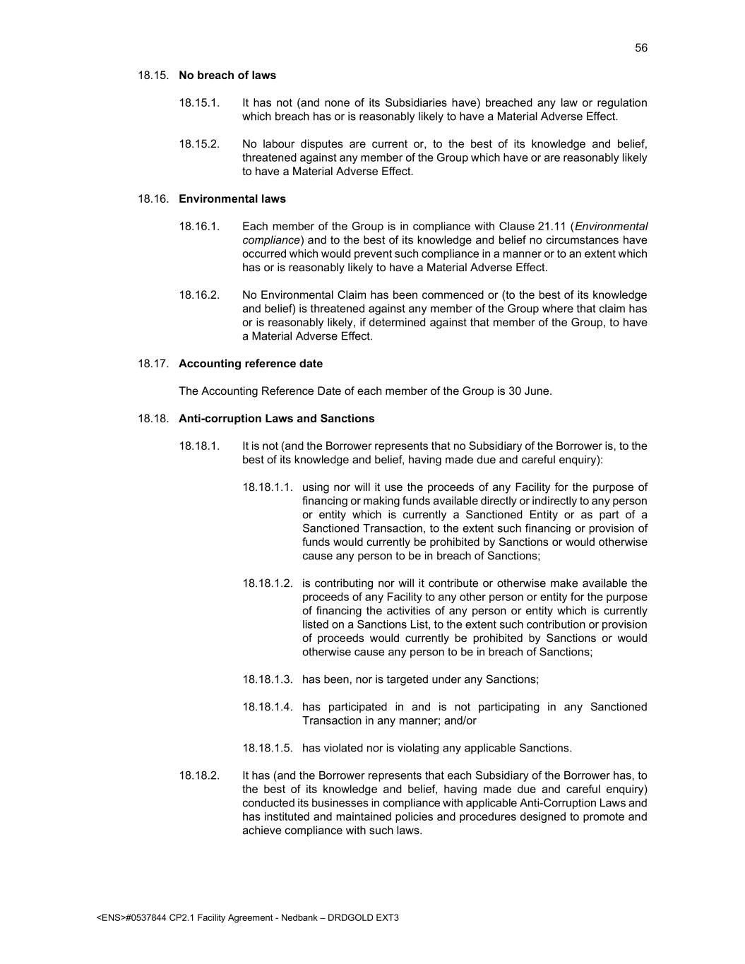 56 <ENS>#0537844 CP2.1 Facility Agreement - Nedbank – DRDGOLD EXT3 18.15. No breach of laws 18.15.1. It has not (and none of its Subsidiaries have) breached any law or regulation which breach has or is reasonably likely to have a Material Adverse Effect. 18.15.2. No labour disputes are current or, to the best of its knowledge and belief, threatened against any member of the Group which have or are reasonably likely to have a Material Adverse Effect. 18.16. Environmental laws 18.16.1. Each member of the Group is in compliance with Clause 21.11 (Environmental compliance) and to the best of its knowledge and belief no circumstances have occurred which would prevent such compliance in a manner or to an extent which has or is reasonably likely to have a Material Adverse Effect. 18.16.2. No Environmental Claim has been commenced or (to the best of its knowledge and belief) is threatened against any member of the Group where that claim has or is reasonably likely, if determined against that member of the Group, to have a Material Adverse Effect. 18.17. Accounting reference date The Accounting Reference Date of each member of the Group is 30 June. 18.18. Anti-corruption Laws and Sanctions 18.18.1. It is not (and the Borrower represents that no Subsidiary of the Borrower is, to the best of its knowledge and belief, having made due and careful enquiry): 18.18.1.1. using nor will it use the proceeds of any Facility for the purpose of financing or making funds available directly or indirectly to any person or entity which is currently a Sanctioned Entity or as part of a Sanctioned Transaction, to the extent such financing or provision of funds would currently be prohibited by Sanctions or would otherwise cause any person to be in breach of Sanctions; 18.18.1.2. is contributing nor will it contribute or otherwise make available the proceeds of any Facility to any other person or entity for the purpose of financing the activities of any person or entity which is currently listed on a Sanctions List, to the extent such contribution or provision of proceeds would currently be prohibited by Sanctions or would otherwise cause any person to be in breach of Sanctions; 18.18.1.3. has been, nor is targeted under any Sanctions; 18.18.1.4. has participated in and is not participating in any Sanctioned Transaction in any manner; and/or 18.18.1.5. has violated nor is violating any applicable Sanctions. 18.18.2. It has (and the Borrower represents that each Subsidiary of the Borrower has, to the best of its knowledge and belief, having made due and careful enquiry) conducted its businesses in compliance with applicable Anti-Corruption Laws and has instituted and maintained policies and procedures designed to promote and achieve compliance with such laws.
