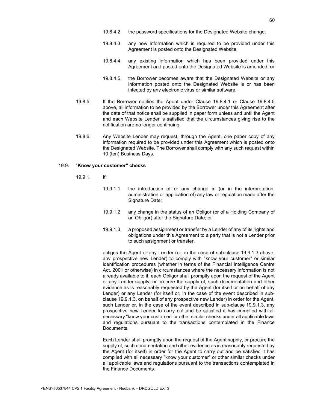 60 <ENS>#0537844 CP2.1 Facility Agreement - Nedbank – DRDGOLD EXT3 19.8.4.2. the password specifications for the Designated Website change; 19.8.4.3. any new information which is required to be provided under this Agreement is posted onto the Designated Website; 19.8.4.4. any existing information which has been provided under this Agreement and posted onto the Designated Website is amended; or 19.8.4.5. the Borrower becomes aware that the Designated Website or any information posted onto the Designated Website is or has been infected by any electronic virus or similar software. 19.8.5. If the Borrower notifies the Agent under Clause 19.8.4.1 or Clause 19.8.4.5 above, all information to be provided by the Borrower under this Agreement after the date of that notice shall be supplied in paper form unless and until the Agent and each Website Lender is satisfied that the circumstances giving rise to the notification are no longer continuing. 19.8.6. Any Website Lender may request, through the Agent, one paper copy of any information required to be provided under this Agreement which is posted onto the Designated Website. The Borrower shall comply with any such request within 10 (ten) Business Days. 19.9. "Know your customer" checks 19.9.1. If: 19.9.1.1. the introduction of or any change in (or in the interpretation, administration or application of) any law or regulation made after the Signature Date; 19.9.1.2. any change in the status of an Obligor (or of a Holding Company of an Obligor) after the Signature Date; or 19.9.1.3. a proposed assignment or transfer by a Lender of any of its rights and obligations under this Agreement to a party that is not a Lender prior to such assignment or transfer, obliges the Agent or any Lender (or, in the case of sub-clause 19.9.1.3 above, any prospective new Lender) to comply with "know your customer" or similar identification procedures (whether in terms of the Financial Intelligence Centre Act, 2001 or otherwise) in circumstances where the necessary information is not already available to it, each Obligor shall promptly upon the request of the Agent or any Lender supply, or procure the supply of, such documentation and other evidence as is reasonably requested by the Agent (for itself or on behalf of any Lender) or any Lender (for itself or, in the case of the event described in sub- clause 19.9.1.3, on behalf of any prospective new Lender) in order for the Agent, such Lender or, in the case of the event described in sub-clause 19.9.1.3, any prospective new Lender to carry out and be satisfied it has complied with all necessary "know your customer" or other similar checks under all applicable laws and regulations pursuant to the transactions contemplated in the Finance Documents. Each Lender shall promptly upon the request of the Agent supply, or procure the supply of, such documentation and other evidence as is reasonably requested by the Agent (for itself) in order for the Agent to carry out and be satisfied it has complied with all necessary "know your customer" or other similar checks under all applicable laws and regulations pursuant to the transactions contemplated in the Finance Documents.