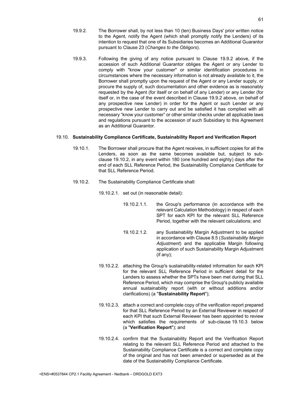 61 <ENS>#0537844 CP2.1 Facility Agreement - Nedbank – DRDGOLD EXT3 19.9.2. The Borrower shall, by not less than 10 (ten) Business Days' prior written notice to the Agent, notify the Agent (which shall promptly notify the Lenders) of its intention to request that one of its Subsidiaries becomes an Additional Guarantor pursuant to Clause 23 (Changes to the Obligors). 19.9.3. Following the giving of any notice pursuant to Clause 19.9.2 above, if the accession of such Additional Guarantor obliges the Agent or any Lender to comply with "know your customer" or similar identification procedures in circumstances where the necessary information is not already available to it, the Borrower shall promptly upon the request of the Agent or any Lender supply, or procure the supply of, such documentation and other evidence as is reasonably requested by the Agent (for itself or on behalf of any Lender) or any Lender (for itself or, in the case of the event described in Clause 19.9.2 above, on behalf of any prospective new Lender) in order for the Agent or such Lender or any prospective new Lender to carry out and be satisfied it has complied with all necessary “know your customer” or other similar checks under all applicable laws and regulations pursuant to the accession of such Subsidiary to this Agreement as an Additional Guarantor. 19.10. Sustainability Compliance Certificate, Sustainability Report and Verification Report 19.10.1. The Borrower shall procure that the Agent receives, in sufficient copies for all the Lenders, as soon as the same becomes available but, subject to sub- clause 19.10.2, in any event within 180 (one hundred and eighty) days after the end of each SLL Reference Period, the Sustainability Compliance Certificate for that SLL Reference Period. 19.10.2. The Sustainability Compliance Certificate shall: 19.10.2.1. set out (in reasonable detail): 19.10.2.1.1. the Group's performance (in accordance with the relevant Calculation Methodology) in respect of each SPT for each KPI for the relevant SLL Reference Period, together with the relevant calculations; and 19.10.2.1.2. any Sustainability Margin Adjustment to be applied in accordance with Clause 8.5 (Sustainability Margin Adjustment) and the applicable Margin following application of such Sustainability Margin Adjustment (if any); 19.10.2.2. attaching the Group's sustainability-related information for each KPI for the relevant SLL Reference Period in sufficient detail for the Lenders to assess whether the SPTs have been met during that SLL Reference Period, which may comprise the Group's publicly available annual sustainability report (with or without additions and/or clarifications) (a "Sustainability Report"); 19.10.2.3. attach a correct and complete copy of the verification report prepared for that SLL Reference Period by an External Reviewer in respect of each KPI that such External Reviewer has been appointed to review which satisfies the requirements of sub-clause 19.10.3 below (a "Verification Report"); and 19.10.2.4. confirm that the Sustainability Report and the Verification Report relating to the relevant SLL Reference Period and attached to the Sustainability Compliance Certificate is a correct and complete copy of the original and has not been amended or superseded as at the date of the Sustainability Compliance Certificate.