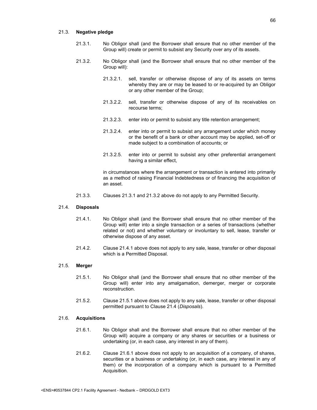 66 <ENS>#0537844 CP2.1 Facility Agreement - Nedbank – DRDGOLD EXT3 21.3. Negative pledge 21.3.1. No Obligor shall (and the Borrower shall ensure that no other member of the Group will) create or permit to subsist any Security over any of its assets. 21.3.2. No Obligor shall (and the Borrower shall ensure that no other member of the Group will): 21.3.2.1. sell, transfer or otherwise dispose of any of its assets on terms whereby they are or may be leased to or re-acquired by an Obligor or any other member of the Group; 21.3.2.2. sell, transfer or otherwise dispose of any of its receivables on recourse terms; 21.3.2.3. enter into or permit to subsist any title retention arrangement; 21.3.2.4. enter into or permit to subsist any arrangement under which money or the benefit of a bank or other account may be applied, set-off or made subject to a combination of accounts; or 21.3.2.5. enter into or permit to subsist any other preferential arrangement having a similar effect, in circumstances where the arrangement or transaction is entered into primarily as a method of raising Financial Indebtedness or of financing the acquisition of an asset. 21.3.3. Clauses 21.3.1 and 21.3.2 above do not apply to any Permitted Security. 21.4. Disposals 21.4.1. No Obligor shall (and the Borrower shall ensure that no other member of the Group will) enter into a single transaction or a series of transactions (whether related or not) and whether voluntary or involuntary to sell, lease, transfer or otherwise dispose of any asset. 21.4.2. Clause 21.4.1 above does not apply to any sale, lease, transfer or other disposal which is a Permitted Disposal. 21.5. Merger 21.5.1. No Obligor shall (and the Borrower shall ensure that no other member of the Group will) enter into any amalgamation, demerger, merger or corporate reconstruction. 21.5.2. Clause 21.5.1 above does not apply to any sale, lease, transfer or other disposal permitted pursuant to Clause 21.4 (Disposals). 21.6. Acquisitions 21.6.1. No Obligor shall and the Borrower shall ensure that no other member of the Group will) acquire a company or any shares or securities or a business or undertaking (or, in each case, any interest in any of them). 21.6.2. Clause 21.6.1 above does not apply to an acquisition of a company, of shares, securities or a business or undertaking (or, in each case, any interest in any of them) or the incorporation of a company which is pursuant to a Permitted Acquisition.