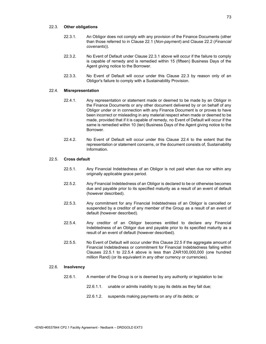 73 <ENS>#0537844 CP2.1 Facility Agreement - Nedbank – DRDGOLD EXT3 22.3. Other obligations 22.3.1. An Obligor does not comply with any provision of the Finance Documents (other than those referred to in Clause 22.1 (Non-payment) and Clause 22.2 (Financial covenants)). 22.3.2. No Event of Default under Clause 22.3.1 above will occur if the failure to comply is capable of remedy and is remedied within 15 (fifteen) Business Days of the Agent giving notice to the Borrower. 22.3.3. No Event of Default will occur under this Clause 22.3 by reason only of an Obligor's failure to comply with a Sustainability Provision. 22.4. Misrepresentation 22.4.1. Any representation or statement made or deemed to be made by an Obligor in the Finance Documents or any other document delivered by or on behalf of any Obligor under or in connection with any Finance Document is or proves to have been incorrect or misleading in any material respect when made or deemed to be made, provided that if it is capable of remedy, no Event of Default will occur if the same is remedied within 10 (ten) Business Days of the Agent giving notice to the Borrower. 22.4.2. No Event of Default will occur under this Clause 22.4 to the extent that the representation or statement concerns, or the document consists of, Sustainability Information. 22.5. Cross default 22.5.1. Any Financial Indebtedness of an Obligor is not paid when due nor within any originally applicable grace period. 22.5.2. Any Financial Indebtedness of an Obligor is declared to be or otherwise becomes due and payable prior to its specified maturity as a result of an event of default (however described). 22.5.3. Any commitment for any Financial Indebtedness of an Obligor is cancelled or suspended by a creditor of any member of the Group as a result of an event of default (however described). 22.5.4. Any creditor of an Obligor becomes entitled to declare any Financial Indebtedness of an Obligor due and payable prior to its specified maturity as a result of an event of default (however described). 22.5.5. No Event of Default will occur under this Clause 22.5 if the aggregate amount of Financial Indebtedness or commitment for Financial Indebtedness falling within Clauses 22.5.1 to 22.5.4 above is less than ZAR100,000,000 (one hundred million Rand) (or its equivalent in any other currency or currencies). 22.6. Insolvency 22.6.1. A member of the Group is or is deemed by any authority or legislation to be: 22.6.1.1. unable or admits inability to pay its debts as they fall due; 22.6.1.2. suspends making payments on any of its debts; or