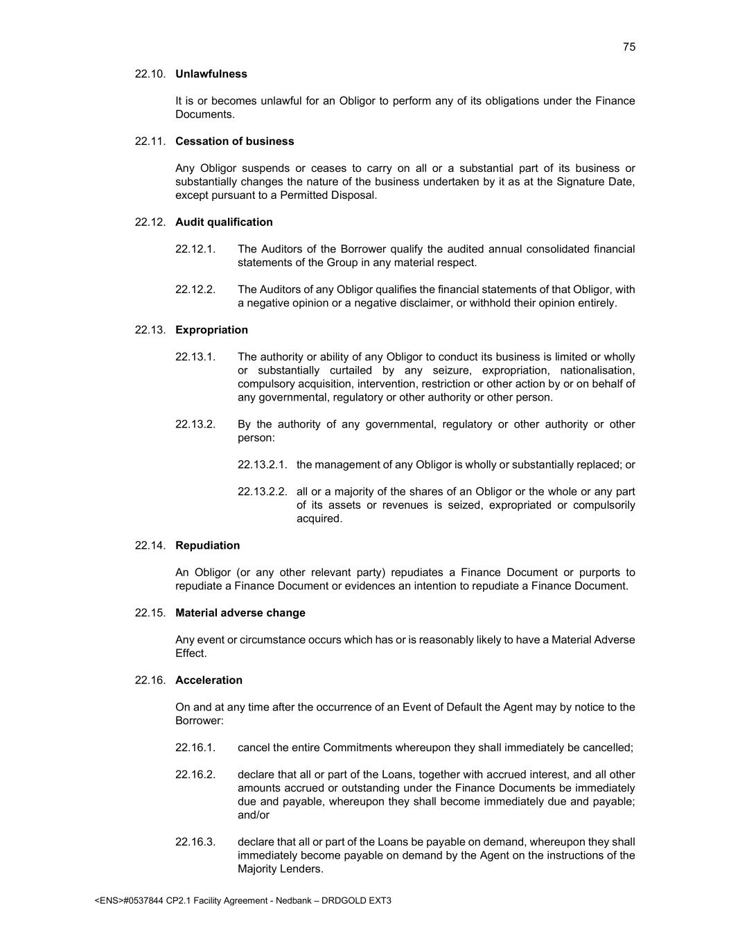 75 <ENS>#0537844 CP2.1 Facility Agreement - Nedbank – DRDGOLD EXT3 22.10. Unlawfulness It is or becomes unlawful for an Obligor to perform any of its obligations under the Finance Documents. 22.11. Cessation of business Any Obligor suspends or ceases to carry on all or a substantial part of its business or substantially changes the nature of the business undertaken by it as at the Signature Date, except pursuant to a Permitted Disposal. 22.12. Audit qualification 22.12.1. The Auditors of the Borrower qualify the audited annual consolidated financial statements of the Group in any material respect. 22.12.2. The Auditors of any Obligor qualifies the financial statements of that Obligor, with a negative opinion or a negative disclaimer, or withhold their opinion entirely. 22.13. Expropriation 22.13.1. The authority or ability of any Obligor to conduct its business is limited or wholly or substantially curtailed by any seizure, expropriation, nationalisation, compulsory acquisition, intervention, restriction or other action by or on behalf of any governmental, regulatory or other authority or other person. 22.13.2. By the authority of any governmental, regulatory or other authority or other person: 22.13.2.1. the management of any Obligor is wholly or substantially replaced; or 22.13.2.2. all or a majority of the shares of an Obligor or the whole or any part of its assets or revenues is seized, expropriated or compulsorily acquired. 22.14. Repudiation An Obligor (or any other relevant party) repudiates a Finance Document or purports to repudiate a Finance Document or evidences an intention to repudiate a Finance Document. 22.15. Material adverse change Any event or circumstance occurs which has or is reasonably likely to have a Material Adverse Effect. 22.16. Acceleration On and at any time after the occurrence of an Event of Default the Agent may by notice to the Borrower: 22.16.1. cancel the entire Commitments whereupon they shall immediately be cancelled; 22.16.2. declare that all or part of the Loans, together with accrued interest, and all other amounts accrued or outstanding under the Finance Documents be immediately due and payable, whereupon they shall become immediately due and payable; and/or 22.16.3. declare that all or part of the Loans be payable on demand, whereupon they shall immediately become payable on demand by the Agent on the instructions of the Majority Lenders.