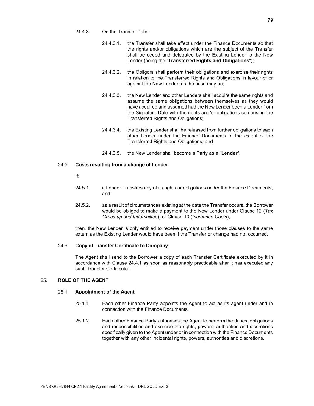79 <ENS>#0537844 CP2.1 Facility Agreement - Nedbank – DRDGOLD EXT3 24.4.3. On the Transfer Date: 24.4.3.1. the Transfer shall take effect under the Finance Documents so that the rights and/or obligations which are the subject of the Transfer shall be ceded and delegated by the Existing Lender to the New Lender (being the "Transferred Rights and Obligations"); 24.4.3.2. the Obligors shall perform their obligations and exercise their rights in relation to the Transferred Rights and Obligations in favour of or against the New Lender, as the case may be; 24.4.3.3. the New Lender and other Lenders shall acquire the same rights and assume the same obligations between themselves as they would have acquired and assumed had the New Lender been a Lender from the Signature Date with the rights and/or obligations comprising the Transferred Rights and Obligations; 24.4.3.4. the Existing Lender shall be released from further obligations to each other Lender under the Finance Documents to the extent of the Transferred Rights and Obligations; and 24.4.3.5. the New Lender shall become a Party as a "Lender". 24.5. Costs resulting from a change of Lender If: 24.5.1. a Lender Transfers any of its rights or obligations under the Finance Documents; and 24.5.2. as a result of circumstances existing at the date the Transfer occurs, the Borrower would be obliged to make a payment to the New Lender under Clause 12 (Tax Gross-up and Indemnities)) or Clause 13 (Increased Costs), then, the New Lender is only entitled to receive payment under those clauses to the same extent as the Existing Lender would have been if the Transfer or change had not occurred. 24.6. Copy of Transfer Certificate to Company The Agent shall send to the Borrower a copy of each Transfer Certificate executed by it in accordance with Clause 24.4.1 as soon as reasonably practicable after it has executed any such Transfer Certificate. 25. ROLE OF THE AGENT 25.1. Appointment of the Agent 25.1.1. Each other Finance Party appoints the Agent to act as its agent under and in connection with the Finance Documents. 25.1.2. Each other Finance Party authorises the Agent to perform the duties, obligations and responsibilities and exercise the rights, powers, authorities and discretions specifically given to the Agent under or in connection with the Finance Documents together with any other incidental rights, powers, authorities and discretions.