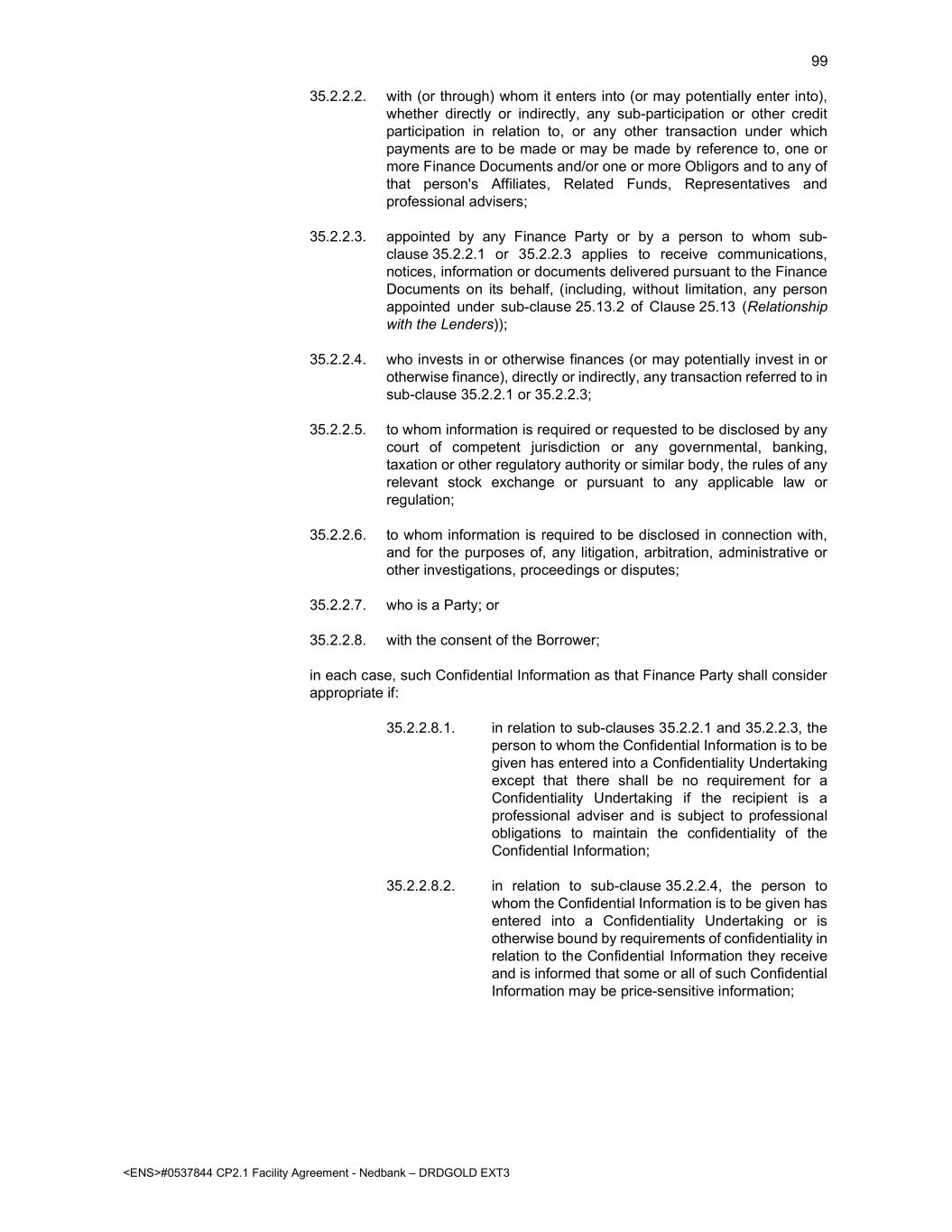 99 <ENS>#0537844 CP2.1 Facility Agreement - Nedbank – DRDGOLD EXT3 35.2.2.2. with (or through) whom it enters into (or may potentially enter into), whether directly or indirectly, any sub-participation or other credit participation in relation to, or any other transaction under which payments are to be made or may be made by reference to, one or more Finance Documents and/or one or more Obligors and to any of that person's Affiliates, Related Funds, Representatives and professional advisers; 35.2.2.3. appointed by any Finance Party or by a person to whom sub- clause 35.2.2.1 or 35.2.2.3 applies to receive communications, notices, information or documents delivered pursuant to the Finance Documents on its behalf, (including, without limitation, any person appointed under sub-clause 25.13.2 of Clause 25.13 (Relationship with the Lenders)); 35.2.2.4. who invests in or otherwise finances (or may potentially invest in or otherwise finance), directly or indirectly, any transaction referred to in sub-clause 35.2.2.1 or 35.2.2.3; 35.2.2.5. to whom information is required or requested to be disclosed by any court of competent jurisdiction or any governmental, banking, taxation or other regulatory authority or similar body, the rules of any relevant stock exchange or pursuant to any applicable law or regulation; 35.2.2.6. to whom information is required to be disclosed in connection with, and for the purposes of, any litigation, arbitration, administrative or other investigations, proceedings or disputes; 35.2.2.7. who is a Party; or 35.2.2.8. with the consent of the Borrower; in each case, such Confidential Information as that Finance Party shall consider appropriate if: 35.2.2.8.1. in relation to sub-clauses 35.2.2.1 and 35.2.2.3, the person to whom the Confidential Information is to be given has entered into a Confidentiality Undertaking except that there shall be no requirement for a Confidentiality Undertaking if the recipient is a professional adviser and is subject to professional obligations to maintain the confidentiality of the Confidential Information; 35.2.2.8.2. in relation to sub-clause 35.2.2.4, the person to whom the Confidential Information is to be given has entered into a Confidentiality Undertaking or is otherwise bound by requirements of confidentiality in relation to the Confidential Information they receive and is informed that some or all of such Confidential Information may be price-sensitive information;