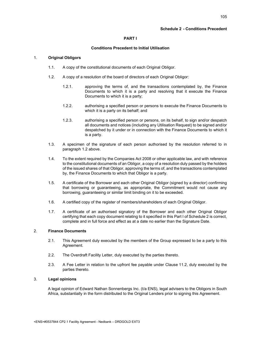 105 <ENS>#0537844 CP2.1 Facility Agreement - Nedbank – DRDGOLD EXT3 Schedule 2 - Conditions Precedent PART I Conditions Precedent to Initial Utilisation 1. Original Obligors 1.1. A copy of the constitutional documents of each Original Obligor. 1.2. A copy of a resolution of the board of directors of each Original Obligor: 1.2.1. approving the terms of, and the transactions contemplated by, the Finance Documents to which it is a party and resolving that it execute the Finance Documents to which it is a party; 1.2.2. authorising a specified person or persons to execute the Finance Documents to which it is a party on its behalf; and 1.2.3. authorising a specified person or persons, on its behalf, to sign and/or despatch all documents and notices (including any Utilisation Request) to be signed and/or despatched by it under or in connection with the Finance Documents to which it is a party. 1.3. A specimen of the signature of each person authorised by the resolution referred to in paragraph 1.2 above. 1.4. To the extent required by the Companies Act 2008 or other applicable law, and with reference to the constitutional documents of an Obligor, a copy of a resolution duly passed by the holders of the issued shares of that Obligor, approving the terms of, and the transactions contemplated by, the Finance Documents to which that Obligor is a party. 1.5. A certificate of the Borrower and each other Original Obligor (signed by a director) confirming that borrowing or guaranteeing, as appropriate, the Commitment would not cause any borrowing, guaranteeing or similar limit binding on it to be exceeded. 1.6. A certified copy of the register of members/shareholders of each Original Obligor. 1.7. A certificate of an authorised signatory of the Borrower and each other Original Obligor certifying that each copy document relating to it specified in this Part I of Schedule 2 is correct, complete and in full force and effect as at a date no earlier than the Signature Date. 2. Finance Documents 2.1. This Agreement duly executed by the members of the Group expressed to be a party to this Agreement. 2.2. The Overdraft Facility Letter, duly executed by the parties thereto. 2.3. A Fee Letter in relation to the upfront fee payable under Clause 11.2, duly executed by the parties thereto. 3. Legal opinions A legal opinion of Edward Nathan Sonnenbergs Inc. (t/a ENS), legal advisers to the Obligors in South Africa, substantially in the form distributed to the Original Lenders prior to signing this Agreement.
