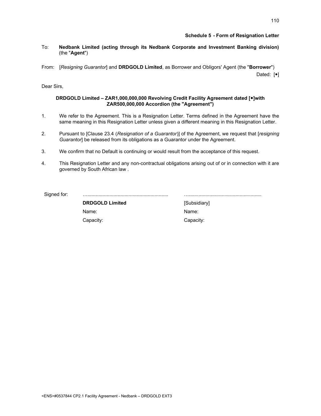 110 <ENS>#0537844 CP2.1 Facility Agreement - Nedbank – DRDGOLD EXT3 Schedule 5 - Form of Resignation Letter To: Nedbank Limited (acting through its Nedbank Corporate and Investment Banking division) (the "Agent") From: [Resigning Guarantor] and DRDGOLD Limited, as Borrower and Obligors' Agent (the "Borrower") Dated: [] Dear Sirs, DRDGOLD Limited – ZAR1,000,000,000 Revolving Credit Facility Agreement dated []with ZAR500,000,000 Accordion (the "Agreement") 1. We refer to the Agreement. This is a Resignation Letter. Terms defined in the Agreement have the same meaning in this Resignation Letter unless given a different meaning in this Resignation Letter. 2. Pursuant to [Clause 23.4 (Resignation of a Guarantor)] of the Agreement, we request that [resigning Guarantor] be released from its obligations as a Guarantor under the Agreement. 3. We confirm that no Default is continuing or would result from the acceptance of this request. 4. This Resignation Letter and any non-contractual obligations arising out of or in connection with it are governed by South African law . Signed for: …........................................................... …..................................................... DRDGOLD Limited [Subsidiary] Name: Name: Capacity: Capacity: