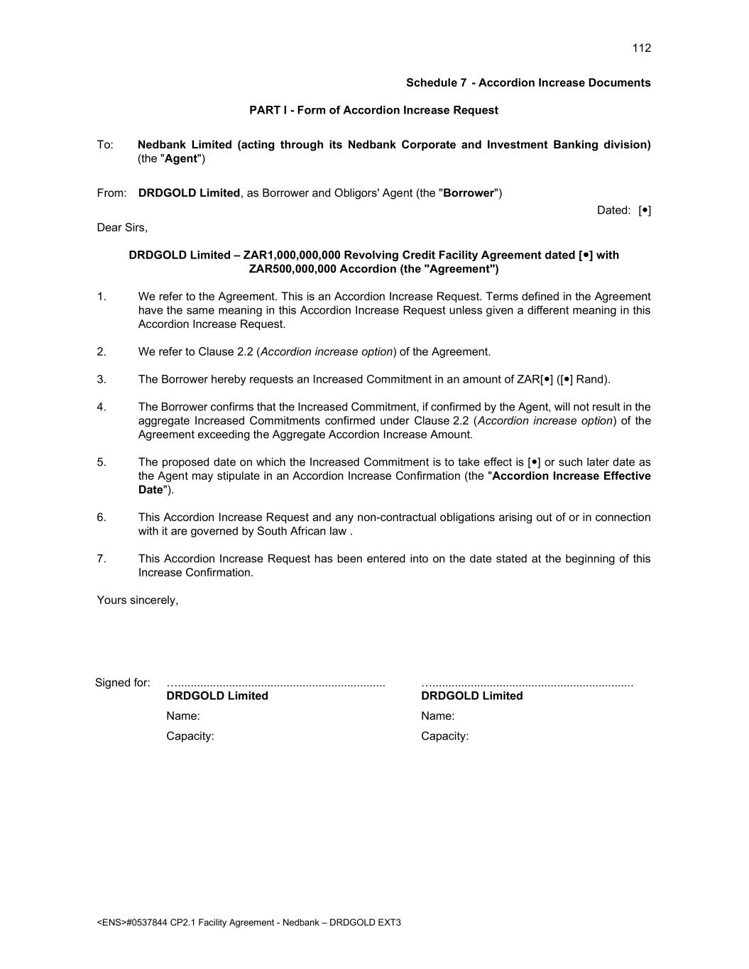 112 <ENS>#0537844 CP2.1 Facility Agreement - Nedbank – DRDGOLD EXT3 Schedule 7 - Accordion Increase Documents PART I - Form of Accordion Increase Request To: Nedbank Limited (acting through its Nedbank Corporate and Investment Banking division) (the "Agent") From: DRDGOLD Limited, as Borrower and Obligors' Agent (the "Borrower") Dated: [] Dear Sirs, DRDGOLD Limited – ZAR1,000,000,000 Revolving Credit Facility Agreement dated [] with ZAR500,000,000 Accordion (the "Agreement") 1. We refer to the Agreement. This is an Accordion Increase Request. Terms defined in the Agreement have the same meaning in this Accordion Increase Request unless given a different meaning in this Accordion Increase Request. 2. We refer to Clause 2.2 (Accordion increase option) of the Agreement. 3. The Borrower hereby requests an Increased Commitment in an amount of ZAR[] ([] Rand). 4. The Borrower confirms that the Increased Commitment, if confirmed by the Agent, will not result in the aggregate Increased Commitments confirmed under Clause 2.2 (Accordion increase option) of the Agreement exceeding the Aggregate Accordion Increase Amount. 5. The proposed date on which the Increased Commitment is to take effect is [] or such later date as the Agent may stipulate in an Accordion Increase Confirmation (the "Accordion Increase Effective Date"). 6. This Accordion Increase Request and any non-contractual obligations arising out of or in connection with it are governed by South African law . 7. This Accordion Increase Request has been entered into on the date stated at the beginning of this Increase Confirmation. Yours sincerely, Signed for: …................................................................. …............................................................... DRDGOLD Limited Name: Capacity: DRDGOLD Limited Name: Capacity: