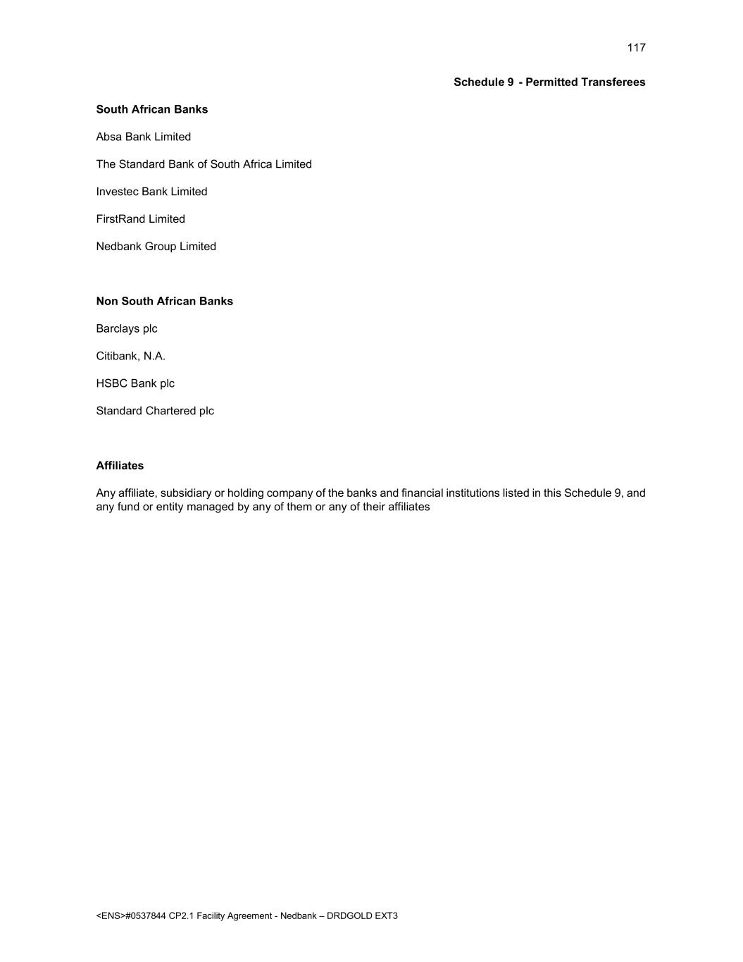 117 <ENS>#0537844 CP2.1 Facility Agreement - Nedbank – DRDGOLD EXT3 Schedule 9 - Permitted Transferees South African Banks Absa Bank Limited The Standard Bank of South Africa Limited Investec Bank Limited FirstRand Limited Nedbank Group Limited Non South African Banks Barclays plc Citibank, N.A. HSBC Bank plc Standard Chartered plc Affiliates Any affiliate, subsidiary or holding company of the banks and financial institutions listed in this Schedule 9, and any fund or entity managed by any of them or any of their affiliates