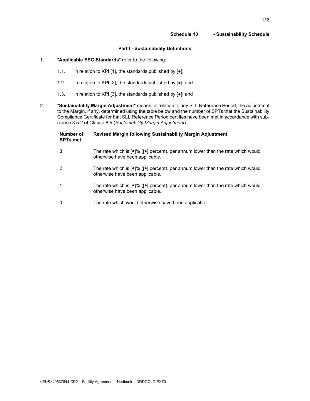 118 <ENS>#0537844 CP2.1 Facility Agreement - Nedbank – DRDGOLD EXT3 Schedule 10 - Sustainability Schedule Part I - Sustainability Definitions 1. "Applicable ESG Standards" refer to the following: 1.1. in relation to KPI [1], the standards published by [●]; 1.2. in relation to KPI [2], the standards published by [●]; and 1.3. in relation to KPI [3], the standards published by [●]; and 2. "Sustainability Margin Adjustment" means, in relation to any SLL Reference Period, the adjustment to the Margin, if any, determined using the table below and the number of SPTs that the Sustainability Compliance Certificate for that SLL Reference Period certifies have been met in accordance with sub- clause 8.5.2 of Clause 8.5 (Sustainability Margin Adjustment): Number of SPTs met Revised Margin following Sustainability Margin Adjustment 3 The rate which is []% ([] percent). per annum lower than the rate which would otherwise have been applicable. 2 The rate which is []% ([] percent). per annum lower than the rate which would otherwise have been applicable. 1 The rate which is []% ([] percent). per annum lower than the rate which would otherwise have been applicable. 0 The rate which would otherwise have been applicable.