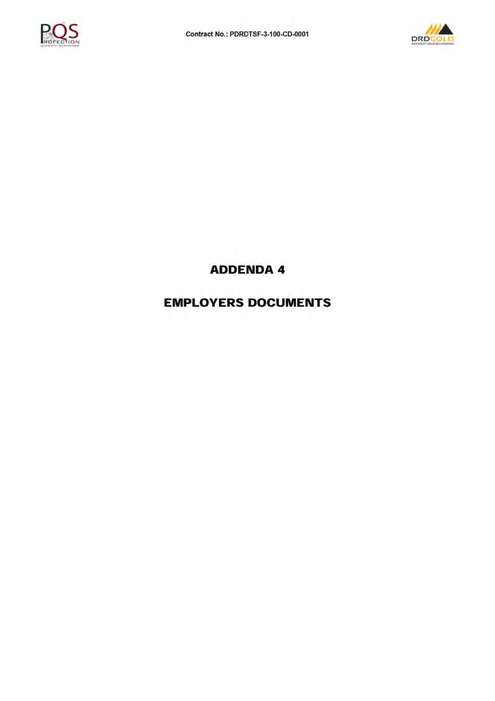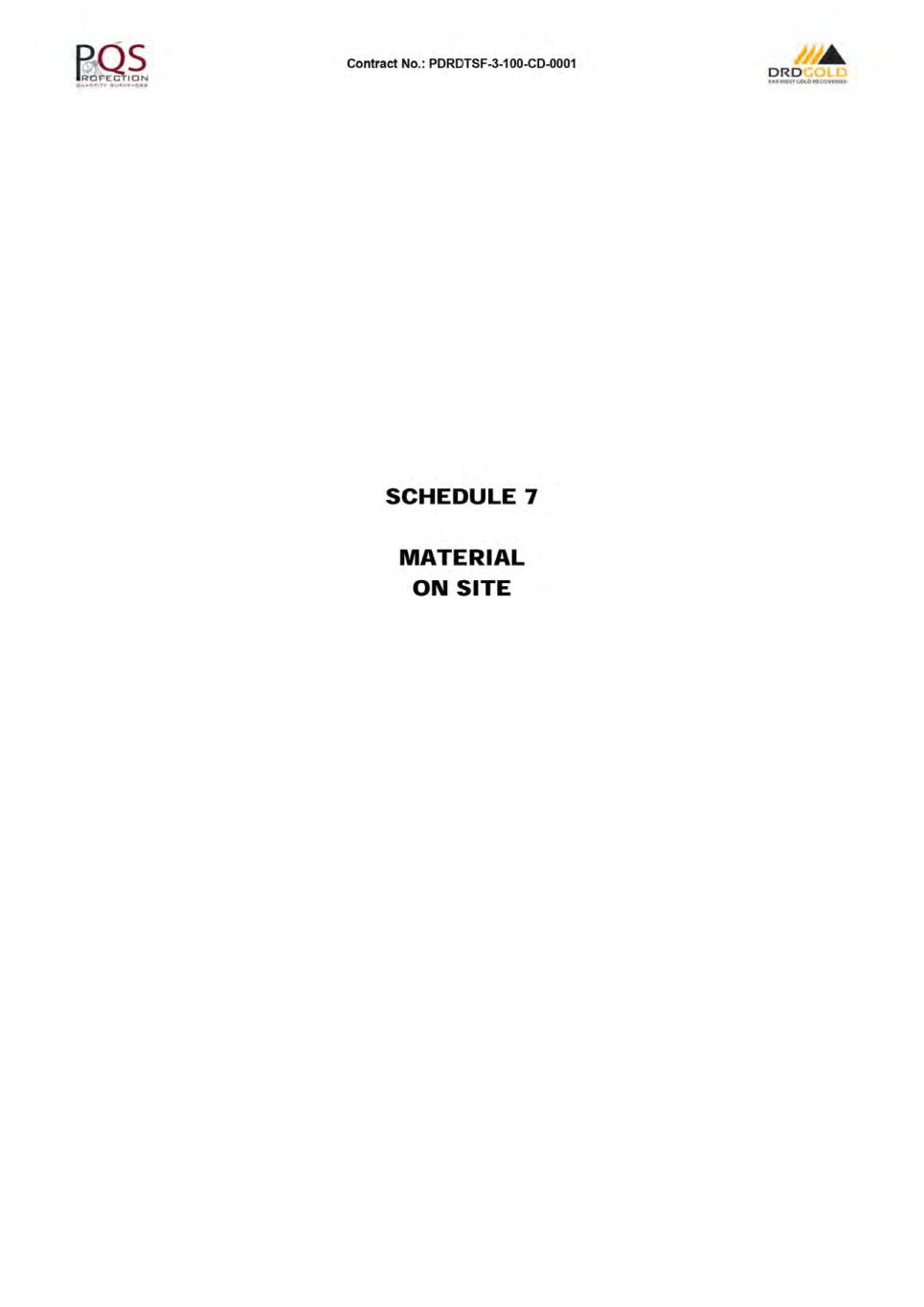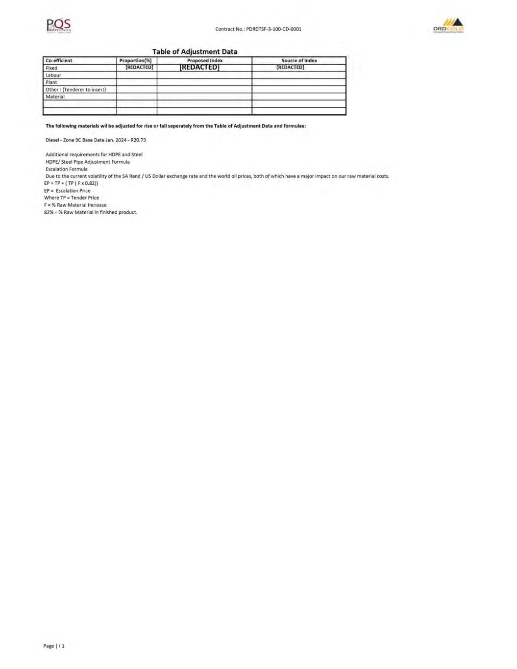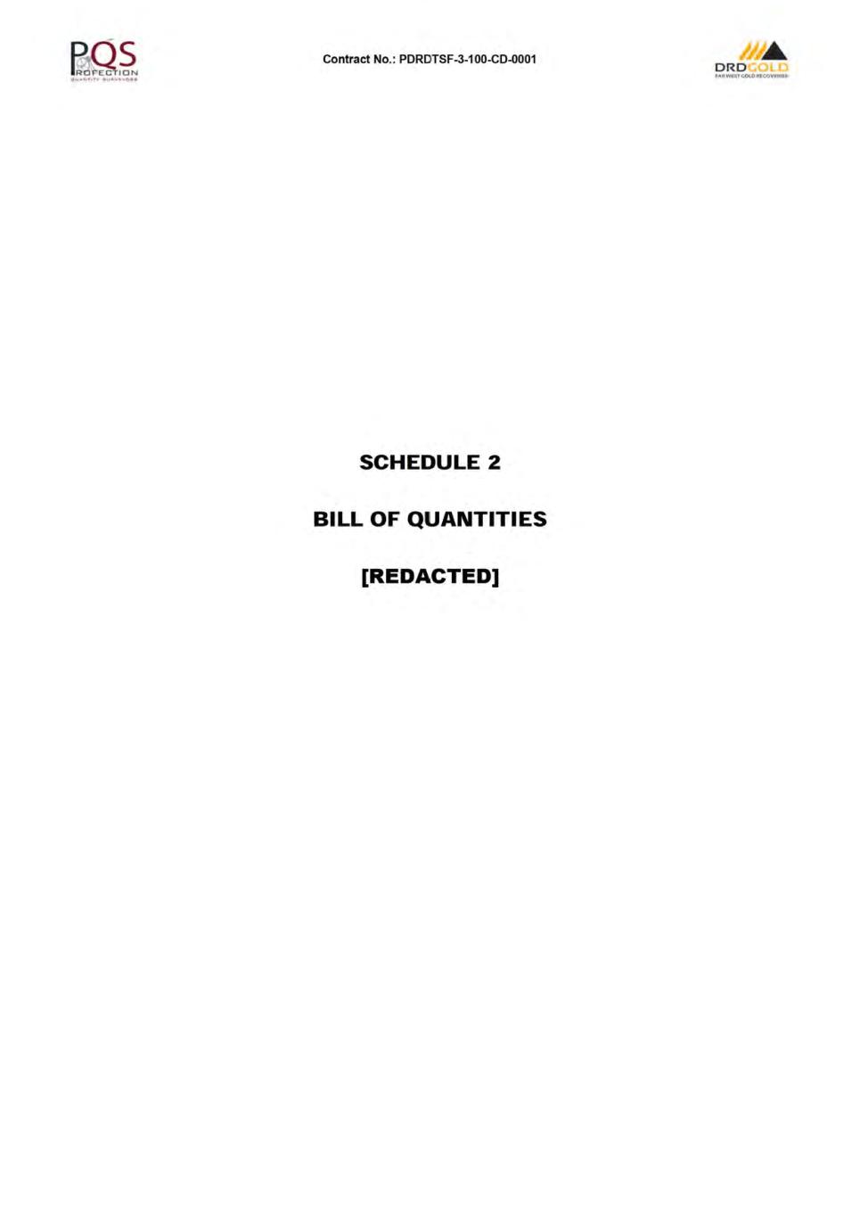 Contract No.: PDRDTSF-3-1 00-CD-0001 ORD f.-,R.WtsTc.ot.OIUCOVf:RIU CONTRACT INDEX PAGE NO. CONTRACT AGREEMENT .................................................................................................................................. A1 LETTER OF TENDER .......................................................................................................................................... B1 CONDITIONS OF CONTRACT ............................................................................................................................ C1 SPECIFICATIONS ............................................................................................................................................... D1 SCHEDULES: SCHEDULE 1 - PREAMBLE TO THE BILL OF QUANTITIES ............................................................................ E1 SCHEDULE 2 - BILL OF QUANTITIES .[REDACTED]........................................................................................ F1 SCHEDULE 3- DAYWORKS ....... ...................................................................................................................... G1 SCHEDULE 4- FOREIGN CURRENCY DETAILS ............................................................................................. H1 SCHEDULE 5- TABLE OF ADJUSTMENT DATA ....... ....................................................................................... 11 SCHEDULE 6- TRANSGRESSION PENAL TIES MATRIX ................................................................................. J1 SCHEDULE 7 - MATERIAL ON SITE ................................................................................................................ K1 SCHEDULE 8 - LINER WASTAGE PENAL TIES ............................................................................................... L 1 SCHEDULE 9- MATERIALS MARK-UP SLIDING SCALE ....... ....................................................................... M1 ADDENDAS: ADDENDA 1 - SITE INSPECTION CERTIFICATE ............................................................................................. N1 ADDENDA 2 - DRAWINGS ....... ......................................................................................................................... 01 ADDENDA 3 - PROFORMA DOCUMENTS ....... ................................................................................................ P1 ADDENDA 4 - EMPLOYER'S DOCUMENTS ..................................................................................................... Q1 ADDENDA 5- PROGRAMME ....... ..................................................................................................................... R1 ADDENDA 6 - GEOTECH REPORT.[REDACTED]. ............................................................................................. S1 ADDENDA 7 - DRAFT CQA .[REDACTED]. ......................................................................................................... T1 ADDENDA 8 - TECHNICAL INFORMATION .[REDACTED]. ............................................................................... U1 ADDENDA 9 - ENVIRONMENTAL INFORMATION .[REDACTED ...................................................................... V1