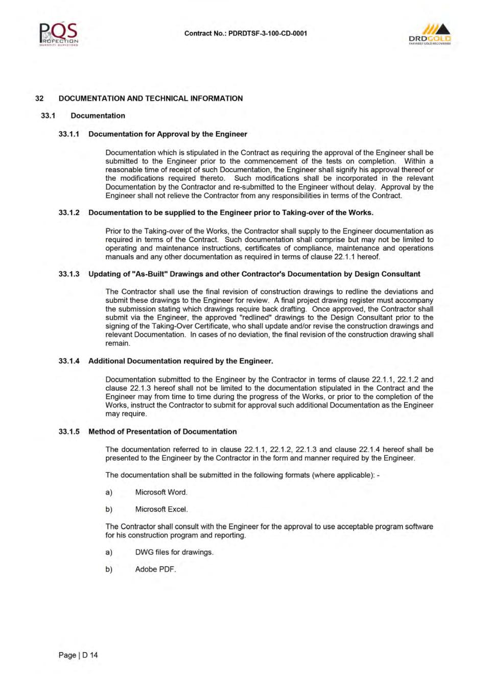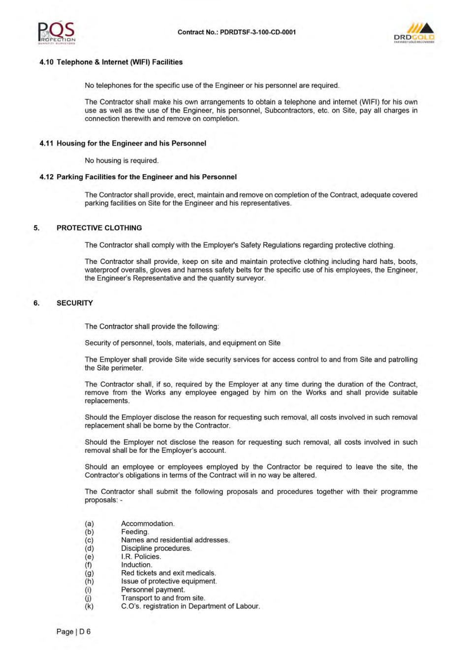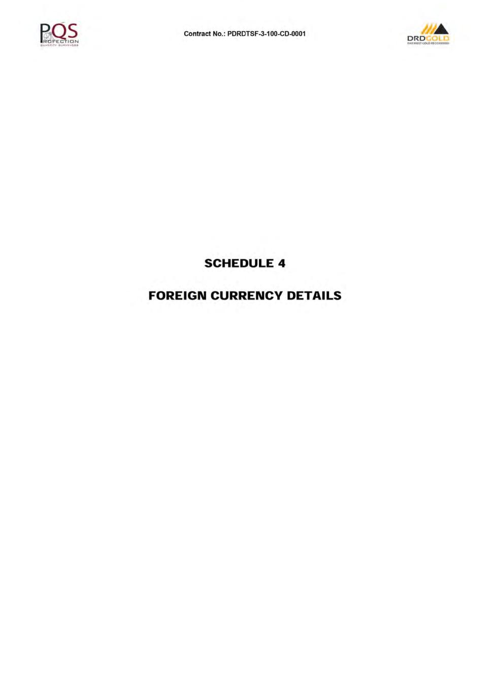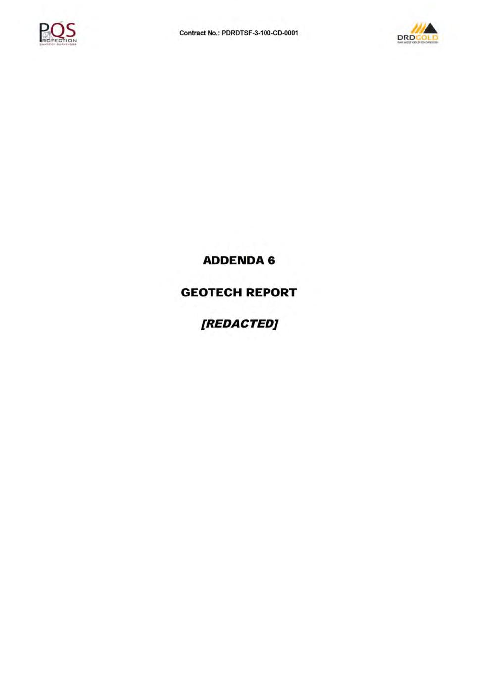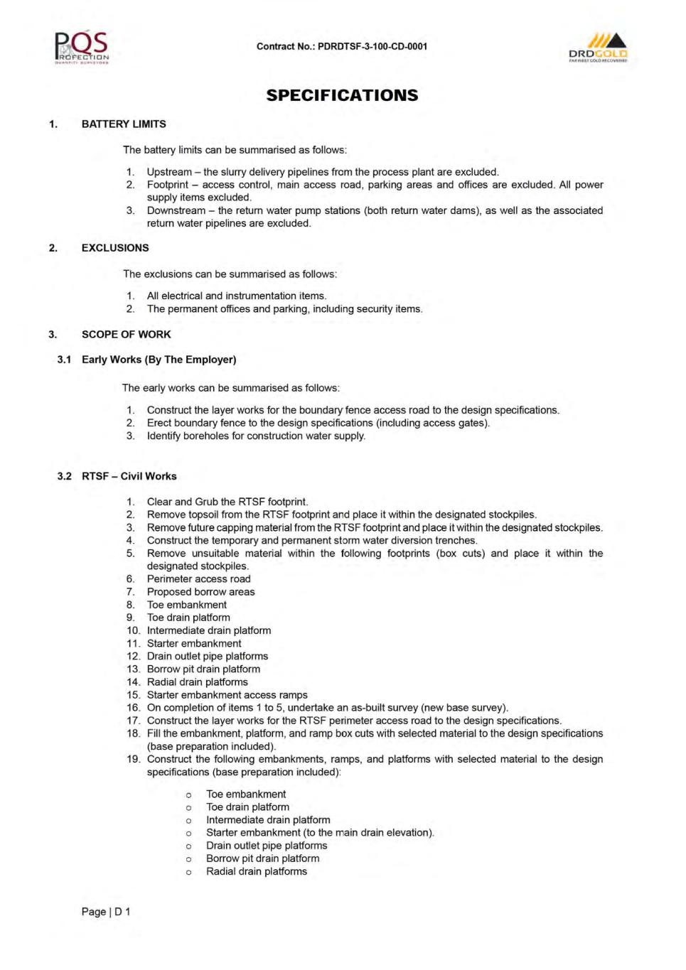 Contract No.: PDRDTSF-3-1 00-CD-0001 ORD f.-,R.WtsTc.ot.OIUCOVf:RIU CONTRACT INDEX PAGE NO. CONTRACT AGREEMENT .................................................................................................................................. A1 LETTER OF TENDER .......................................................................................................................................... B1 CONDITIONS OF CONTRACT ............................................................................................................................ C1 SPECIFICATIONS ............................................................................................................................................... D1 SCHEDULES: SCHEDULE 1 - PREAMBLE TO THE BILL OF QUANTITIES ............................................................................ E1 SCHEDULE 2 - BILL OF QUANTITIES .[REDACTED]........................................................................................ F1 SCHEDULE 3- DAYWORKS ....... ...................................................................................................................... G1 SCHEDULE 4- FOREIGN CURRENCY DETAILS ............................................................................................. H1 SCHEDULE 5- TABLE OF ADJUSTMENT DATA ....... ....................................................................................... 11 SCHEDULE 6- TRANSGRESSION PENAL TIES MATRIX ................................................................................. J1 SCHEDULE 7 - MATERIAL ON SITE ................................................................................................................ K1 SCHEDULE 8 - LINER WASTAGE PENAL TIES ............................................................................................... L 1 SCHEDULE 9- MATERIALS MARK-UP SLIDING SCALE ....... ....................................................................... M1 ADDENDAS: ADDENDA 1 - SITE INSPECTION CERTIFICATE ............................................................................................. N1 ADDENDA 2 - DRAWINGS ....... ......................................................................................................................... 01 ADDENDA 3 - PROFORMA DOCUMENTS ....... ................................................................................................ P1 ADDENDA 4 - EMPLOYER'S DOCUMENTS ..................................................................................................... Q1 ADDENDA 5- PROGRAMME ....... ..................................................................................................................... R1 ADDENDA 6 - GEOTECH REPORT.[REDACTED]. ............................................................................................. S1 ADDENDA 7 - DRAFT CQA .[REDACTED]. ......................................................................................................... T1 ADDENDA 8 - TECHNICAL INFORMATION .[REDACTED]. ............................................................................... U1 ADDENDA 9 - ENVIRONMENTAL INFORMATION .[REDACTED ...................................................................... V1