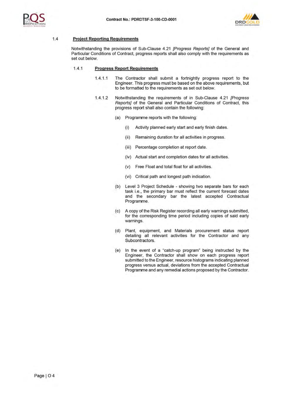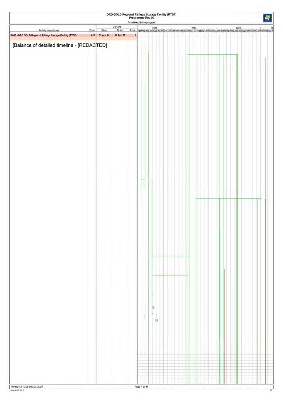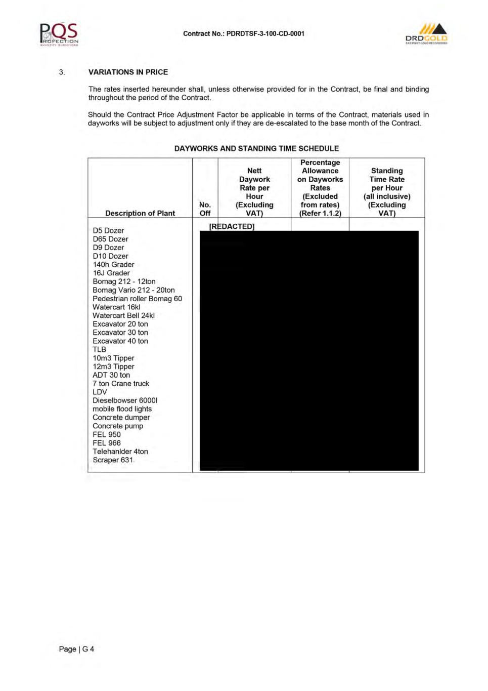 Contract No · PDRDTSF-3-100-0001 ORD ,.,.ffltuca,.auui- APPENDIX TO TENDER ITEM DESCRIPTION SUB- CLAUSE NO. ENTRY OF INFORMATION Amount of Performance Security 4.2 10% (Ten percent) of the Accepted Contract Amount excluding VAT. Progress Reports 4.2 1 A non-refundable amount of R [REDACTED] will be deducted from the value of the Payment Certificate as a penalty for a substantial non-compliance by the Contractor with the reporting obligations in Sub-Clause 4.2 1. Normal working hours will be: - a 9-hour shift and 6 day week with a long weekend at month end for dayshift operations. and Normal Working Hours 6.5 - 2 no x 9-hour shifts and 6 day week with a long weekend at month end for the dozing and loading of topsoil and overburden to stockpile. These shifts would typically be from 4:00 to 13 00 and 14:00 to 2 3:00. Commencement Date 8.1 In accordance with the proposed execution programme: 02 May 2 02 4. 1/7% (One seventh percent) of the remainder of the Contract Price Delay damages for the Works 8.7 & 14.15(b) excluding Section 1 for each day during which the Works or Sections thereof. remain incomplete after the due Time for Completion for the whole of the Works or Sections. Maximum amount of delay damages 8.7 10% (Ten percent) of the Contract Price excluding VAT. Percentage for adjustment of Provisional Sums 135(b) 15% Refer to Sub-Clause 13.8 [Adjustment for Changes in Cost] of the Adjustments for changes in Cost 13.8 Particular Conditions of Contract and Table of adjustment Data. 5% of the Accepted Contract Amount paid within 30 days of the Contractor providing a suitable Advance Payment Guarantee. Advance payment 14.2 repayments shall commence once the certified value of the Works (excluding the advance) exceeds 30% and shall be repaid in 8 equal installments. Currencies and proportions 14.2 South African Rand. Start repayment of Advance Payment 14.2 (a) When payments are..lillL_% of the Accepted Contract Amount Less Provisional Sums. Percentage reduction per Payment Certificates for 14.2 (b) ---1:illL_ % repayment of Advance Payment Application for Interim Payment 14.3 2oth day of each Certificate month. Percentage of retention 14.3 Retention guarantee of 5% (Five percent) of Contract Price, reduced to 2 .5 % (Two and a half percent) after the Taking Over Certificate has been issued. An additional R[REDACTED] shall be retained until all Contractor's Documentation as defined in Sub-Clause 1.1.6.1 and referred to in Sub-Clause 4.1 [Contractor's General Obligations] of the Conditions of Contract and clause 2 2 .1.9 [Retention on Documentation] of the Specifications, have been delivered and approved by the Engineer. Failure to provide replacement retention guarantee if required upon request for extention of the guarantee, shall result in actual retention money being deducted from the payment certificate. The Contractor will thereafter not be allowed to provide a replacement retention guarantee. Limit of retention money 14.3 5% (Five percent) of Contract Price and, if specified in the Specifications, an additional R[REDACTED] which shall be retained until such as built documentation as may be required under the Specifications have been delivered and approved by the Engineer. Plant and Materials for payment when Shipped en route to the 145(b) Not Applicable Site Plant and Materials for payment when delivered to the Site 14.5(c) Refer to Schedule 7 - MOS Minimum amount of interim Payment Certificates 14.6 [REDACTED] Time for Payment 14.7 30 (Thirty) Days after the Engineer issues the Interim Payment Certificate. Page I B 2