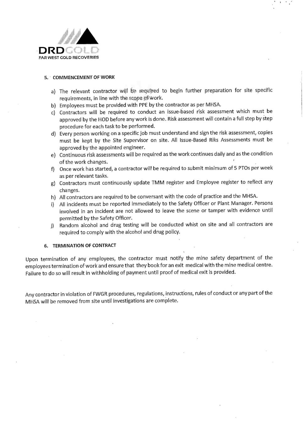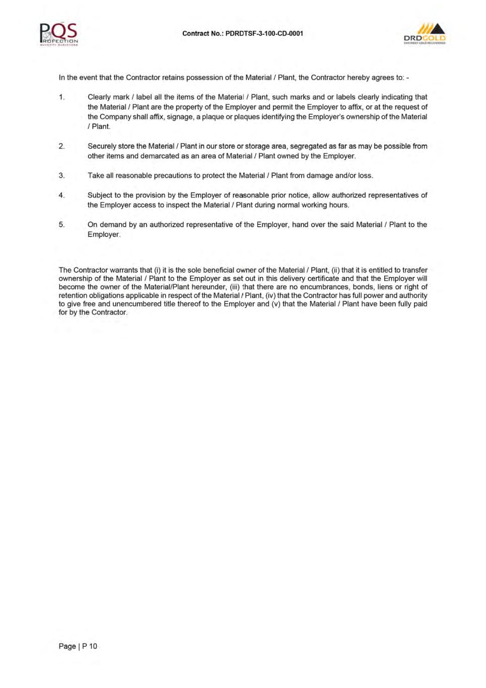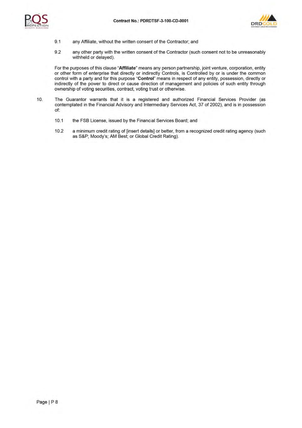 Contract No· PDRDTSF-3-100-0001 ORD ,.,.ffltuca,.auui- APPENDIX TO TENDER ITEM DESCRIPTION SUB- CLAUSE NO. ENTRY OF INFORMATION Far West Gold Recoveries (Ply) Ltd Constantia Office Park Employer's name and address 1.1.2.2 & 1.3 Cnr 14th Avenue and Hendrik Potgieter Road Cycad House, Building 17, Ground Floor Weltevreden Park 1709 Stefanutti Stocks Inland, a division of Stefanutti Stocks (Ply) Ltd Protec Park Contractor's name and address 1.1.2.3 & 1.3 Cnr Zuurfontein Avenue and Oranjerivier Drive Chloorkop Kempton Park 1619 Kevin Kruger Engineer's name and address 1.1.2.4 & 1.3 Driefontein Plant 2 Carletonville 2499 Pursuant to the provisions of Sub-Clause 3.2 [Delegation by the Engineer] of the Conditions of Contract the Engineer hereby assigns all Delegation by Engineer 3.2 his duties and delegates all his authority under and in terms of the Contract, including the authority to determine any matter in accordance with Sub-Clause 3.5 [Determinations] of the General Conditions of Contract to the person named in the Appendix. Base date: 1.1.3.1 01 April 2024. In accordance with proposed project execution programme: Time for Completion of the Works: 1.1.3.3 1021 Days Defects Notification Period 1.1.3.7 12 (Twelve) calendar months. Sections of the Works 1.1.5.6 Section 1: Description: Beneficial Occupation (600kUm) Time for Completion: 792 days Delay Damages: 1% per week of R[REDACTED] The delay damages will only become effective one month after the Time for Completion for the Section has elapsed. Project 1.1.6.12 DRDGOLD FWGR RTSF Project Located near Fochville, Gauteng Electronic Transmission Systems 1.3 Electronic ( e) mail in which case the date of receipt is defined as the date and time on which such email was transmitted: Contractor: Craig. Bowles@stefstocks.com Engineer: Kevin.Kruger@drdgold.com Engineer's Representatives: Gds@geotail.co.za Andre@tailings.co.za Hugo@profectionqs.co.za Governing Law 1.4 Laws of the Republic of South Africa Ruling language 1.4 English Language for communications 1.4 English Time for Access to the Site 2.1 In accordance with the proposed project execution programme: - 02 May 2024. Guillaume de Sward! Engineer's Representatives 3.2 Andre Richardt Hugo Hayes Page I BI