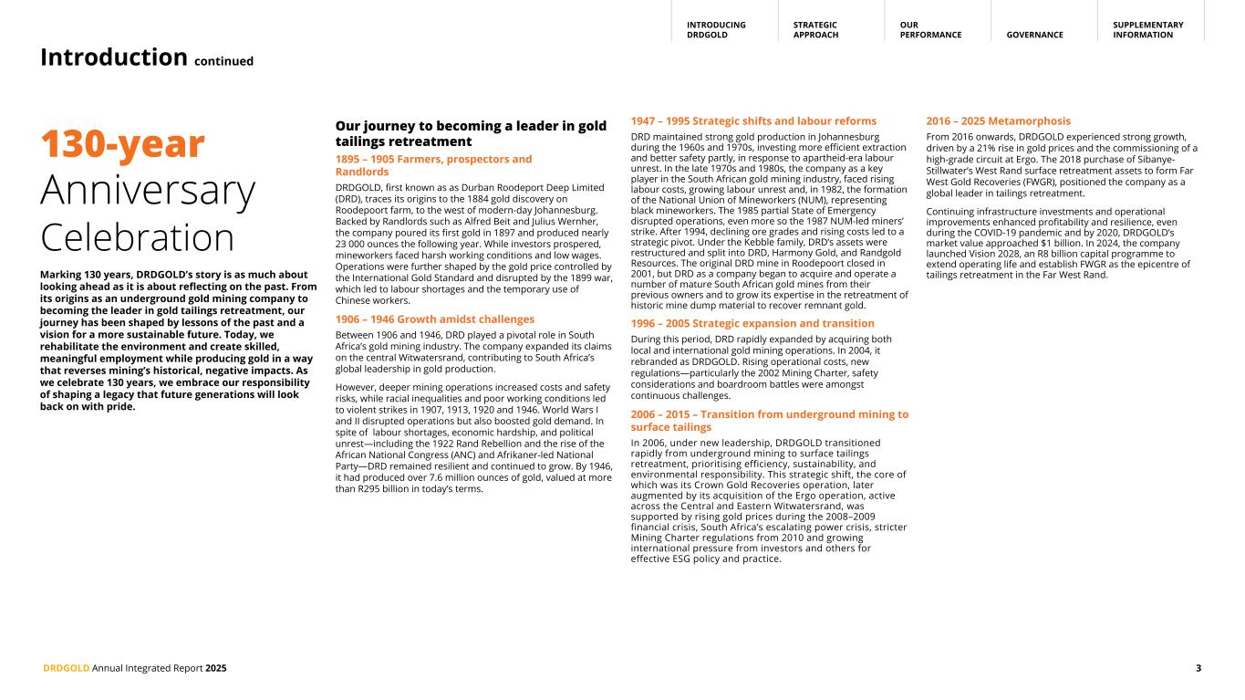 130-year Anniversary Celebration Marking 130 years, DRDGOLD’s story is as much about looking ahead as it is about reflecting on the past. From its origins as an underground gold mining company to becoming the leader in gold tailings retreatment, our journey has been shaped by lessons of the past and a vision for a more sustainable future. Today, we rehabilitate the environment and create skilled, meaningful employment while producing gold in a way that reverses mining’s historical, negative impacts. As we celebrate 130 years, we embrace our responsibility of shaping a legacy that future generations will look back on with pride. Our journey to becoming a leader in gold tailings retreatment 1895 – 1905 Farmers, prospectors and Randlords DRDGOLD, first known as as Durban Roodeport Deep Limited (DRD), traces its origins to the 1884 gold discovery on Roodepoort farm, to the west of modern-day Johannesburg. Backed by Randlords such as Alfred Beit and Julius Wernher, the company poured its first gold in 1897 and produced nearly 23 000 ounces the following year. While investors prospered, mineworkers faced harsh working conditions and low wages. Operations were further shaped by the gold price controlled by the International Gold Standard and disrupted by the 1899 war, which led to labour shortages and the temporary use of Chinese workers. 1906 – 1946 Growth amidst challenges Between 1906 and 1946, DRD played a pivotal role in South Africa’s gold mining industry. The company expanded its claims on the central Witwatersrand, contributing to South Africa’s global leadership in gold production. However, deeper mining operations increased costs and safety risks, while racial inequalities and poor working conditions led to violent strikes in 1907, 1913, 1920 and 1946. World Wars I and II disrupted operations but also boosted gold demand. In spite of labour shortages, economic hardship, and political unrest—including the 1922 Rand Rebellion and the rise of the African National Congress (ANC) and Afrikaner-led National Party—DRD remained resilient and continued to grow. By 1946, it had produced over 7.6 million ounces of gold, valued at more than R295 billion in today’s terms. 1947 – 1995 Strategic shifts and labour reforms DRD maintained strong gold production in Johannesburg during the 1960s and 1970s, investing more efficient extraction and better safety partly, in response to apartheid-era labour unrest. In the late 1970s and 1980s, the company as a key player in the South African gold mining industry, faced rising labour costs, growing labour unrest and, in 1982, the formation of the National Union of Mineworkers (NUM), representing black mineworkers. The 1985 partial State of Emergency disrupted operations, even more so the 1987 NUM-led miners’ strike. After 1994, declining ore grades and rising costs led to a strategic pivot. Under the Kebble family, DRD’s assets were restructured and split into DRD, Harmony Gold, and Randgold Resources. The original DRD mine in Roodepoort closed in 2001, but DRD as a company began to acquire and operate a number of mature South African gold mines from their previous owners and to grow its expertise in the retreatment of historic mine dump material to recover remnant gold. 1996 – 2005 Strategic expansion and transition During this period, DRD rapidly expanded by acquiring both local and international gold mining operations. In 2004, it rebranded as DRDGOLD. Rising operational costs, new regulations—particularly the 2002 Mining Charter, safety considerations and boardroom battles were amongst continuous challenges. 2006 – 2015 – Transition from underground mining to surface tailings In 2006, under new leadership, DRDGOLD transitioned rapidly from underground mining to surface tailings retreatment, prioritising efficiency, sustainability, and environmental responsibility. This strategic shift, the core of which was its Crown Gold Recoveries operation, later augmented by its acquisition of the Ergo operation, active across the Central and Eastern Witwatersrand, was supported by rising gold prices during the 2008–2009 financial crisis, South Africa’s escalating power crisis, stricter Mining Charter regulations from 2010 and growing international pressure from investors and others for effective ESG policy and practice. 2016 – 2025 Metamorphosis From 2016 onwards, DRDGOLD experienced strong growth, driven by a 21% rise in gold prices and the commissioning of a high-grade circuit at Ergo. The 2018 purchase of Sibanye- Stillwater’s West Rand surface retreatment assets to form Far West Gold Recoveries (FWGR), positioned the company as a global leader in tailings retreatment. Continuing infrastructure investments and operational improvements enhanced profitability and resilience, even during the COVID-19 pandemic and by 2020, DRDGOLD’s market value approached $1 billion. In 2024, the company launched Vision 2028, an R8 billion capital programme to extend operating life and establish FWGR as the epicentre of tailings retreatment in the Far West Rand. INTRODUCING DRDGOLD STRATEGIC APPROACH OUR PERFORMANCE GOVERNANCE SUPPLEMENTARY INFORMATION Introduction continued DRDGOLD Annual Integrated Report 2025 3