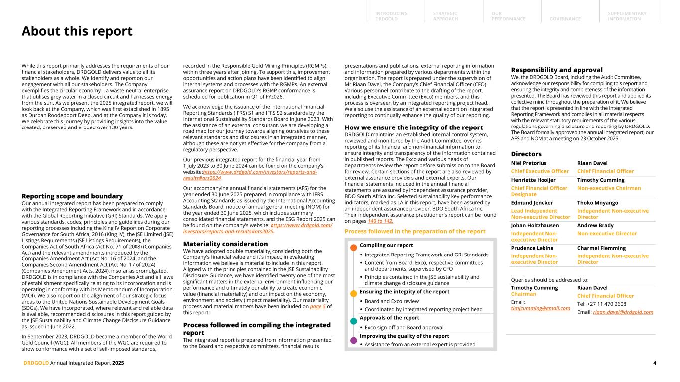 While this report primarily addresses the requirements of our financial stakeholders, DRDGOLD delivers value to all its stakeholders as a whole. We identify and report on our engagement with all our stakeholders. The Company exemplifies the circular economy—a waste-neutral enterprise that utilises grey water in a closed circuit and harnesses energy from the sun. As we present the 2025 integrated report, we will look back at the Company, which was first established in 1895 as Durban Roodepoort Deep, and at the Company it is today. We celebrate this journey by providing insights into the value created, preserved and eroded over 130 years. Reporting scope and boundary Our annual integrated report has been prepared to comply with the Integrated Reporting Framework and in accordance with the Global Reporting Initiative (GRI) Standards. We apply various standards, codes, principles and guidelines during our reporting processes including the King IV Report on Corporate Governance for South Africa, 2016 (King IV), the JSE Limited (JSE) Listings Requirements (JSE Listings Requirements), the Companies Act of South Africa (Act No. 71 of 2008) (Companies Act) and the relevant amendments introduced by the Companies Amendment Act (Act No. 16 of 2024) and the Companies Second Amendment Act (Act No. 17 of 2024) (Companies Amendment Acts, 2024), insofar as promulgated. DRDGOLD is in compliance with the Companies Act and all laws of establishment specifically relating to its incorporation and is operating in conformity with its Memorandum of Incorporation (MOI). We also report on the alignment of our strategic focus areas to the United Nations Sustainable Development Goals (SDGs). We have incorporated, where relevant and reliable data is available, recommended disclosures in this report guided by the JSE Sustainability and Climate Change Disclosure Guidance as issued in June 2022. In September 2023, DRDGOLD became a member of the World Gold Council (WGC). All members of the WGC are required to show conformance with a set of self-imposed standards, recorded in the Responsible Gold Mining Principles (RGMPs), within three years after joining. To support this, improvement opportunities and action plans have been identified to align internal systems and processes with the RGMPs. An external assurance report on DRDGOLD's RGMP conformance is scheduled for publication in Q1 of FY2026. We acknowledge the issuance of the International Financial Reporting Standards (IFRS) S1 and IFRS S2 standards by the International Sustainability Standards Board in June 2023. With the assistance of an external consultant, we are developing a road map for our journey towards aligning ourselves to these relevant standards and disclosures in an integrated manner, although these are not yet effective for the company from a regulatory perspective. Our previous integrated report for the financial year from 1 July 2023 to 30 June 2024 can be found on the company’s website:https://www.drdgold.com/investors/reports-and- results#ars2024 Our accompanying annual financial statements (AFS) for the year ended 30 June 2025 prepared in compliance with IFRS Accounting Standards as issued by the International Accounting Standards Board, notice of annual general meeting (NOM) for the year ended 30 June 2025, which includes summary consolidated financial statements, and the ESG Report 2025 can be found on the company’s website: https://www.drdgold.com/ investors/reports-and-results#ars2025. Materiality consideration We have adopted double materiality, considering both the Company's financial value and it's impact, in evaluating information we believe is material to include in this report. Aligned with the principles contained in the JSE Sustainability Disclosure Guidance, we have identified twenty one of the most significant matters in the external environment influencing our performance and ultimately our ability to create economic value (financial materiality) and our impact on the economy, environment and society (impact materiality). Our materiality process and material matters have been included on page 5 of this report. Process followed in compiling the integrated report The integrated report is prepared from information presented to the Board and respective committees, financial results presentations and publications, external reporting information and information prepared by various departments within the organisation. The report is prepared under the supervision of Mr Riaan Davel, the Company’s Chief Financial Officer (CFO). Various personnel contribute to the drafting of the report, including Executive Committee (Exco) members, and this process is overseen by an integrated reporting project head. We also use the assistance of an external expert on integrated reporting to continually enhance the quality of our reporting. How we ensure the integrity of the report DRDGOLD maintains an established internal control system, reviewed and monitored by the Audit Committee, over its reporting of its financial and non-financial information to ensure integrity and transparency of the information contained in published reports. The Exco and various heads of departments review the report before submission to the Board for review. Certain sections of the report are also reviewed by external assurance providers and external experts. Our financial statements included in the annual financial statements are assured by independent assurance provider, BDO South Africa Inc. Selected sustainability key performance indicators, marked as LA in this report, have been assured by an independent assurance provider, BDO South Africa Inc. Their independent assurance practitioner's report can be found on pages 140 to 142. Process followed in the preparation of the report Compiling our report • Integrated Reporting Framework and GRI Standards • Content from Board, Exco, respective committees and departments, supervised by CFO • Principles contained in the JSE