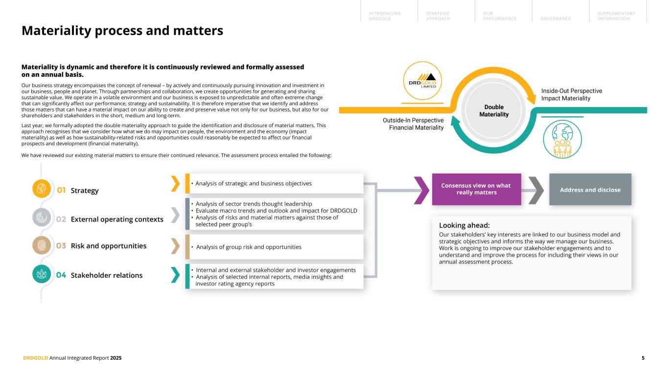 Materiality is dynamic and therefore it is continuously reviewed and formally assessed on an annual basis. Our business strategy encompasses the concept of renewal – by actively and continuously pursuing innovation and investment in our business, people and planet. Through partnerships and collaboration, we create opportunities for generating and sharing sustainable value. We operate in a volatile environment and our business is exposed to unpredictable and often extreme change that can significantly affect our performance, strategy and sustainability. It is therefore imperative that we identify and address those matters that can have a material impact on our ability to create and preserve value not only for our business, but also for our shareholders and stakeholders in the short, medium and long-term. Last year, we formally adopted the double materiality approach to guide the identification and disclosure of material matters. This approach recognises that we consider how what we do may impact on people, the environment and the economy (impact materiality) as well as how sustainability-related risks and opportunities could reasonably be expected to affect our financial prospects and development (financial materiality). We have reviewed our existing material matters to ensure their continued relevance. The assessment process entailed the following: INTRODUCING DRDGOLD STRATEGIC APPROACH OUR PERFORMANCE GOVERNANCE SUPPLEMENTARY INFORMATION Materiality process and matters DRDGOLD Annual Integrated Report 2025 5