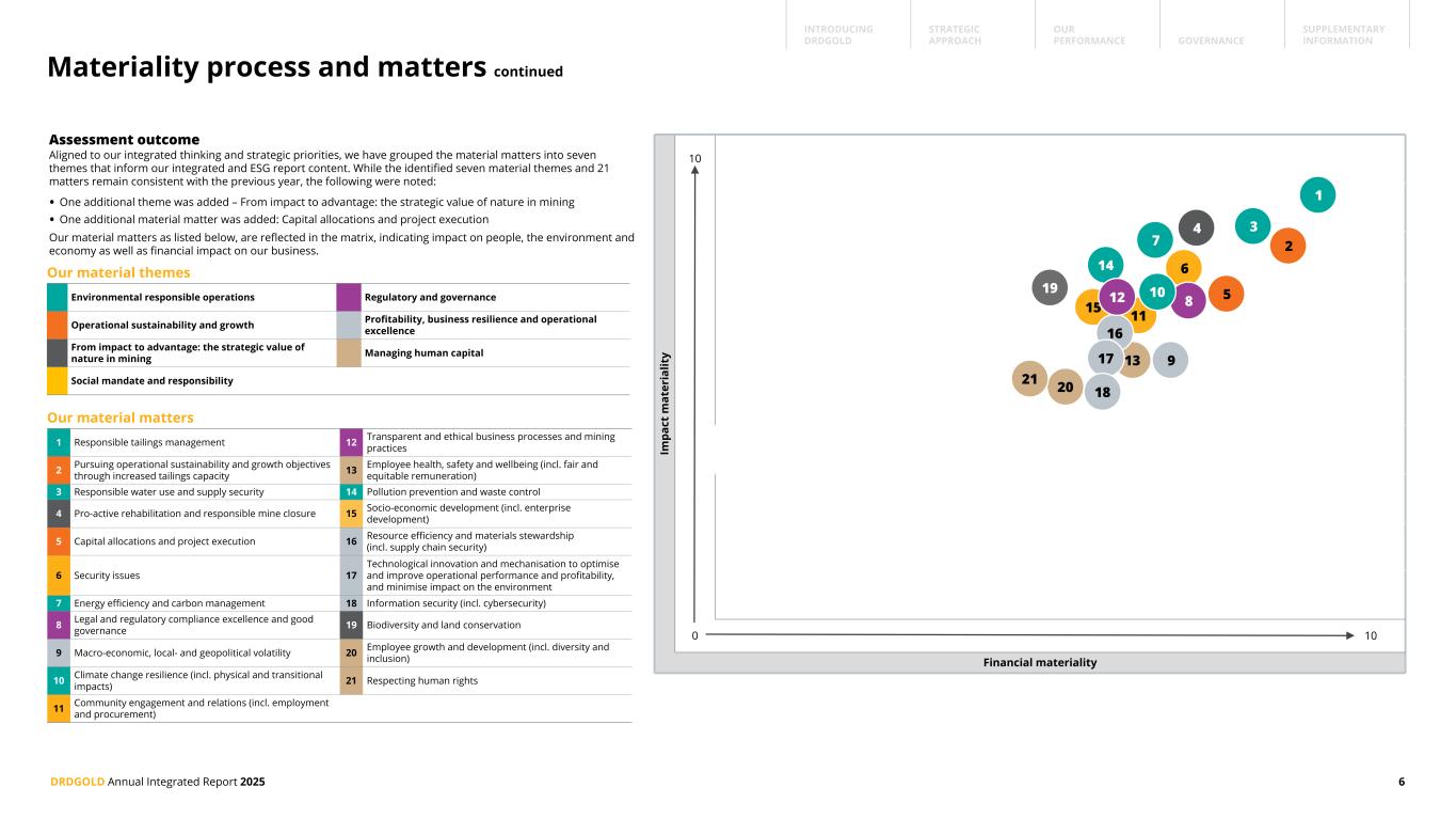 Our material themes Environmental responsible operations Regulatory and governance Operational sustainability and growth Profitability, business resilience and operational excellence From impact to advantage: the strategic value of nature in mining Managing human capital Social mandate and responsibility Our material matters 1 Responsible tailings management 12 Transparent and ethical business processes and mining practices 2 Pursuing operational sustainability and growth objectives through increased tailings capacity 13 Employee health, safety and wellbeing (incl. fair and equitable remuneration) 3 Responsible water use and supply security 14 Pollution prevention and waste control 4 Pro-active rehabilitation and responsible mine closure 15 Socio-economic development (incl. enterprise development) 5 Capital allocations and project execution 16 Resource efficiency and materials stewardship (incl. supply chain security) 6 Security issues 17 Technological innovation and mechanisation to optimise and improve operational performance and profitability, and minimise impact on the environment 7 Energy efficiency and carbon management 18 Information security (incl. cybersecurity) 8 Legal and regulatory compliance excellence and good governance 19 Biodiversity and land conservation 9 Macro-economic, local- and geopolitical volatility 20 Employee growth and development (incl. diversity and inclusion) 10 Climate change resilience (incl. physical and transitional impacts) 21 Respecting human rights 11 Community engagement and relations (incl. employment and procurement) INTRODUCING DRDGOLD STRATEGIC APPROACH OUR PERFORMANCE GOVERNANCE SUPPLEMENTARY INFORMATION Materiality process and matters continued DRDGOLD Annual Integrated Report 2025 6 Im pa ct m at er ia lit y 10 0 10 Financial materiality 1 3 7 14 5 2 4 6 8 9 11 13 15 16 17 182021 19 12 10 Assessment outcome Aligned to our integrated thinking and strategic priorities, we have grouped the material matters into seven themes that inform our integrated and ESG report content. While the identified seven material themes and 21 matters remain consistent with the previous year, the following were noted: • One additional theme was added – From impact to advantage: the strategic value of nature in mining • One additional material matter was added: Capital allocations and project execution Our material matters as listed below, are reflected in the matrix, indicating impact on people, the environment and economy as well as financial impact on our business.