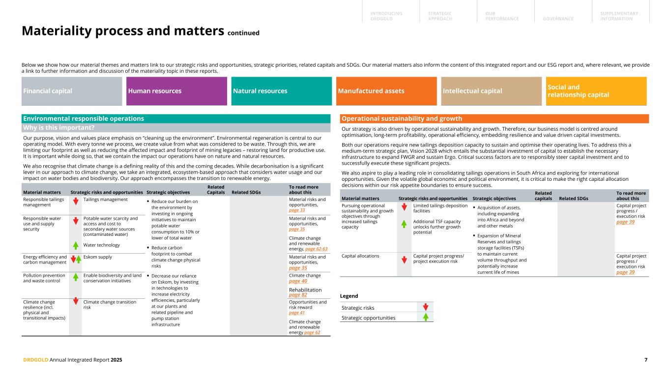 Below we show how our material themes and matters link to our strategic risks and opportunities, strategic priorities, related capitals and SDGs. Our material matters also inform the content of this integrated report and our ESG report and, where relevant, we provide a link to further information and discussion of the materiality topic in these reports. Financial capital Human resources Natural resources Manufactured assets Intellectual capital Social and relationship capital Environmental responsible operations Why is this important? Our purpose, vision and values place emphasis on “cleaning up the environment”. Environmental regeneration is central to our operating model. With every tonne we process, we create value from what was considered to be waste. Through this, we are limiting our footprint as well as reducing the affected impact and footprint of mining legacies – restoring land for productive use. It is important while doing so, that we contain the impact our operations have on nature and natural resources. We also recognise that climate change is a defining reality of this and the coming decades. While decarbonisation is a significant lever in our approach to climate change, we take an integrated, ecosystem-based approach that considers water usage and our impact on water bodies and biodiversity. Our approach encompasses the transition to renewable energy. Material matters Strategic risks and opportunities Strategic objectives Related Capitals Related SDGs To read more about this Responsible tailings management Tailings management • Reduce our burden on the environment by investing in ongoing initiatives to maintain potable water consumption to 10% or lower of total water • Reduce carbon footprint to combat climate change physical risks • Decrease our reliance on Eskom, by investing in technologies to increase electricity efficiencies, particularly at our plants and related pipeline and pump station infrastructure Material risks and opportunities, page 33 Responsible water use and supply security Potable water scarcity and access and cost to secondary water sources (contaminated water) Water technology Material risks and opportunities, page 35 Climate change and renewable energy, page 62-63 Energy efficiency and carbon management Eskom supply Material risks and opportunities, page 35 Pollution prevention and waste control Enable biodiversity and land conservation initiatives Climate change page 40 Rehabilitation page 82 Climate change resilience (incl. physical and transitional impacts) Climate change transition risk Opportunities and risk reward page 41 Climate change and renewable energy page 62 Operational sustainability and growth Our strategy is also driven by operational sustainability and growth. Therefore, our business model is centred around optimisation, long-term profitability, operational efficiency, embedding resilience and value driven capital investments. Both our operations require new tailings deposition capacity to sustain and optimise their operating lives. To address this a medium-term strategic plan, Vision 2028 which entails the substantial investment of capital to establish the necessary infrastructure to expand FWGR and sustain Ergo. Critical success factors are to responsibly steer capital investment and to successfully execute these significant projects. We also aspire to play a leading role in consolidating tailings operations in South Africa and exploring for international opportunities. Given the volatile global economic and political environment, it is critical to make the right capital allocation decisions within our risk appetite boundaries to ensure success. Material matters Strategic risks and opportunities Strategic objectives Related capitals Related SDGs To read more about this Pursuing operational sustainability and growth objectives through increased tailings capacity Limited tailings deposition facilities Additional TSF capacity unlocks further growth potential • Acquisition of assets, including expanding into Africa and beyond and other metals • Expansion of Mineral Reserves and tailings storage facilities (TSFs) to maintain current volume throughput and potentially increase current life of mines Capital project progress / execution risk page 39 Capital allocations Capital project progress/ project execution risk Capital project progress / execution risk page 39 Legend Strategic risks Strategic opportunities INTRODUCING DRDGOLD STRATEGIC APPROACH OUR PERFORMANCE GOVERNANCE SUPPLEMENTARY INFORMATION Materiality process and matters continued DRDGOLD Annual Integrated Report 2025 7