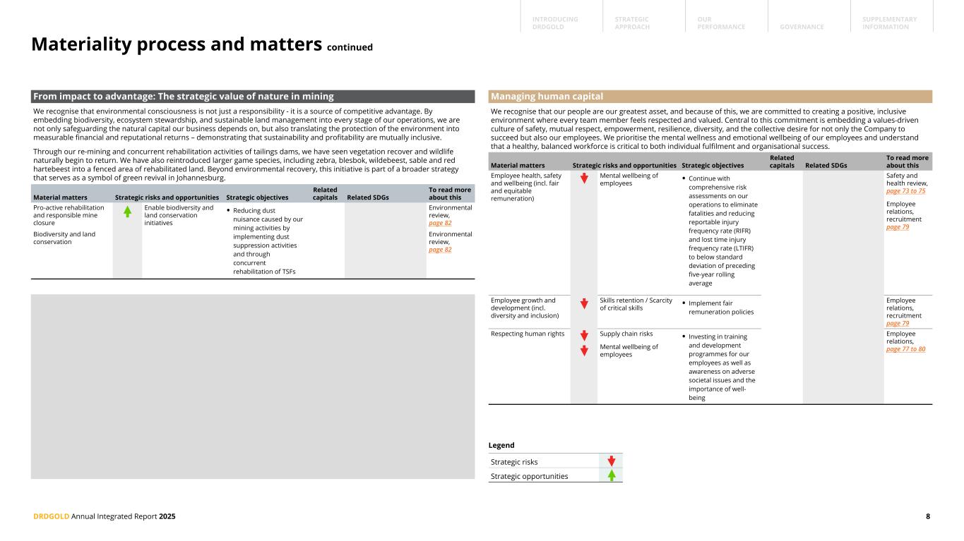 From impact to advantage: The strategic value of nature in mining We recognise that environmental consciousness is not just a responsibility - it is a source of competitive advantage. By embedding biodiversity, ecosystem stewardship, and sustainable land management into every stage of our operations, we are not only safeguarding the natural capital our business depends on, but also translating the protection of the environment into measurable financial and reputational returns – demonstrating that sustainability and profitability are mutually inclusive. Through our re-mining and concurrent rehabilitation activities of tailings dams, we have seen vegetation recover and wildlife naturally begin to return. We have also reintroduced larger game species, including zebra, blesbok, wildebeest, sable and red hartebeest into a fenced area of rehabilitated land. Beyond environmental recovery, this initiative is part of a broader strategy that serves as a symbol of green revival in Johannesburg. Material matters Strategic risks and opportunities Strategic objectives Related capitals Related SDGs To read more about this Pro-active rehabilitation and responsible mine closure Enable biodiversity and land conservation initiatives • Reducing dust nuisance caused by our mining activities by implementing dust suppression activities and through concurrent rehabilitation of TSFs Environmental review, page 82 Biodiversity and land conservation Environmental review, page 82 Managing human capital We recognise that our people are our greatest asset, and because of this, we are committed to creating a positive, inclusive environment where every team member feels respected and valued. Central to this commitment is embedding a values-driven culture of safety, mutual respect, empowerment, resilience, diversity, and the collective desire for not only the Company to succeed but also our employees. We prioritise the mental wellness and emotional wellbeing of our employees and understand that a healthy, balanced workforce is critical to both individual fulfilment and organisational success. Material matters Strategic risks and opportunities Strategic objectives Related capitals Related SDGs To read more about this Employee health, safety and wellbeing (incl. fair and equitable remuneration) Mental wellbeing of employees • Continue with comprehensive risk assessments on our operations to eliminate fatalities and reducing reportable injury frequency rate (RIFR) and lost time injury frequency rate (LTIFR) to below standard deviation of preceding five-year rolling average Safety and health review, page 73 to 75 Employee relations, recruitment page 79 Employee growth and development (incl. diversity and inclusion) Skills retention / Scarcity of critical skills • Implement fair remuneration policies Employee relations, recruitment page 79 Respecting human rights Supply chain risks Mental wellbeing of employees • Investing in training and development programmes for our employees as well as awareness on adverse societal issues and the importance of well- being Employee relations, page 77 to 80 Legend Strategic risks Strategic opportunities INTRODUCING DRDGOLD STRATEGIC APPROACH OUR PERFORMANCE GOVERNANCE SUPPLEMENTARY INFORMATION Materiality process and matters continued DRDGOLD Annual Integrated Report 2025 8
