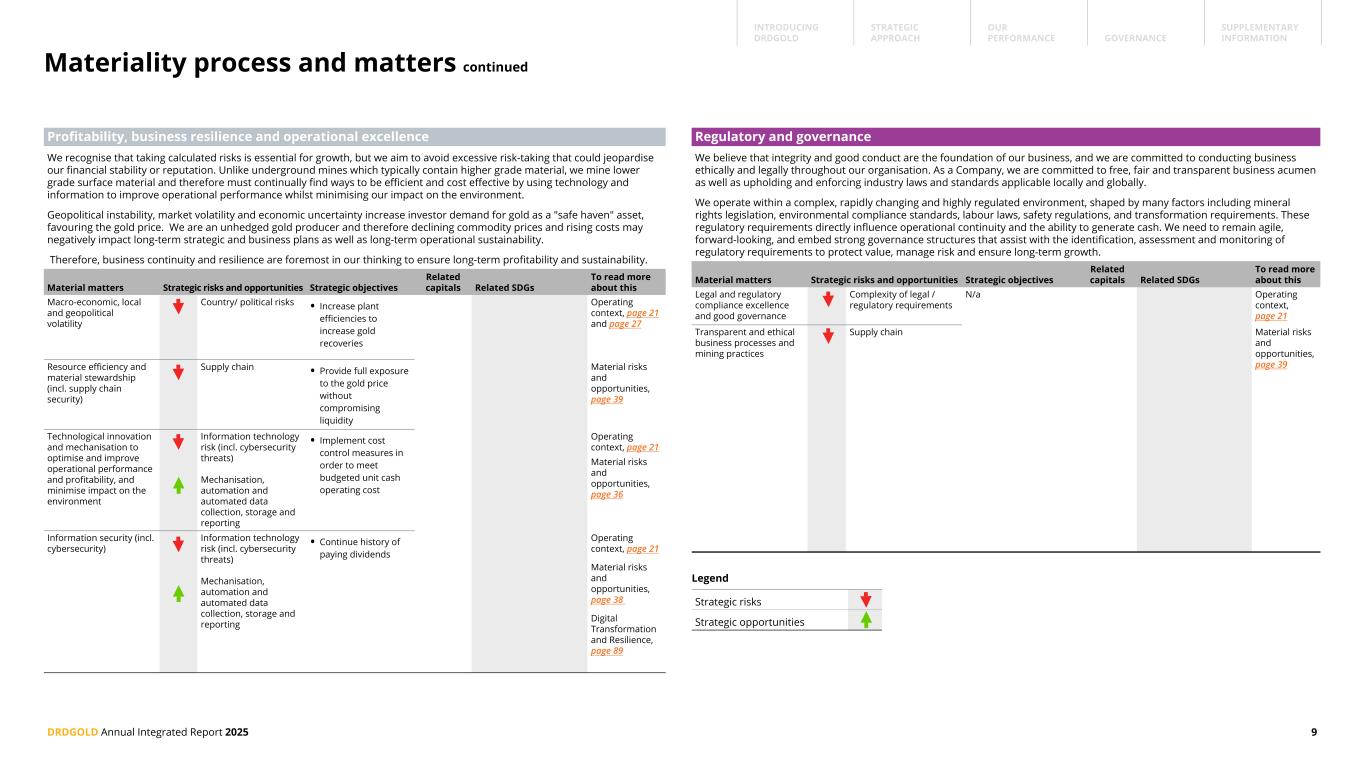 Profitability, business resilience and operational excellence We recognise that taking calculated risks is essential for growth, but we aim to avoid excessive risk-taking that could jeopardise our financial stability or reputation. Unlike underground mines which typically contain higher grade material, we mine lower grade surface material and therefore must continually find ways to be efficient and cost effective by using technology and information to improve operational performance whilst minimising our impact on the environment. Geopolitical instability, market volatility and economic uncertainty increase investor demand for gold as a "safe haven" asset, favouring the gold price. We are an unhedged gold producer and therefore declining commodity prices and rising costs may negatively impact long-term strategic and business plans as well as long-term operational sustainability. Therefore, business continuity and resilience are foremost in our thinking to ensure long-term profitability and sustainability. Material matters Strategic risks and opportunities Strategic objectives Related capitals Related SDGs To read more about this Macro-economic, local and geopolitical volatility Country/ political risks • Increase plant efficiencies to increase gold recoveries Operating context, page 21 and page 27 Resource efficiency and material stewardship (incl. supply chain security) Supply chain • Provide full exposure to the gold price without compromising liquidity Material risks and opportunities, page 39 Technological innovation and mechanisation to optimise and improve operational performance and profitability, and minimise impact on the environment Information technology risk (incl. cybersecurity threats) Mechanisation, automation and automated data collection, storage and reporting • Implement cost control measures in order to meet budgeted unit cash operating cost Operating context, page 21 Material risks and opportunities, page 36 Information security (incl. cybersecurity) Information technology risk (incl. cybersecurity threats) Mechanisation, automation and automated data collection, storage and reporting • Continue history of paying dividends Operating context, page 21 Material risks and opportunities, page 38 Digital Transformation and Resilience, page 89 Regulatory and governance We believe that integrity and good conduct are the foundation of our business, and we are committed to conducting business ethically and legally throughout our organisation. As a Company, we are committed to free, fair and transparent business acumen as well as upholding and enforcing industry laws and standards applicable locally and globally. We operate within a complex, rapidly changing and highly regulated environment, shaped by many factors including mineral rights legislation, environmental compliance standards, labour laws, safety regulations, and transformation requirements. These regulatory requirements directly influence operational continuity and the ability to generate cash. We need to remain agile, forward-looking, and embed strong governance structures that assist with the identification, assessment and monitoring of regulatory requirements to protect value, manage risk and ensure long-term growth. Material matters Strategic risks and opportunities Strategic objectives Related capitals Related SDGs To read more about this Legal and regulatory compliance excellence and good governance Complexity of legal / regulatory requirements N/a Operating context, page 21 Transparent and ethical business processes and mining practices Supply chain Material risks and opportunities, page 39 Legend Strategic risks Strategic opportunities INTRODUCING DRDGOLD STRATEGIC APPROACH OUR PERFORMANCE GOVERNANCE SUPPLEMENTARY INFORMATION Materiality process and matters continued DRDGOLD Annual Integrated Report 2025 9