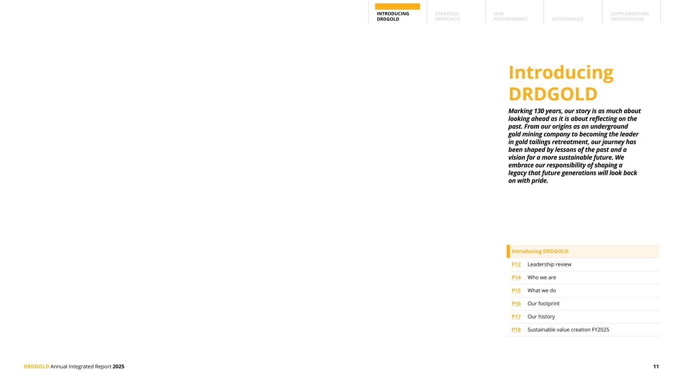 Introducing DRDGOLD Marking 130 years, our story is as much about looking ahead as it is about reflecting on the past. From our origins as an underground gold mining company to becoming the leader in gold tailings retreatment, our journey has been shaped by lessons of the past and a vision for a more sustainable future. We embrace our responsibility of shaping a legacy that future generations will look back on with pride. Introducing DRDGOLD P12 Leadership review P14 Who we are P15 What we do P16 Our footprint P17 Our history P18 Sustainable value creation FY2025 INTRODUCING DRDGOLD STRATEGIC APPROACH OUR PERFORMANCE GOVERNANCE SUPPLEMENTARY INFORMATION DRDGOLD Annual Integrated Report 2025 11