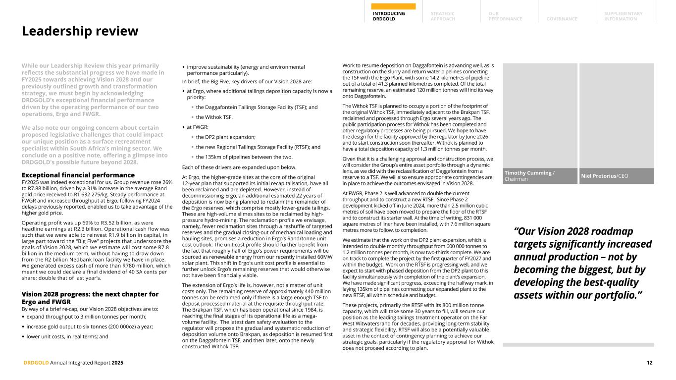 While our Leadership Review this year primarily reflects the substantial progress we have made in FY2025 towards achieving Vision 2028 and our previously outlined growth and transformation strategy, we must begin by acknowledging DRDGOLD’s exceptional financial performance driven by the operating performance of our two operations, Ergo and FWGR. We also note our ongoing concern about certain proposed legislative challenges that could impact our unique position as a surface retreatment specialist within South Africa’s mining sector. We conclude on a positive note, offering a glimpse into DRDGOLD's possible future beyond 2028. Exceptional financial performance FY2025 was indeed exceptional for us. Group revenue rose 26% to R7.88 billion, driven by a 31% increase in the average Rand gold price received to R1 632 275/kg. Steady performance at FWGR and increased throughput at Ergo, following FY2024 delays previously reported, enabled us to take advantage of the higher gold price. Operating profit was up 69% to R3.52 billion, as were headline earnings at R2.3 billion. Operational cash flow was such that we were able to reinvest R1.9 billion in capital, in large part toward the “Big Five” projects that underscore the goals of Vision 2028, which we estimate will cost some R7.8 billion in the medium term, without having to draw down from the R2 billion Nedbank loan facility we have in place. We generated excess cash of more than R780 million, which meant we could declare a final dividend of 40 SA cents per share; double that of last year’s. Vision 2028 progress: the next chapter for Ergo and FWGR By way of a brief re-cap, our Vision 2028 objectives are to: • expand throughput to 3 million tonnes per month; • increase gold output to six tonnes (200 000oz) a year; • lower unit costs, in real terms; and • improve sustainability (energy and environmental performance particularly). In brief, the Big Five, key drivers of our Vision 2028 are: • at Ergo, where additional tailings deposition capacity is now a priority: • the Daggafontein Tailings Storage Facility (TSF); and • the Withok TSF. • at FWGR: • the DP2 plant expansion; • the new Regional Tailings Storage Facility (RTSF); and • the 135km of pipelines between the two. Each of these drivers are expanded upon below. At Ergo, the higher-grade sites at the core of the original 12-year plan that supported its initial recapitalisation, have all been reclaimed and are depleted. However, instead of decommissioning Ergo, an additional estimated 22 years of deposition is now being planned to reclaim the remainder of the Ergo reserves, which comprise mostly lower-grade tailings. These are high-volume slimes sites to be reclaimed by high- pressure hydro-mining. The reclamation profile we envisage, namely, fewer reclamation sites through a reshuffle of targeted reserves and the gradual closing-out of mechanical loading and hauling sites, promises a reduction in Ergo’s Rand/tonne unit cost outlook. The unit cost profile should further benefit from the fact that roughly half of Ergo’s power requirements will be sourced as renewable energy from our recently installed 60MW solar plant. This shift in Ergo's unit cost profile is essential to further unlock Ergo’s remaining reserves that would otherwise not have been financially viable. The extension of Ergo’s life is, however, not a matter of unit costs only. The remaining reserve of approximately 440 million tonnes can be reclaimed only if there is a large enough TSF to deposit processed material at the requisite throughput rate. The Brakpan TSF, which has been operational since 1984, is reaching the final stages of its operational life as a mega- volume facility. The latest dam safety evaluation to the regulator will propose the gradual and systematic reduction of deposition volume onto Brakpan, as deposition is resumed first on the Daggafontein TSF, and then later, onto the newly constructed Withok TSF. Work to resume deposition on Daggafontein is advancing well, as is construction on the slurry and return water pipelines connecting the TSF with the Ergo Plant, with some 14.2 kilometres of pipeline out of a total of 41.3 planned kilometres completed. Of the total remaining reserve, an estimated 120 million tonnes will find its way onto Daggafontein. The Withok TSF is planned to occupy a portion of the footprint of the original Withok TSF, immediately adjacent to the Brakpan TSF, reclaimed and processed through Ergo several years ago. The public participation process for Withok has been completed and other regulatory processes are being pursued. We hope to have the design for the facility approved by the regulator by June 2026 and to start construction soon thereafter. Withok is planned to have a total deposition capacity of 1.3 million tonnes per month. Given that it is a challenging approval and construction process, we will consider the Group’s entire asset portfolio through a dynamic lens, as we did with the reclassification of Daggafontein from a reserve to a TSF. We will also ensure appropriate contingencies are in place to achieve the outcomes envisaged in Vision 2028. At FWGR, Phase 2 is well advanced to double the current throughput and to construct a new RTSF. Since Phase 2 development kicked off in June 2024, more than 2.5 million cubic metres of soil have been moved to prepare the floor of the RTSF and to construct its starter wall. At the time of writing, 831 000 square metres of liner have been installed, with 7.6 million square metres more to follow, to completion. We estimate that the work on the DP2 plant expansion, which is intended to double monthly throughput from 600 000 tonnes to 1.2 million tonnes per month, is now two-thirds complete. We are on track to complete the project by the first quarter of FY2027 and within the budget. Work on the RTSF is progressing well, and we expect to start with phased deposition from the DP2 plant to this facility simu