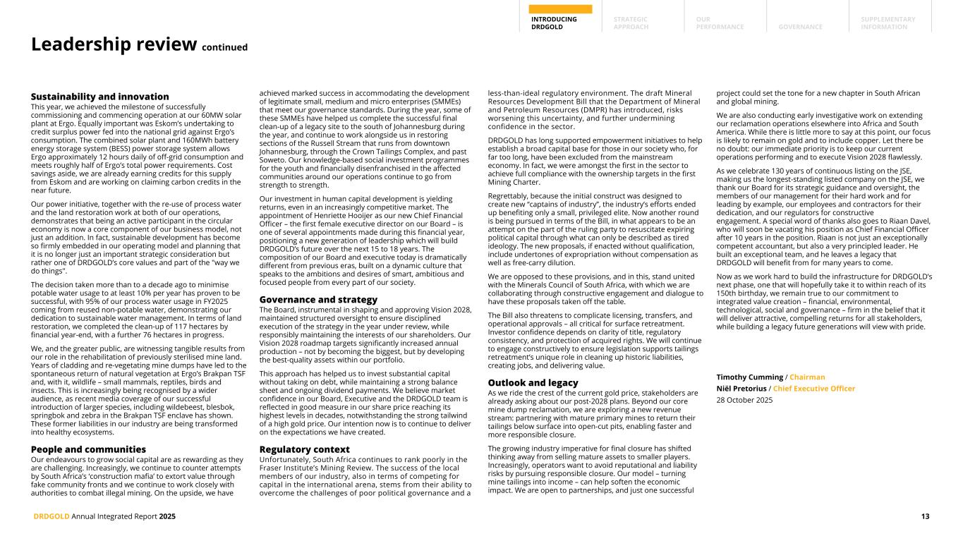 Sustainability and innovation This year, we achieved the milestone of successfully commissioning and commencing operation at our 60MW solar plant at Ergo. Equally important was Eskom’s undertaking to credit surplus power fed into the national grid against Ergo’s consumption. The combined solar plant and 160MWh battery energy storage system (BESS) power storage system allows Ergo approximately 12 hours daily of off-grid consumption and meets roughly half of Ergo’s total power requirements. Cost savings aside, we are already earning credits for this supply from Eskom and are working on claiming carbon credits in the near future. Our power initiative, together with the re-use of process water and the land restoration work at both of our operations, demonstrates that being an active participant in the circular economy is now a core component of our business model, not just an addition. In fact, sustainable development has become so firmly embedded in our operating model and planning that it is no longer just an important strategic consideration but rather one of DRDGOLD’s core values and part of the "way we do things". The decision taken more than to a decade ago to minimise potable water usage to at least 10% per year has proven to be successful, with 95% of our process water usage in FY2025 coming from reused non-potable water, demonstrating our dedication to sustainable water management. In terms of land restoration, we completed the clean-up of 117 hectares by financial year-end, with a further 76 hectares in progress. We, and the greater public, are witnessing tangible results from our role in the rehabilitation of previously sterilised mine land. Years of cladding and re-vegetating mine dumps have led to the spontaneous return of natural vegetation at Ergo’s Brakpan TSF and, with it, wildlife – small mammals, reptiles, birds and insects. This is increasingly being recognised by a wider audience, as recent media coverage of our successful introduction of larger species, including wildebeest, blesbok, springbok and zebra in the Brakpan TSF enclave has shown. These former liabilities in our industry are being transformed into healthy ecosystems. People and communities Our endeavours to grow social capital are as rewarding as they are challenging. Increasingly, we continue to counter attempts by South Africa’s ‘construction mafia’ to extort value through fake community fronts and we continue to work closely with authorities to combat illegal mining. On the upside, we have achieved marked success in accommodating the development of legitimate small, medium and micro enterprises (SMMEs) that meet our governance standards. During the year, some of these SMMEs have helped us complete the successful final clean-up of a legacy site to the south of Johannesburg during the year, and continue to work alongside us in restoring sections of the Russell Stream that runs from downtown Johannesburg, through the Crown Tailings Complex, and past Soweto. Our knowledge-based social investment programmes for the youth and financially disenfranchised in the affected communities around our operations continue to go from strength to strength. Our investment in human capital development is yielding returns, even in an increasingly competitive market. The appointment of Henriette Hooijer as our new Chief Financial Officer – the first female executive director on our Board – is one of several appointments made during this financial year, positioning a new generation of leadership which will build DRDGOLD’s future over the next 15 to 18 years. The composition of our Board and executive today is dramatically different from previous eras, built on a dynamic culture that speaks to the ambitions and desires of smart, ambitious and focused people from every part of our society. Governance and strategy The Board, instrumental in shaping and approving Vision 2028, maintained structured oversight to ensure disciplined execution of the strategy in the year under review, while responsibly maintaining the interests of our shareholders. Our Vision 2028 roadmap targets significantly increased annual production – not by becoming the biggest, but by developing the best-quality assets within our portfolio. This approach has helped us to invest substantial capital without taking on debt, while maintaining a strong balance sheet and ongoing dividend payments. We believe market confidence in our Board, Executive and the DRDGOLD team is reflected in good measure in our share price reaching its highest levels in decades, notwithstanding the strong tailwind of a high gold price. Our intention now is to continue to deliver on the expectations we have created. Regulatory context Unfortunately, South Africa continues to rank poorly in the Fraser Institute’s Mining Review. The success of the local members of our industry, also in terms of competing for capital in the international arena, stems from their ability to overcome the challenges of poor political governance and a less-than-ideal regulatory environment. The draft Mineral Resources Development Bill that the Department of Mineral and Petroleum Resources (DMPR) has introduced, risks worsening this uncertainty, and further undermining confidence in the sector. DRDGOLD has long supported empowerment initiatives to help establish a broad capital base for those in our society who, for far too long, have been excluded from the mainstream economy. In fact, we were amongst the first in the sector to achieve full compliance with the ownership targets in the first Mining Charter. Regrettably, because the initial construct was designed to create new “captains of industry”, the industry’s efforts ended up benefiting only a small, privileged elite. Now another round is being pursued in terms of the Bill, in what appears to be an attempt on the part of the ruling party to resuscitate expiring political capital through what can only be described as tired ideology. T