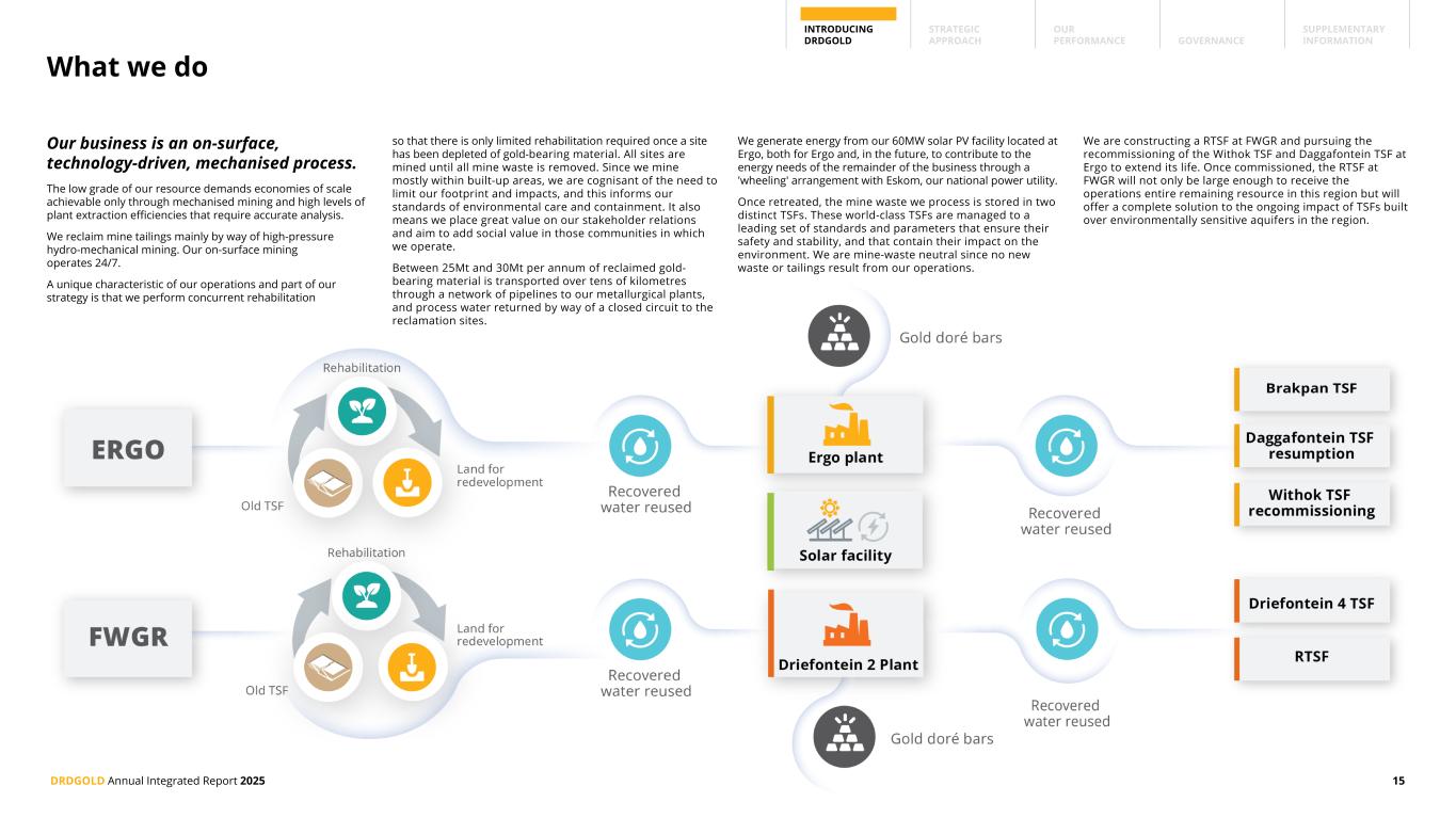 Our business is an on-surface, technology-driven, mechanised process. The low grade of our resource demands economies of scale achievable only through mechanised mining and high levels of plant extraction efficiencies that require accurate analysis. We reclaim mine tailings mainly by way of high-pressure hydro-mechanical mining. Our on-surface mining operates 24/7. A unique characteristic of our operations and part of our strategy is that we perform concurrent rehabilitation so that there is only limited rehabilitation required once a site has been depleted of gold-bearing material. All sites are mined until all mine waste is removed. Since we mine mostly within built-up areas, we are cognisant of the need to limit our footprint and impacts, and this informs our standards of environmental care and containment. It also means we place great value on our stakeholder relations and aim to add social value in those communities in which we operate. Between 25Mt and 30Mt per annum of reclaimed gold- bearing material is transported over tens of kilometres through a network of pipelines to our metallurgical plants, and process water returned by way of a closed circuit to the reclamation sites. We generate energy from our 60MW solar PV facility located at Ergo, both for Ergo and, in the future, to contribute to the energy needs of the remainder of the business through a 'wheeling' arrangement with Eskom, our national power utility. Once retreated, the mine waste we process is stored in two distinct TSFs. These world-class TSFs are managed to a leading set of standards and parameters that ensure their safety and stability, and that contain their impact on the environment. We are mine-waste neutral since no new waste or tailings result from our operations. We are constructing a RTSF at FWGR and pursuing the recommissioning of the Withok TSF and Daggafontein TSF at Ergo to extend its life. Once commissioned, the RTSF at FWGR will not only be large enough to receive the operations entire remaining resource in this region but will offer a complete solution to the ongoing impact of TSFs built over environmentally sensitive aquifers in the region. INTRODUCING DRDGOLD STRATEGIC APPROACH OUR PERFORMANCE GOVERNANCE SUPPLEMENTARY INFORMATION What we do DRDGOLD Annual Integrated Report 2025 15