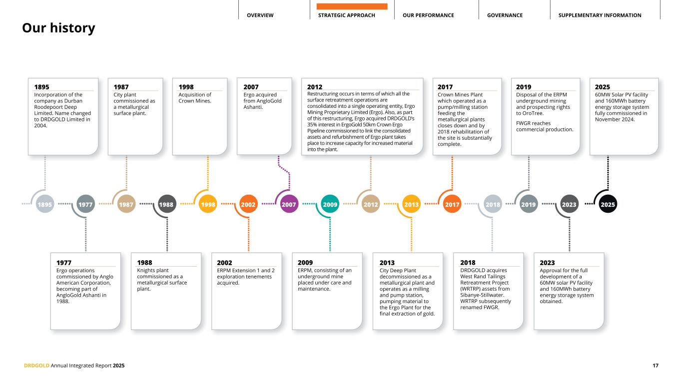OVERVIEW STRATEGIC APPROACH OUR PERFORMANCE GOVERNANCE SUPPLEMENTARY INFORMATION Our history DRDGOLD Annual Integrated Report 2025 17 1895 Incorporation of the company as Durban Roodepoort Deep Limited. Name changed to DRDGOLD Limited in 2004. 1987 City plant commissioned as a metallurgical surface plant. 1998 Acquisition of Crown Mines. 2007 Ergo acquired from AngloGold Ashanti. 2012 Restructuring occurs in terms of which all the surface retreatment operations are consolidated into a single operating entity, Ergo Mining Proprietary Limited (Ergo). Also, as part of this restructuring, Ergo acquired DRDGOLD’s 35% interest in ErgoGold 50km Crown Ergo Pipeline commissioned to link the consolidated assets and refurbishment of Ergo plant takes place to increase capacity for increased material into the plant. 2017 Crown Mines Plant which operated as a pump/milling station feeding the metallurgical plants closes down and by 2018 rehabilitation of the site is substantially complete. 2019 Disposal of the ERPM underground mining and prospecting rights to OroTree. FWGR reaches commercial production. 2025 60MW Solar PV facility and 160MWh battery energy storage system fully commissioned in November 2024. 1977 Ergo operations commissioned by Anglo American Corporation, becoming part of AngloGold Ashanti in 1988. 1988 Knights plant commissioned as a metallurgical surface plant. 2002 ERPM Extension 1 and 2 exploration tenements acquired. 2009 ERPM, consisting of an underground mine placed under care and maintenance. 2013 City Deep Plant decommissioned as a metallurgical plant and operates as a milling and pump station, pumping material to the Ergo Plant for the final extraction of gold. 2018 DRDGOLD acquires West Rand Tailings Retreatment Project (WRTRP) assets from Sibanye-Stillwater. WRTRP subsequently renamed FWGR. 2023 Approval for the full development of a 60MW solar PV facility and 160MWh battery energy storage system obtained.