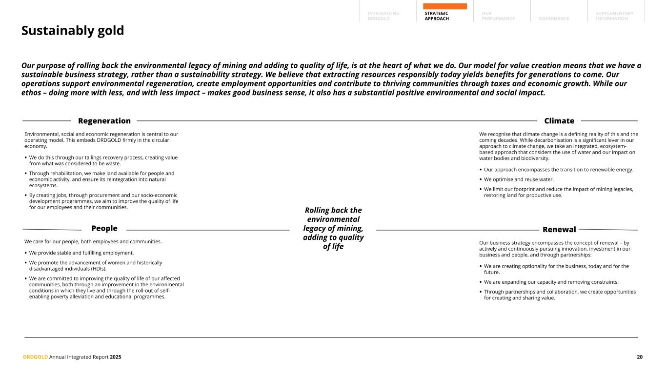 Our purpose of rolling back the environmental legacy of mining and adding to quality of life, is at the heart of what we do. Our model for value creation means that we have a sustainable business strategy, rather than a sustainability strategy. We believe that extracting resources responsibly today yields benefits for generations to come. Our operations support environmental regeneration, create employment opportunities and contribute to thriving communities through taxes and economic growth. While our ethos – doing more with less, and with less impact – makes good business sense, it also has a substantial positive environmental and social impact. INTRODUCING DRDGOLD STRATEGIC APPROACH OUR PERFORMANCE GOVERNANCE SUPPLEMENTARY INFORMATION Sustainably gold DRDGOLD Annual Integrated Report 2025 20 Regeneration Environmental, social and economic regeneration is central to our operating model. This embeds DRDGOLD firmly in the circular economy. • We do this through our tailings recovery process, creating value from what was considered to be waste. • Through rehabilitation, we make land available for people and economic activity, and ensure its reintegration into natural ecosystems. • By creating jobs, through procurement and our socio-economic development programmes, we aim to improve the quality of life for our employees and their communities. Renewal Our business strategy encompasses the concept of renewal – by actively and continuously pursuing innovation, investment in our business and people, and through partnerships: • We are creating optionality for the business, today and for the future. • We are expanding our capacity and removing constraints. • Through partnerships and collaboration, we create opportunities for creating and sharing value. People We care for our people, both employees and communities. • We provide stable and fulfilling employment. • We promote the advancement of women and historically disadvantaged individuals (HDIs). • We are committed to improving the quality of life of our affected communities, both through an improvement in the environmental conditions in which they live and through the roll-out of self- enabling poverty alleviation and educational programmes. Climate We recognise that climate change is a defining reality of this and the coming decades. While decarbonisation is a significant lever in our approach to climate change, we take an integrated, ecosystem- based approach that considers the use of water and our impact on water bodies and biodiversity. • Our approach encompasses the transition to renewable energy. • We optimise and reuse water. • We limit our footprint and reduce the impact of mining legacies, restoring land for productive use. Rolling back the environmental legacy of mining, adding to quality of life