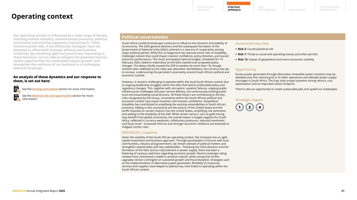 Our operating context is influenced by a wide range of factors, including market volatility, environmental pressures, political uncertainty and evolving regulatory requirements. These interconnected risks, if not effectively managed, have the potential to affect both strategic delivery and business continuity. By remaining agile and proactively responding to these dynamics, we are able to mitigate the potential impacts, unlock opportunities for sustainable organic growth, and strengthen the resilience of our business in a challenging external landscape. An analysis of these dynamics and our response to them, is set out here: Political uncertainties South Africa's political landscape continues to influence the direction and stability of its economy. The 2024 general elections and the subsequent formation of the Government of National Unity (GNU) ushered in a new era of cooperation among major political parties. While this arrangement has reduced some risks of instability, challenges remain that could impact investor confidence, policy direction, and overall economic performance. The much-anticipated national budget, scheduled for 19 February 2025, failed to materialise as the GNU clashed over proposed policy changes. The delay initially caused the ZAR to weaken by more than 1%, though markets later stabilised as the news was absorbed. Nonetheless, the currency has yet to recover, underscoring the persistent uncertainty around South Africa’s political and economic outlook. However, it remains challenging to operate within the local South African context due to ongoing leadership struggles within the GNU that lead to predictable policy and regulatory changes. This, together with corruption, systemic failures, ongoing public infrastructure challenges and poor service delivery, are continuously eroding public trust and exacerbating social tensions. All these factors are contributing to the key risks recognised by the Group. Uncertainty within the South African political and economic context may impact business and investor confidence. Geopolitical instability has contributed to amplifying the existing vulnerabilities in South Africa’s economy. Adding to this uncertainty are the actions of the United States and the tariffs imposed on certain imports into the United States, amplifying risk sentiment and adding to the instability of the ZAR. While certain sectors, such as gold mining, may benefit from global uncertainty, the overall impact is largely negative for South Africa, reflected in currency weakness, inflationary pressures, reduced investment, and fiscal strain. Sustained reforms and stronger economic resilience are essential to mitigate further risks. DRDGOLD’s response Given the volatility of the South African operating context, the Company has an agile capital investment and business approach. Through participation in forums with local communities, industry and government, we remain abreast of political matters and strengthen relationships with key stakeholders. Following the 2024 elections and the formation of the GNU and an improvement in power supply, there has been a fostering of cautious optimism regarding economic growth. Recent sovereign rating reviews have maintained a stable to positive outlook, while noting that further upgrades remain contingent on sustained growth and fiscal discipline. Strategies such as the implementation of alternative power generation, flexibility of resources, services and supplies have helped to address key risks linked to operating within the South African context. Associated top risks • Risk 2: Country/political risk • Risk 7: Threat to social and operating license and other permits • Risk 12: Impact of geopolitical and macro-economic volatility Opportunity Excess power generated through alternative renewable power solutions may be wheeled onto the national grid or to other operations and alleviate power supply shortages in South Africa. The Ergo solar project presents strong returns, cost optimisation and an improved carbon footprint. There is also an opportunity to create sustainable jobs and upskill our employees. Strategic impact INTRODUCING DRDGOLD STRATEGIC APPROACH OUR PERFORMANCE GOVERNANCE SUPPLEMENTARY INFORMATION Operating context DRDGOLD Annual Integrated Report 2025 21 See the Strategy and outlook section for more information See the Material risks and opportunities section for more information 1 2 4