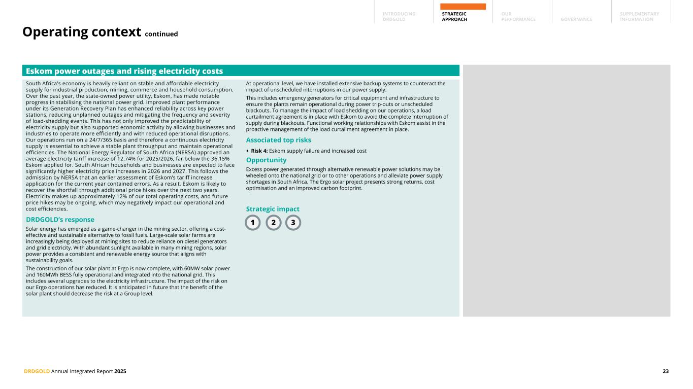 Eskom power outages and rising electricity costs South Africa's economy is heavily reliant on stable and affordable electricity supply for industrial production, mining, commerce and household consumption. Over the past year, the state-owned power utility, Eskom, has made notable progress in stabilising the national power grid. Improved plant performance under its Generation Recovery Plan has enhanced reliability across key power stations, reducing unplanned outages and mitigating the frequency and severity of load-shedding events. This has not only improved the predictability of electricity supply but also supported economic activity by allowing businesses and industries to operate more efficiently and with reduced operational disruptions. Our operations run on a 24/7/365 basis and therefore a continuous electricity supply is essential to achieve a stable plant throughput and maintain operational efficiencies. The National Energy Regulator of South Africa (NERSA) approved an average electricity tariff increase of 12.74% for 2025/2026, far below the 36.15% Eskom applied for. South African households and businesses are expected to face significantly higher electricity price increases in 2026 and 2027. This follows the admission by NERSA that an earlier assessment of Eskom’s tariff increase application for the current year contained errors. As a result, Eskom is likely to recover the shortfall through additional price hikes over the next two years. Electricity makes up approximately 12% of our total operating costs, and future price hikes may be ongoing, which may negatively impact our operational and cost efficiencies. DRDGOLD’s response Solar energy has emerged as a game-changer in the mining sector, offering a cost- effective and sustainable alternative to fossil fuels. Large-scale solar farms are increasingly being deployed at mining sites to reduce reliance on diesel generators and grid electricity. With abundant sunlight available in many mining regions, solar power provides a consistent and renewable energy source that aligns with sustainability goals. The construction of our solar plant at Ergo is now complete, with 60MW solar power and 160MWh BESS fully operational and integrated into the national grid. This includes several upgrades to the electricity infrastructure. The impact of the risk on our Ergo operations has reduced. It is anticipated in future that the benefit of the solar plant should decrease the risk at a Group level. At operational level, we have installed extensive backup systems to counteract the impact of unscheduled interruptions in our power supply. This includes emergency generators for critical equipment and infrastructure to ensure the plants remain operational during power trip-outs or unscheduled blackouts. To manage the impact of load shedding on our operations, a load curtailment agreement is in place with Eskom to avoid the complete interruption of supply during blackouts. Functional working relationships with Eskom assist in the proactive management of the load curtailment agreement in place. Associated top risks • Risk 4: Eskom supply failure and increased cost Opportunity Excess power generated through alternative renewable power solutions may be wheeled onto the national grid or to other operations and alleviate power supply shortages in South Africa. The Ergo solar project presents strong returns, cost optimisation and an improved carbon footprint. Strategic impact INTRODUCING DRDGOLD STRATEGIC APPROACH OUR PERFORMANCE GOVERNANCE SUPPLEMENTARY INFORMATION Operating context continued DRDGOLD Annual Integrated Report 2025 23 1 2 3
