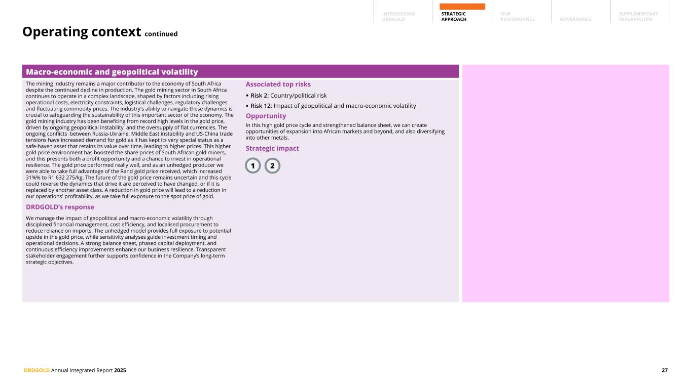 Macro-economic and geopolitical volatility The mining industry remains a major contributor to the economy of South Africa despite the continued decline in production. The gold mining sector in South Africa continues to operate in a complex landscape, shaped by factors including rising operational costs, electricity constraints, logistical challenges, regulatory challenges and fluctuating commodity prices. The industry's ability to navigate these dynamics is crucial to safeguarding the sustainability of this important sector of the economy. The gold mining industry has been benefiting from record high levels in the gold price, driven by ongoing geopolitical instability and the oversupply of fiat currencies. The ongoing conflicts between Russia-Ukraine, Middle East instability and US-China trade tensions have increased demand for gold as it has kept its very special status as a safe-haven asset that retains its value over time, leading to higher prices. This higher gold price environment has boosted the share prices of South African gold miners, and this presents both a profit opportunity and a chance to invest in operational resilience. The gold price performed really well, and as an unhedged producer we were able to take full advantage of the Rand gold price received, which increased 31%% to R1 632 275/kg. The future of the gold price remains uncertain and this cycle could reverse the dynamics that drive it are perceived to have changed, or if it is replaced by another asset class. A reduction in gold price will lead to a reduction in our operations' profitability, as we take full exposure to the spot price of gold. DRDGOLD’s response We manage the impact of geopolitical and macro-economic volatility through disciplined financial management, cost efficiency, and localised procurement to reduce reliance on imports. The unhedged model provides full exposure to potential upside in the gold price, while sensitivity analyses guide investment timing and operational decisions. A strong balance sheet, phased capital deployment, and continuous efficiency improvements enhance our business resilience. Transparent stakeholder engagement further supports confidence in the Company’s long-term strategic objectives. Associated top risks • Risk 2: Country/political risk • Risk 12: Impact of geopolitical and macro-economic volatility Opportunity In this high gold price cycle and strengthened balance sheet, we can create opportunities of expansion into African markets and beyond, and also diversifying into other metals. Strategic impact INTRODUCING DRDGOLD STRATEGIC APPROACH OUR PERFORMANCE GOVERNANCE SUPPLEMENTARY INFORMATION Operating context continued DRDGOLD Annual Integrated Report 2025 27 1 2