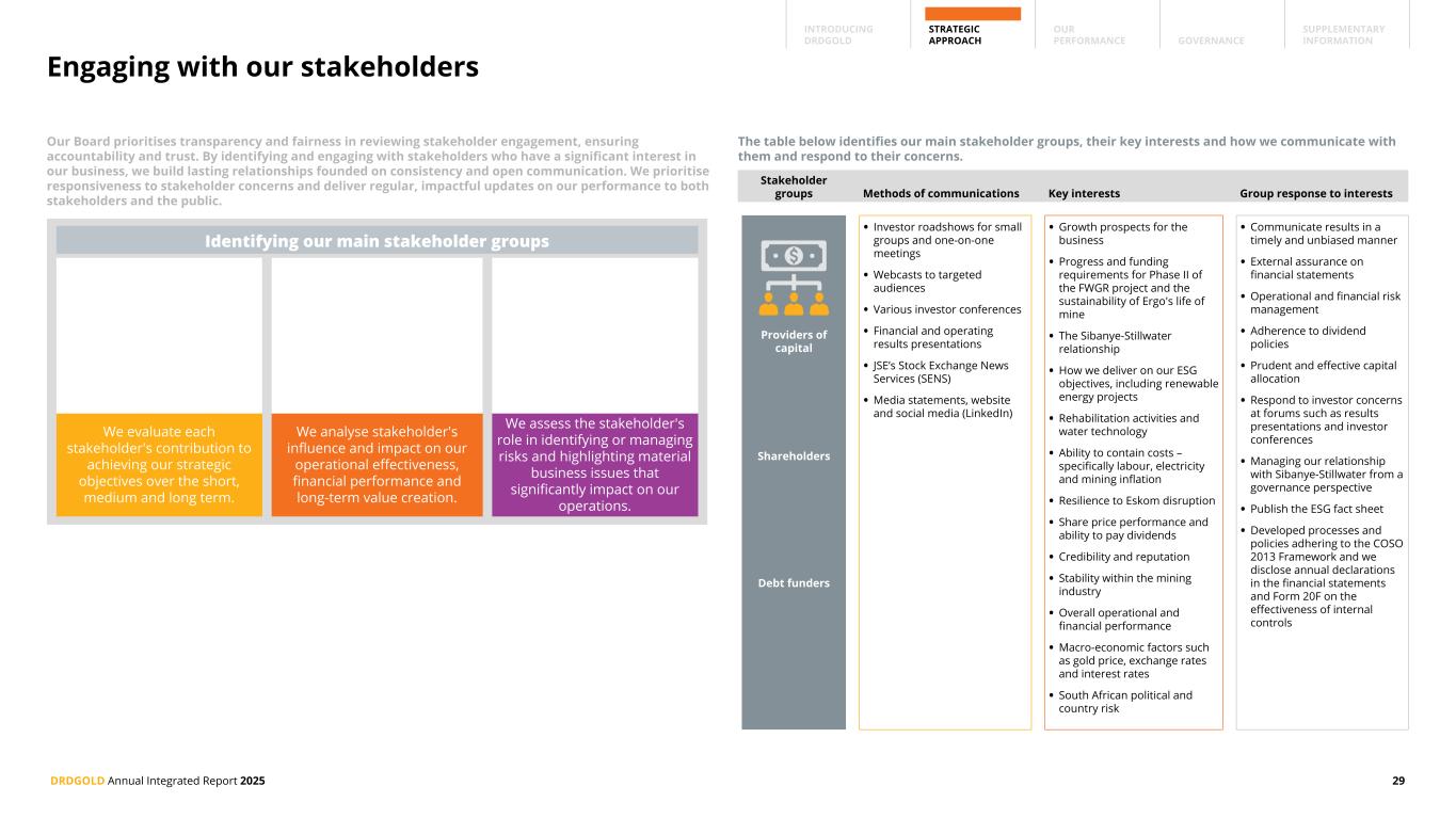 Our Board prioritises transparency and fairness in reviewing stakeholder engagement, ensuring accountability and trust. By identifying and engaging with stakeholders who have a significant interest in our business, we build lasting relationships founded on consistency and open communication. We prioritise responsiveness to stakeholder concerns and deliver regular, impactful updates on our performance to both stakeholders and the public. Identifying our main stakeholder groups We evaluate each stakeholder's contribution to achieving our strategic objectives over the short, medium and long term. We analyse stakeholder's influence and impact on our operational effectiveness, financial performance and long-term value creation. We assess the stakeholder's role in identifying or managing risks and highlighting material business issues that significantly impact on our operations. The table below identifies our main stakeholder groups, their key interests and how we communicate with them and respond to their concerns. Stakeholder groups Methods of communications Key interests Group response to interests Providers of capital Shareholders Debt funders • Investor roadshows for small groups and one-on-one meetings • Webcasts to targeted audiences • Various investor conferences • Financial and operating results presentations • JSE’s Stock Exchange News Services (SENS) • Media statements, website and social media (LinkedIn) • Growth prospects for the business • Progress and funding requirements for Phase II of the FWGR project and the sustainability of Ergo's life of mine • The Sibanye-Stillwater relationship • How we deliver on our ESG objectives, including renewable energy projects • Rehabilitation activities and water technology • Ability to contain costs – specifically labour, electricity and mining inflation • Resilience to Eskom disruption • Share price performance and ability to pay dividends • Credibility and reputation • Stability within the mining industry • Overall operational and financial performance • Macro-economic factors such as gold price, exchange rates and interest rates • South African political and country risk • Communicate results in a timely and unbiased manner • External assurance on financial statements • Operational and financial risk management • Adherence to dividend policies • Prudent and effective capital allocation • Respond to investor concerns at forums such as results presentations and investor conferences • Managing our relationship with Sibanye-Stillwater from a governance perspective • Publish the ESG fact sheet • Developed processes and policies adhering to the COSO 2013 Framework and we disclose annual declarations in the financial statements and Form 20F on the effectiveness of internal controls INTRODUCING DRDGOLD STRATEGIC APPROACH OUR PERFORMANCE GOVERNANCE SUPPLEMENTARY INFORMATION Engaging with our stakeholders DRDGOLD Annual Integrated Report 2025 29