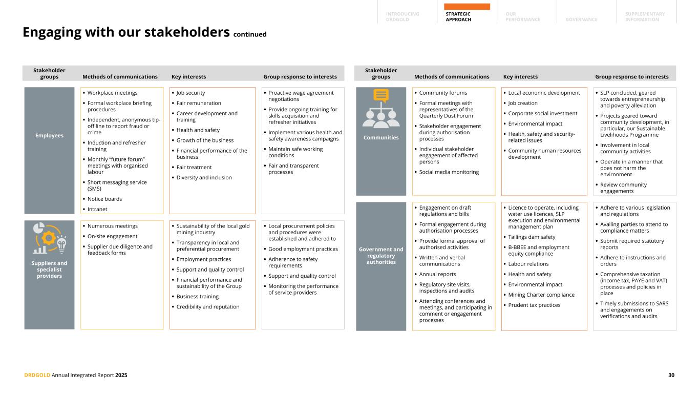 Stakeholder groups Methods of communications Key interests Group response to interests Employees • Workplace meetings • Formal workplace briefing procedures • Independent, anonymous tip- off line to report fraud or crime • Induction and refresher training • Monthly “future forum” meetings with organised labour • Short messaging service (SMS) • Notice boards • Intranet • Job security • Fair remuneration • Career development and training • Health and safety • Growth of the business • Financial performance of the business • Fair treatment • Diversity and inclusion • Proactive wage agreement negotiations • Provide ongoing training for skills acquisition and refresher initiatives • Implement various health and safety awareness campaigns • Maintain safe working conditions • Fair and transparent processes Suppliers and specialist providers • Numerous meetings • On-site engagement • Supplier due diligence and feedback forms • Sustainability of the local gold mining industry • Transparency in local and preferential procurement • Employment practices • Support and quality control • Financial performance and sustainability of the Group • Business training • Credibility and reputation • Local procurement policies and procedures were established and adhered to • Good employment practices • Adherence to safety requirements • Support and quality control • Monitoring the performance of service providers Stakeholder groups Methods of communications Key interests Group response to interests Communities • Community forums • Formal meetings with representatives of the Quarterly Dust Forum • Stakeholder engagement during authorisation processes • Individual stakeholder engagement of affected persons • Social media monitoring • Local economic development • Job creation • Corporate social investment • Environmental impact • Health, safety and security- related issues • Community human resources development • SLP concluded, geared towards entrepreneurship and poverty alleviation • Projects geared toward community development, in particular, our Sustainable Livelihoods Programme • Involvement in local community activities • Operate in a manner that does not harm the environment • Review community engagements Government and regulatory authorities • Engagement on draft regulations and bills • Formal engagement during authorisation processes • Provide formal approval of authorised activities • Written and verbal communications • Annual reports • Regulatory site visits, inspections and audits • Attending conferences and meetings, and participating in comment or engagement processes • Licence to operate, including water use licences, SLP execution and environmental management plan • Tailings dam safety • B-BBEE and employment equity compliance • Labour relations • Health and safety • Environmental impact • Mining Charter compliance • Prudent tax practices • Adhere to various legislation and regulations • Availing parties to attend to compliance matters • Submit required statutory reports • Adhere to instructions and orders • Comprehensive taxation (income tax, PAYE and VAT) processes and policies in place • Timely submissions to SARS and engagements on verifications and audits INTRODUCING DRDGOLD STRATEGIC APPROACH OUR PERFORMANCE GOVERNANCE SUPPLEMENTARY INFORMATION Engaging with our stakeholders continued DRDGOLD Annual Integrated Report 2025 30