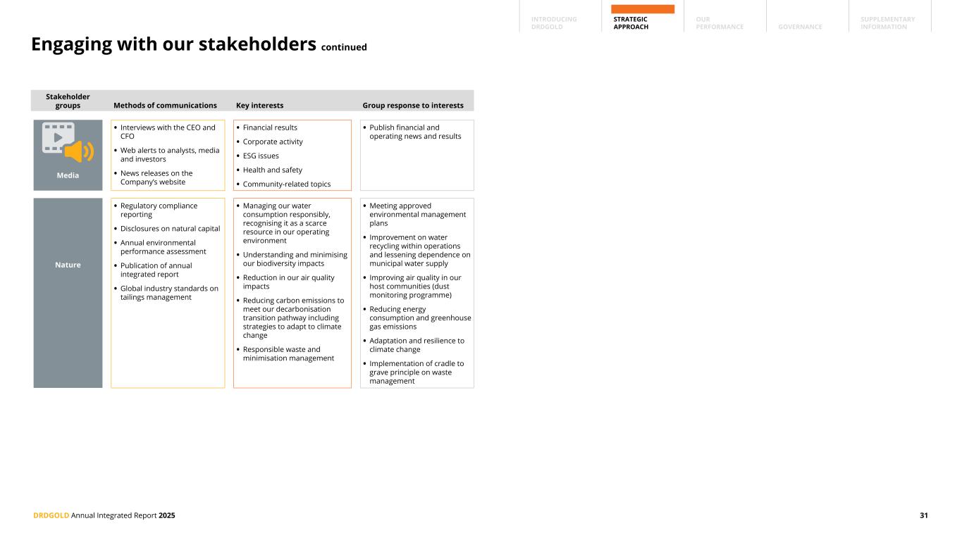 Stakeholder groups Methods of communications Key interests Group response to interests Media • Interviews with the CEO and CFO • Web alerts to analysts, media and investors • News releases on the Company’s website • Financial results • Corporate activity • ESG issues • Health and safety • Community-related topics • Publish financial and operating news and results Nature • Regulatory compliance reporting • Disclosures on natural capital • Annual environmental performance assessment • Publication of annual integrated report • Global industry standards on tailings management • Managing our water consumption responsibly, recognising it as a scarce resource in our operating environment • Understanding and minimising our biodiversity impacts • Reduction in our air quality impacts • Reducing carbon emissions to meet our decarbonisation transition pathway including strategies to adapt to climate change • Responsible waste and minimisation management • Meeting approved environmental management plans • Improvement on water recycling within operations and lessening dependence on municipal water supply • Improving air quality in our host communities (dust monitoring programme) • Reducing energy consumption and greenhouse gas emissions • Adaptation and resilience to climate change • Implementation of cradle to grave principle on waste management INTRODUCING DRDGOLD STRATEGIC APPROACH OUR PERFORMANCE GOVERNANCE SUPPLEMENTARY INFORMATION Engaging with our stakeholders continued DRDGOLD Annual Integrated Report 2025 31
