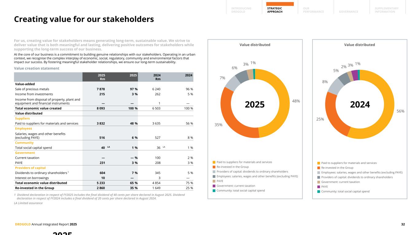 For us, creating value for stakeholders means generating long-term, sustainable value. We strive to deliver value that is both meaningful and lasting, delivering positive outcomes for stakeholders while supporting the long-term success of our business. At the core of our business is a commitment to building genuine relationships with our stakeholders. Operating in an urban context, we recognise the complex interplay of economic, social, regulatory, community and environmental factors that impact our success. By fostering meaningful stakeholder relationships, we ensure our long-term sustainability. Value creation statement 2025 Rm 2025 2024 Rm 2024 Value-added Sale of precious metals 7 878 97 % 6 240 96 % Income from investments 215 3 % 262 5 % Income from disposal of property, plant and equipment and financial instruments — — 1 — Total economic value created 8 093 100 % 6 503 100 % Value distributed Suppliers Paid to suppliers for materials and services 3 832 48 % 3 635 56 % Employees Salaries, wages and other benefits (excluding PAYE) 516 6 % 527 8 % Community Total social capital spend 40 LA 1 % 36 LA 1 % Government Current taxation — — % 100 2 % PAYE 231 3 % 208 3 % Providers of capital Dividends to ordinary shareholders 1 604 7 % 345 5 % Interest on borrowings 10 — 3 — Total economic value distributed 5 233 65 % 4 854 75 % Re-invested in the Group 2 860 35 % 1 649 25 % 1 Dividend declaration in respect of FY2025 includes the final dividend of 40 cents per share declared in August 2025. Dividend declaration in respect of FY2024 includes a final dividend of 20 cents per share declared in August 2024. LA Limited assurance Value distributed 48% 35% 7% 6% 3% 1% Paid to suppliers for materials and services Re-invested in the Group Providers of capital: dividends to ordinary shareholders Employees: salaries, wages and other benefits (excluding PAYE) PAYE Government: current taxation Community: total social capital spend Value distributed 56% 25% 8% 5% 2% 3% 1% Paid to suppliers for materials and services Re-invested in the Group Employees: salaries, wages and other benefits (excluding PAYE) Providers of capital: dividends to ordinary shareholders Government: current taxation PAYE Community: total social capital spend INTRODUCING DRDGOLD STRATEGIC APPROACH OUR PERFORMANCE GOVERNANCE SUPPLEMENTARY INFORMATION Creating value for our stakeholders DRDGOLD Annual Integrated Report 2025 32 2024 2025 2025