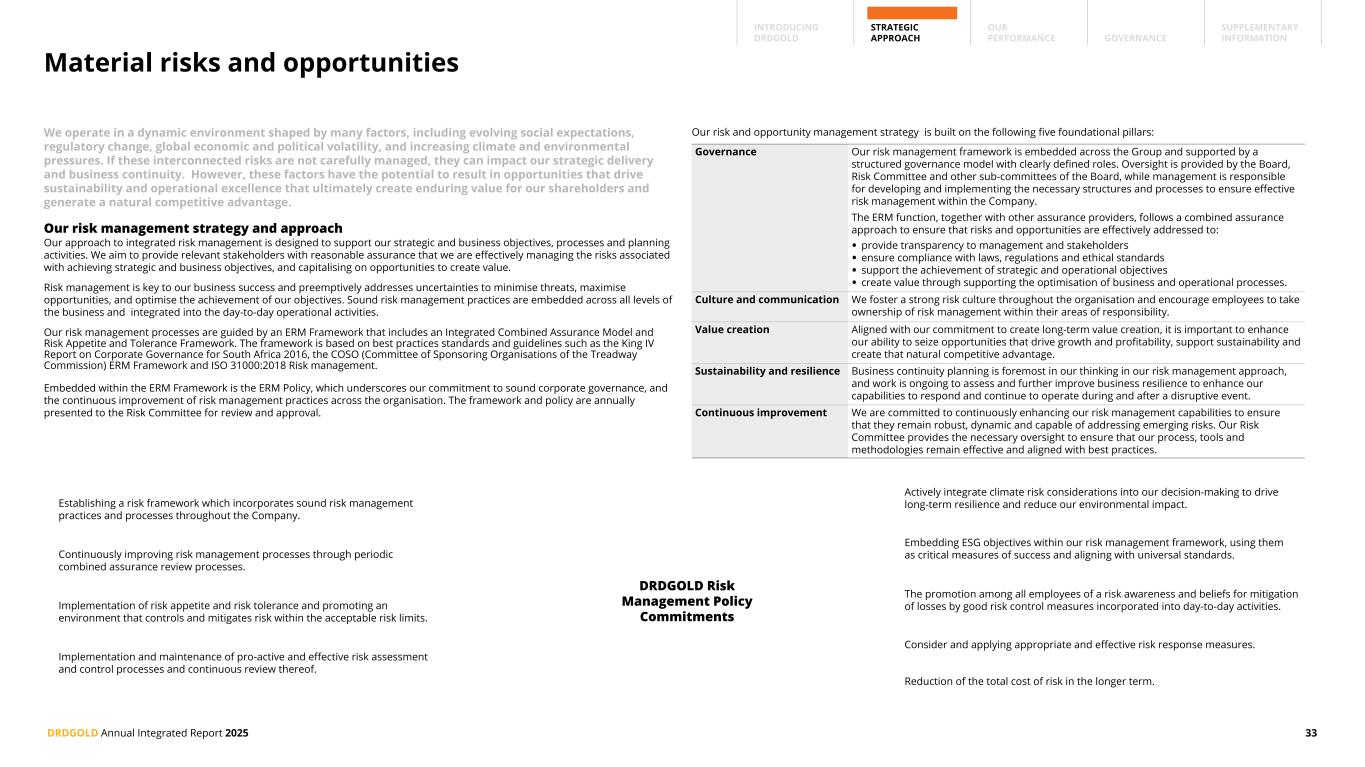 We operate in a dynamic environment shaped by many factors, including evolving social expectations, regulatory change, global economic and political volatility, and increasing climate and environmental pressures. If these interconnected risks are not carefully managed, they can impact our strategic delivery and business continuity. However, these factors have the potential to result in opportunities that drive sustainability and operational excellence that ultimately create enduring value for our shareholders and generate a natural competitive advantage. Our risk management strategy and approach Our approach to integrated risk management is designed to support our strategic and business objectives, processes and planning activities. We aim to provide relevant stakeholders with reasonable assurance that we are effectively managing the risks associated with achieving strategic and business objectives, and capitalising on opportunities to create value. Risk management is key to our business success and preemptively addresses uncertainties to minimise threats, maximise opportunities, and optimise the achievement of our objectives. Sound risk management practices are embedded across all levels of the business and integrated into the day-to-day operational activities. Our risk management processes are guided by an ERM Framework that includes an Integrated Combined Assurance Model and Risk Appetite and Tolerance Framework. The framework is based on best practices standards and guidelines such as the King IV Report on Corporate Governance for South Africa 2016, the COSO (Committee of Sponsoring Organisations of the Treadway Commission) ERM Framework and ISO 31000:2018 Risk management. Embedded within the ERM Framework is the ERM Policy, which underscores our commitment to sound corporate governance, and the continuous improvement of risk management practices across the organisation. The framework and policy are annually presented to the Risk Committee for review and approval. Our risk and opportunity management strategy is built on the following five foundational pillars: Governance Our risk management framework is embedded across the Group and supported by a structured governance model with clearly defined roles. Oversight is provided by the Board, Risk Committee and other sub-committees of the Board, while management is responsible for developing and implementing the necessary structures and processes to ensure effective risk management within the Company. The ERM function, together with other assurance providers, follows a combined assurance approach to ensure that risks and opportunities are effectively addressed to: • provide transparency to management and stakeholders • ensure compliance with laws, regulations and ethical standards • support the achievement of strategic and operational objectives • create value through supporting the optimisation of business and operational processes. Culture and communication We foster a strong risk culture throughout the organisation and encourage employees to take ownership of risk management within their areas of responsibility. Value creation Aligned with our commitment to create long-term value creation, it is important to enhance our ability to seize opportunities that drive growth and profitability, support sustainability and create that natural competitive advantage. Sustainability and resilience Business continuity planning is foremost in our thinking in our risk management approach, and work is ongoing to assess and further improve business resilience to enhance our capabilities to respond and continue to operate during and after a disruptive event. Continuous improvement We are committed to continuously enhancing our risk management capabilities to ensure that they remain robust, dynamic and capable of addressing emerging risks. Our Risk Committee provides the necessary oversight to ensure that our process, tools and methodologies remain effective and aligned with best practices. INTRODUCING DRDGOLD STRATEGIC APPROACH OUR PERFORMANCE GOVERNANCE SUPPLEMENTARY INFORMATION Material risks and opportunities DRDGOLD Annual Integrated Report 2025 33 DRDGOLD Risk Management Policy Commitments Establishing a risk framework which incorporates sound risk management practices and processes throughout the Company. Continuously improving risk management processes through periodic combined assurance review processes. Implementation of risk appetite and risk tolerance and promoting an environment that controls and mitigates risk within the acceptable risk limits. Implementation and maintenance of pro-active and effective risk assessment and control processes and continuous review thereof. Actively integrate climate risk considerations into our decision-making to drive long-term resilience and reduce our environmental impact. The promotion among all employees of a risk awareness and beliefs for mitigation of losses by good risk control measures incorporated into day-to-day activities. Consider and applying appropriate and effective risk response measures. Reduction of the total cost of risk in the longer term. Embedding ESG objectives within our risk management framework, using them as critical measures of success and aligning with universal standards.