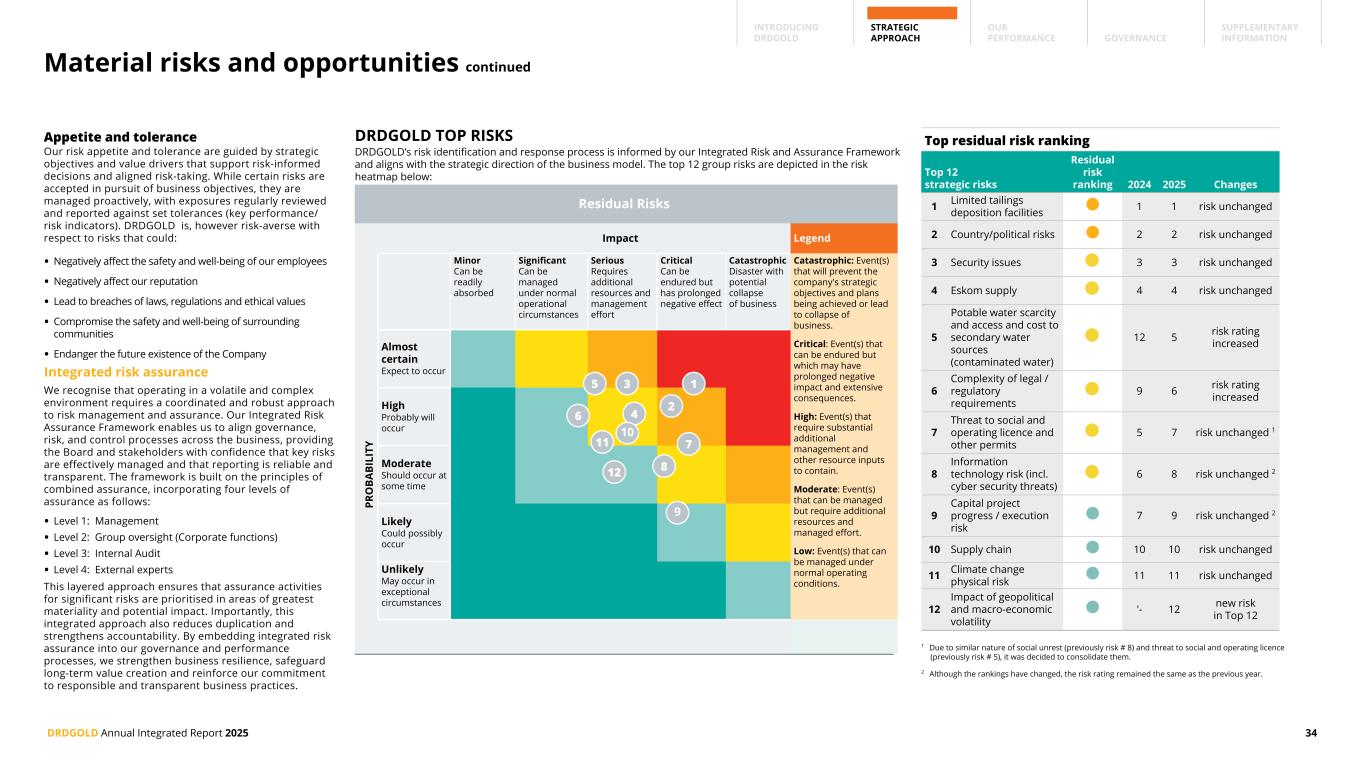 Appetite and tolerance Our risk appetite and tolerance are guided by strategic objectives and value drivers that support risk-informed decisions and aligned risk-taking. While certain risks are accepted in pursuit of business objectives, they are managed proactively, with exposures regularly reviewed and reported against set tolerances (key performance/ risk indicators). DRDGOLD is, however risk-averse with respect to risks that could: • Negatively affect the safety and well-being of our employees • Negatively affect our reputation • Lead to breaches of laws, regulations and ethical values • Compromise the safety and well-being of surrounding communities • Endanger the future existence of the Company Integrated risk assurance We recognise that operating in a volatile and complex environment requires a coordinated and robust approach to risk management and assurance. Our Integrated Risk Assurance Framework enables us to align governance, risk, and control processes across the business, providing the Board and stakeholders with confidence that key risks are effectively managed and that reporting is reliable and transparent. The framework is built on the principles of combined assurance, incorporating four levels of assurance as follows: • Level 1: Management • Level 2: Group oversight (Corporate functions) • Level 3: Internal Audit • Level 4: External experts This layered approach ensures that assurance activities for significant risks are prioritised in areas of greatest materiality and potential impact. Importantly, this integrated approach also reduces duplication and strengthens accountability. By embedding integrated risk assurance into our governance and performance processes, we strengthen business resilience, safeguard long-term value creation and reinforce our commitment to responsible and transparent business practices. DRDGOLD TOP RISKS DRDGOLD’s risk identification and response process is informed by our Integrated Risk and Assurance Framework and aligns with the strategic direction of the business model. The top 12 group risks are depicted in the risk heatmap below: Residual Risks Impact Legend Minor Can be readily absorbed Significant Can be managed under normal operational circumstances Serious Requires additional resources and management effort Critical Can be endured but has prolonged negative effect Catastrophic Disaster with potential collapse of business Catastrophic: Event(s) that will prevent the company's strategic objectives and plans being achieved or lead to collapse of business. Critical: Event(s) that can be endured but which may have prolonged negative impact and extensive consequences. High: Event(s) that require substantial additional management and other resource inputs to contain. Moderate: Event(s) that can be managed but require additional resources and managed effort. Low: Event(s) that can be managed under normal operating conditions. PR O BA BI LI TY Almost certain Expect to occur High Probably will occur Moderate Should occur at some time Likely Could possibly occur Unlikely May occur in exceptional circumstances Top residual risk ranking Top 12 strategic risks Residual risk ranking 2024 2025 Changes 1 Limited tailings deposition facilities 1 1 risk unchanged 2 Country/political risks 2 2 risk unchanged 3 Security issues 3 3 risk unchanged 4 Eskom supply 4 4 risk unchanged 5 Potable water scarcity and access and cost to secondary water sources (contaminated water) 12 5 risk rating increased 6 Complexity of legal / regulatory requirements 9 6 risk rating increased 7 Threat to social and operating licence and other permits 5 7 risk unchanged 1 8 Information technology risk (incl. cyber security threats) 6 8 risk unchanged 2 9 Capital project progress / execution risk 7 9 risk unchanged 2 10 Supply chain 10 10 risk unchanged 11 Climate change physical risk 11 11 risk unchanged 12 Impact of geopolitical and macro-economic volatility '- 12 new risk in Top 12 1 Due to similar nature of social unrest (previously risk # 8) and threat to social and operating licence (previously risk # 5), it was decided to consolidate them. 2 Although the rankings have changed, the risk rating remained the same as the previous year. INTRODUCING DRDGOLD STRATEGIC APPROACH OUR PERFORMANCE GOVERNANCE SUPPLEMENTARY INFORMATION Material risks and opportunities continued DRDGOLD Annual Integrated Report 2025 34 1 2 7 8 5 3 46 9 11 12 10