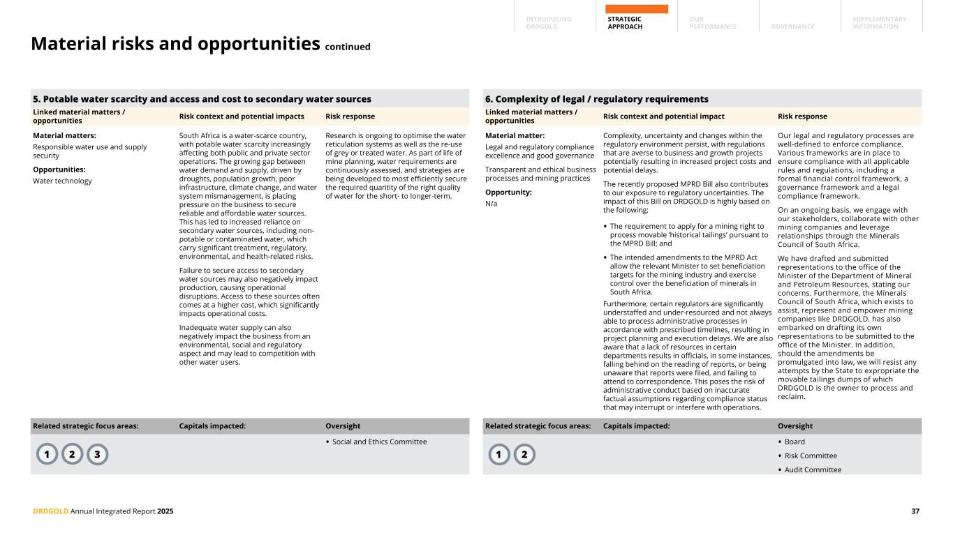 5. Potable water scarcity and access and cost to secondary water sources Linked material matters / opportunities Risk context and potential impacts Risk response Material matters: Responsible water use and supply security Opportunities: Water technology South Africa is a water-scarce country, with potable water scarcity increasingly affecting both public and private sector operations. The growing gap between water demand and supply, driven by droughts, population growth, poor infrastructure, climate change, and water system mismanagement, is placing pressure on the business to secure reliable and affordable water sources. This has led to increased reliance on secondary water sources, including non- potable or contaminated water, which carry significant treatment, regulatory, environmental, and health-related risks. Failure to secure access to secondary water sources may also negatively impact production, causing operational disruptions. Access to these sources often comes at a higher cost, which significantly impacts operational costs. Inadequate water supply can also negatively impact the business from an environmental, social and regulatory aspect and may lead to competition with other water users. Research is ongoing to optimise the water reticulation systems as well as the re-use of grey or treated water. As part of life of mine planning, water requirements are continuously assessed, and strategies are being developed to most efficiently secure the required quantity of the right quality of water for the short- to longer-term. Related strategic focus areas: Capitals impacted: Oversight • Social and Ethics Committee 6. Complexity of legal / regulatory requirements Linked material matters / opportunities Risk context and potential impact Risk response Material matter: Legal and regulatory compliance excellence and good governance Transparent and ethical business processes and mining practices Opportunity: N/a Complexity, uncertainty and changes within the regulatory environment persist, with regulations that are averse to business and growth projects potentially resulting in increased project costs and potential delays. The recently proposed MPRD Bill also contributes to our exposure to regulatory uncertainties. The impact of this Bill on DRDGOLD is highly based on the following: • The requirement to apply for a mining right to process movable ‘historical tailings’ pursuant to the MPRD Bill; and • The intended amendments to the MPRD Act allow the relevant Minister to set beneficiation targets for the mining industry and exercise control over the beneficiation of minerals in South Africa. Furthermore, certain regulators are significantly understaffed and under-resourced and not always able to process administrative processes in accordance with prescribed timelines, resulting in project planning and execution delays. We are also aware that a lack of resources in certain departments results in officials, in some instances, falling behind on the reading of reports, or being unaware that reports were filed, and failing to attend to correspondence. This poses the risk of administrative conduct based on inaccurate factual assumptions regarding compliance status that may interrupt or interfere with operations. Our legal and regulatory processes are well-defined to enforce compliance. Various frameworks are in place to ensure compliance with all applicable rules and regulations, including a formal financial control framework, a governance framework and a legal compliance framework. On an ongoing basis, we engage with our stakeholders, collaborate with other mining companies and leverage relationships through the Minerals Council of South Africa. We have drafted and submitted representations to the office of the Minister of the Department of Mineral and Petroleum Resources, stating our concerns. Furthermore, the Minerals Council of South Africa, which exists to assist, represent and empower mining companies like DRDGOLD, has also embarked on drafting its own representations to be submitted to the office of the Minister. In addition, should the amendments be promulgated into law, we will resist any attempts by the State to expropriate the movable tailings dumps of which DRDGOLD is the owner to process and reclaim. Related strategic focus areas: Capitals impacted: Oversight • Board • Risk Committee • Audit Committee INTRODUCING DRDGOLD STRATEGIC APPROACH OUR PERFORMANCE GOVERNANCE SUPPLEMENTARY INFORMATION Material risks and opportunities continued DRDGOLD Annual Integrated Report 2025 37 1 2 3 1 2