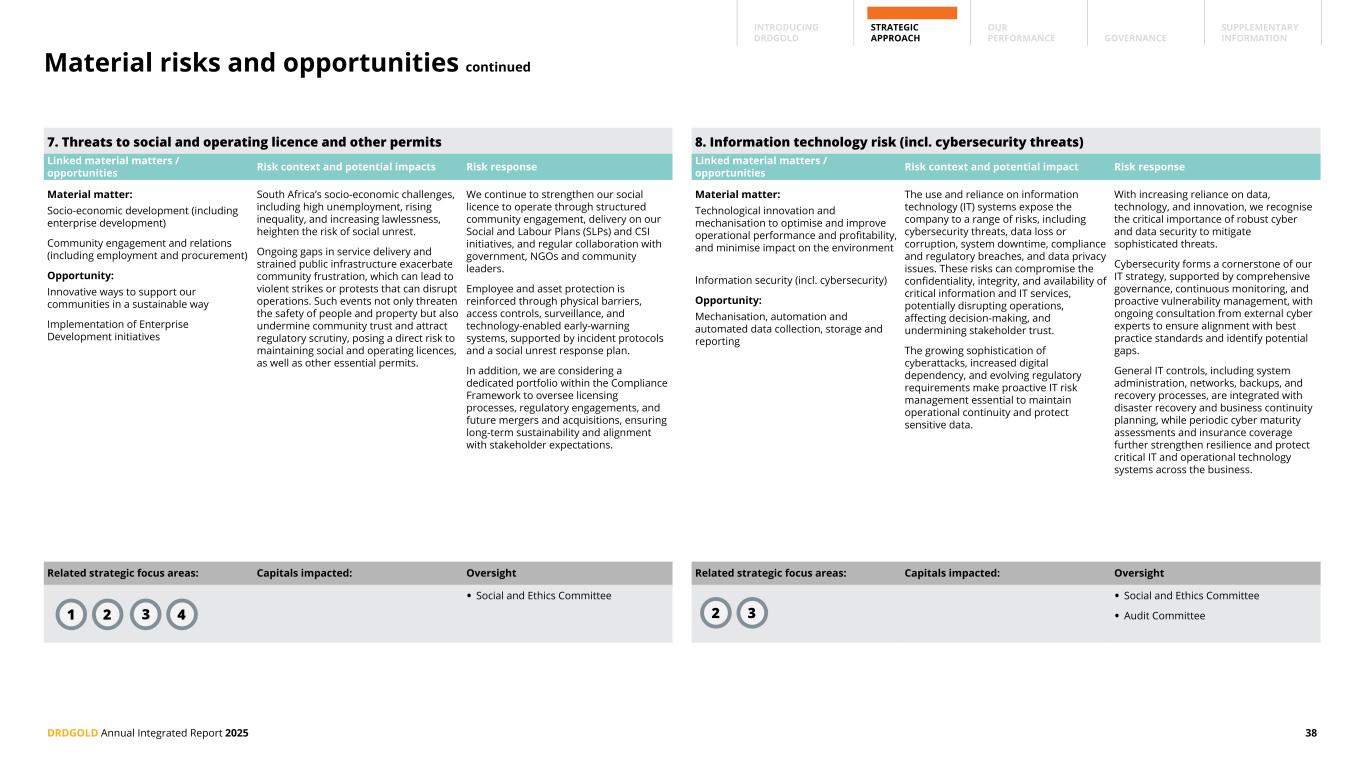 7. Threats to social and operating licence and other permits Linked material matters / opportunities Risk context and potential impacts Risk response Material matter: Socio-economic development (including enterprise development) Community engagement and relations (including employment and procurement) Opportunity: Innovative ways to support our communities in a sustainable way Implementation of Enterprise Development initiatives South Africa’s socio-economic challenges, including high unemployment, rising inequality, and increasing lawlessness, heighten the risk of social unrest. Ongoing gaps in service delivery and strained public infrastructure exacerbate community frustration, which can lead to violent strikes or protests that can disrupt operations. Such events not only threaten the safety of people and property but also undermine community trust and attract regulatory scrutiny, posing a direct risk to maintaining social and operating licences, as well as other essential permits. We continue to strengthen our social licence to operate through structured community engagement, delivery on our Social and Labour Plans (SLPs) and CSI initiatives, and regular collaboration with government, NGOs and community leaders. Employee and asset protection is reinforced through physical barriers, access controls, surveillance, and technology-enabled early-warning systems, supported by incident protocols and a social unrest response plan. In addition, we are considering a dedicated portfolio within the Compliance Framework to oversee licensing processes, regulatory engagements, and future mergers and acquisitions, ensuring long-term sustainability and alignment with stakeholder expectations. Related strategic focus areas: Capitals impacted: Oversight • Social and Ethics Committee 8. Information technology risk (incl. cybersecurity threats) Linked material matters / opportunities Risk context and potential impact Risk response Material matter: Technological innovation and mechanisation to optimise and improve operational performance and profitability, and minimise impact on the environment Information security (incl. cybersecurity) Opportunity: Mechanisation, automation and automated data collection, storage and reporting The use and reliance on information technology (IT) systems expose the company to a range of risks, including cybersecurity threats, data loss or corruption, system downtime, compliance and regulatory breaches, and data privacy issues. These risks can compromise the confidentiality, integrity, and availability of critical information and IT services, potentially disrupting operations, affecting decision-making, and undermining stakeholder trust. The growing sophistication of cyberattacks, increased digital dependency, and evolving regulatory requirements make proactive IT risk management essential to maintain operational continuity and protect sensitive data. With increasing reliance on data, technology, and innovation, we recognise the critical importance of robust cyber and data security to mitigate sophisticated threats. Cybersecurity forms a cornerstone of our IT strategy, supported by comprehensive governance, continuous monitoring, and proactive vulnerability management, with ongoing consultation from external cyber experts to ensure alignment with best practice standards and identify potential gaps. General IT controls, including system administration, networks, backups, and recovery processes, are integrated with disaster recovery and business continuity planning, while periodic cyber maturity assessments and insurance coverage further strengthen resilience and protect critical IT and operational technology systems across the business. Related strategic focus areas: Capitals impacted: Oversight • Social and Ethics Committee • Audit Committee INTRODUCING DRDGOLD STRATEGIC APPROACH OUR PERFORMANCE GOVERNANCE SUPPLEMENTARY INFORMATION Material risks and opportunities continued DRDGOLD Annual Integrated Report 2025 38 2 31 2 3 4