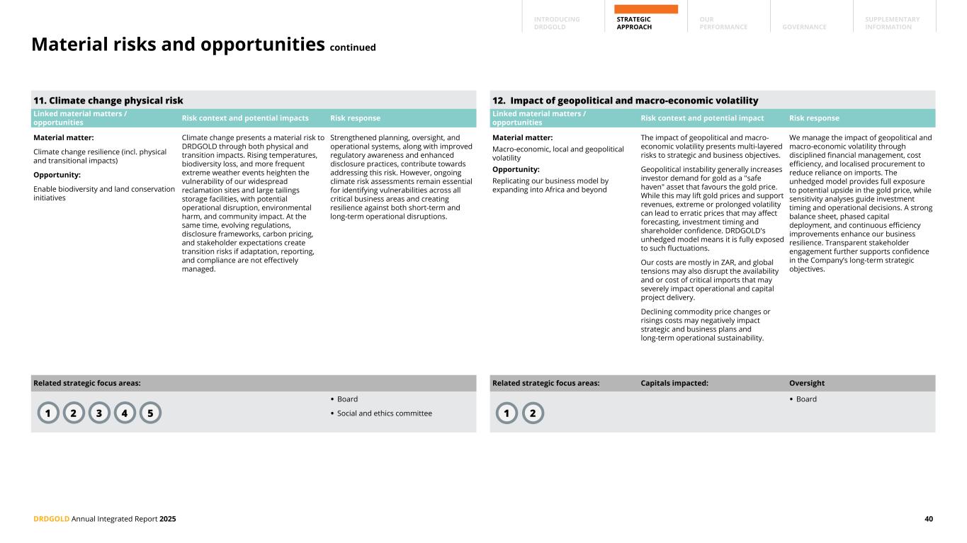 11. Climate change physical risk Linked material matters / opportunities Risk context and potential impacts Risk response Material matter: Climate change resilience (incl. physical and transitional impacts) Opportunity: Enable biodiversity and land conservation initiatives Climate change presents a material risk to DRDGOLD through both physical and transition impacts. Rising temperatures, biodiversity loss, and more frequent extreme weather events heighten the vulnerability of our widespread reclamation sites and large tailings storage facilities, with potential operational disruption, environmental harm, and community impact. At the same time, evolving regulations, disclosure frameworks, carbon pricing, and stakeholder expectations create transition risks if adaptation, reporting, and compliance are not effectively managed. Strengthened planning, oversight, and operational systems, along with improved regulatory awareness and enhanced disclosure practices, contribute towards addressing this risk. However, ongoing climate risk assessments remain essential for identifying vulnerabilities across all critical business areas and creating resilience against both short-term and long-term operational disruptions. Related strategic focus areas: • Board • Social and ethics committee 12. Impact of geopolitical and macro-economic volatility Linked material matters / opportunities Risk context and potential impact Risk response Material matter: Macro-economic, local and geopolitical volatility Opportunity: Replicating our business model by expanding into Africa and beyond The impact of geopolitical and macro- economic volatility presents multi-layered risks to strategic and business objectives. Geopolitical instability generally increases investor demand for gold as a "safe haven" asset that favours the gold price. While this may lift gold prices and support revenues, extreme or prolonged volatility can lead to erratic prices that may affect forecasting, investment timing and shareholder confidence. DRDGOLD's unhedged model means it is fully exposed to such fluctuations. Our costs are mostly in ZAR, and global tensions may also disrupt the availability and or cost of critical imports that may severely impact operational and capital project delivery. Declining commodity price changes or risings costs may negatively impact strategic and business plans and long-term operational sustainability. We manage the impact of geopolitical and macro-economic volatility through disciplined financial management, cost efficiency, and localised procurement to reduce reliance on imports. The unhedged model provides full exposure to potential upside in the gold price, while sensitivity analyses guide investment timing and operational decisions. A strong balance sheet, phased capital deployment, and continuous efficiency improvements enhance our business resilience. Transparent stakeholder engagement further supports confidence in the Company’s long-term strategic objectives. Related strategic focus areas: Capitals impacted: Oversight • Board INTRODUCING DRDGOLD STRATEGIC APPROACH OUR PERFORMANCE GOVERNANCE SUPPLEMENTARY INFORMATION Material risks and opportunities continued DRDGOLD Annual Integrated Report 2025 40 1 2 3 4 5 1 2