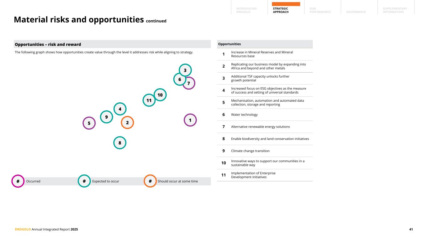 Opportunities – risk and reward The following graph shows how opportunities create value through the level it addresses risk while aligning to strategy. Occurred Expected to occur Should occur at some time Opportunities 1 Increase in Mineral Reserves and Mineral Resources base 2 Replicating our business model by expanding into Africa and beyond and other metals 3 Additional TSF capacity unlocks further growth potential 4 Increased focus on ESG objectives as the measure of success and setting of universal standards 5 Mechanisation, automation and automated data collection, storage and reporting 6 Water technology 7 Alternative renewable energy solutions 8 Enable biodiversity and land conservation initiatives 9 Climate change transition 10 Innovative ways to support our communities in a sustainable way 11 Implementation of Enterprise Development initiatives INTRODUCING DRDGOLD STRATEGIC APPROACH OUR PERFORMANCE GOVERNANCE SUPPLEMENTARY INFORMATION Material risks and opportunities continued DRDGOLD Annual Integrated Report 2025 41 # # # 8 9 4 5 1 7 6 3 10 11 2