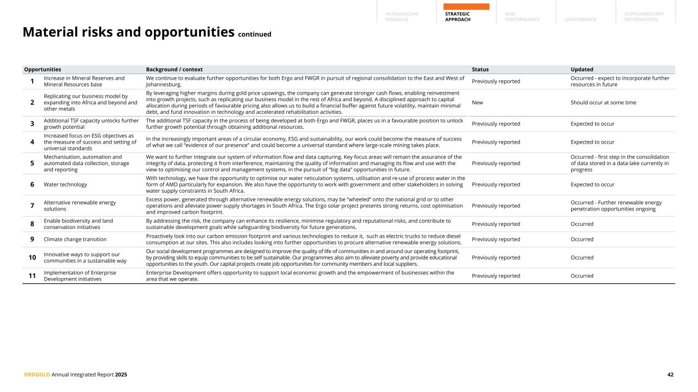 Opportunities Background / context Status Updated 1 Increase in Mineral Reserves and Mineral Resources base We continue to evaluate further opportunities for both Ergo and FWGR in pursuit of regional consolidation to the East and West of Johannesburg. Previously reported Occurred - expect to incorporate further resources in future 2 Replicating our business model by expanding into Africa and beyond and other metals By leveraging higher margins during gold price upswings, the company can generate stronger cash flows, enabling reinvestment into growth projects, such as replicating our business model in the rest of Africa and beyond. A disciplined approach to capital allocation during periods of favourable pricing also allows us to build a financial buffer against future volatility, maintain minimal debt, and fund innovation in technology and accelerated rehabilitation activities. New Should occur at some time 3 Additional TSF capacity unlocks further growth potential The additional TSF capacity in the process of being developed at both Ergo and FWGR, places us in a favourable position to unlock further growth potential through obtaining additional resources. Previously reported Expected to occur 4 Increased focus on ESG objectives as the measure of success and setting of universal standards In the increasingly important areas of a circular economy, ESG and sustainability, our work could become the measure of success of what we call “evidence of our presence” and could become a universal standard where large-scale mining takes place. Previously reported Expected to occur 5 Mechanisation, automation and automated data collection, storage and reporting We want to further integrate our system of information flow and data capturing. Key focus areas will remain the assurance of the integrity of data, protecting it from interference, maintaining the quality of information and managing its flow and use with the view to optimising our control and management systems, in the pursuit of “big data” opportunities in future. Previously reported Occurred - first step in the consolidation of data stored in a data-lake currently in progress 6 Water technology With technology, we have the opportunity to optimise our water reticulation systems, utilisation and re-use of process water in the form of AMD particularly for expansion. We also have the opportunity to work with government and other stakeholders in solving water supply constraints in South Africa. Previously reported Expected to occur 7 Alternative renewable energy solutions Excess power, generated through alternative renewable energy solutions, may be “wheeled” onto the national grid or to other operations and alleviate power supply shortages in South Africa. The Ergo solar project presents strong returns, cost optimisation and improved carbon footprint. Previously reported Occurred - Further renewable energy penetration opportunities ongoing 8 Enable biodiversity and land conservation initiatives By addressing the risk, the company can enhance its resilience, minimise regulatory and reputational risks, and contribute to sustainable development goals while safeguarding biodiversity for future generations. Previously reported Occurred 9 Climate change transition Proactively look into our carbon emission footprint and various technologies to reduce it, such as electric trucks to reduce diesel consumption at our sites. This also includes looking into further opportunities to procure alternative renewable energy solutions. Previously reported Occurred 10 Innovative ways to support our communities in a sustainable way Our social development programmes are designed to improve the quality of life of communities in and around our operating footprint, by providing skills to equip communities to be self sustainable. Our programmes also aim to alleviate poverty and provide educational opportunities to the youth. Our capital projects create job opportunities for community members and local suppliers. Previously reported Occurred 11 Implementation of Enterprise Development initiatives Enterprise Development offers opportunity to support local economic growth and the empowerment of businesses within the area that we operate. Previously reported Occurred INTRODUCING DRDGOLD STRATEGIC APPROACH OUR PERFORMANCE GOVERNANCE SUPPLEMENTARY INFORMATION Material risks and opportunities continued DRDGOLD Annual Integrated Report 2025 42