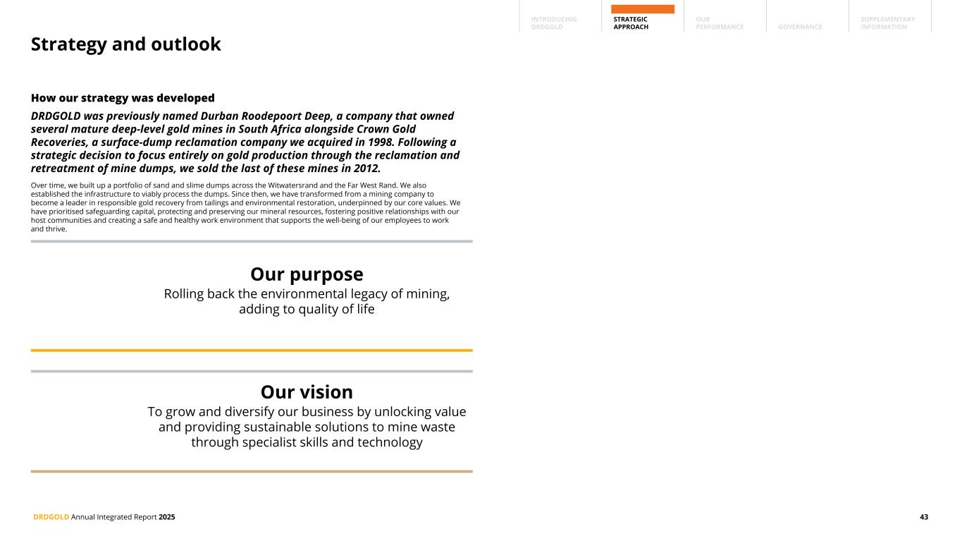 How our strategy was developed DRDGOLD was previously named Durban Roodepoort Deep, a company that owned several mature deep-level gold mines in South Africa alongside Crown Gold Recoveries, a surface-dump reclamation company we acquired in 1998. Following a strategic decision to focus entirely on gold production through the reclamation and retreatment of mine dumps, we sold the last of these mines in 2012. Over time, we built up a portfolio of sand and slime dumps across the Witwatersrand and the Far West Rand. We also established the infrastructure to viably process the dumps. Since then, we have transformed from a mining company to become a leader in responsible gold recovery from tailings and environmental restoration, underpinned by our core values. We have prioritised safeguarding capital, protecting and preserving our mineral resources, fostering positive relationships with our host communities and creating a safe and healthy work environment that supports the well-being of our employees to work and thrive. Our purpose Rolling back the environmental legacy of mining, adding to quality of life Our vision To grow and diversify our business by unlocking value and providing sustainable solutions to mine waste through specialist skills and technology INTRODUCING DRDGOLD STRATEGIC APPROACH OUR PERFORMANCE GOVERNANCE SUPPLEMENTARY INFORMATION Strategy and outlook DRDGOLD Annual Integrated Report 2025 43 We have transformed from a mining company to become a leader in responsible gold recovery from tailings and environmental rehabilitation.
