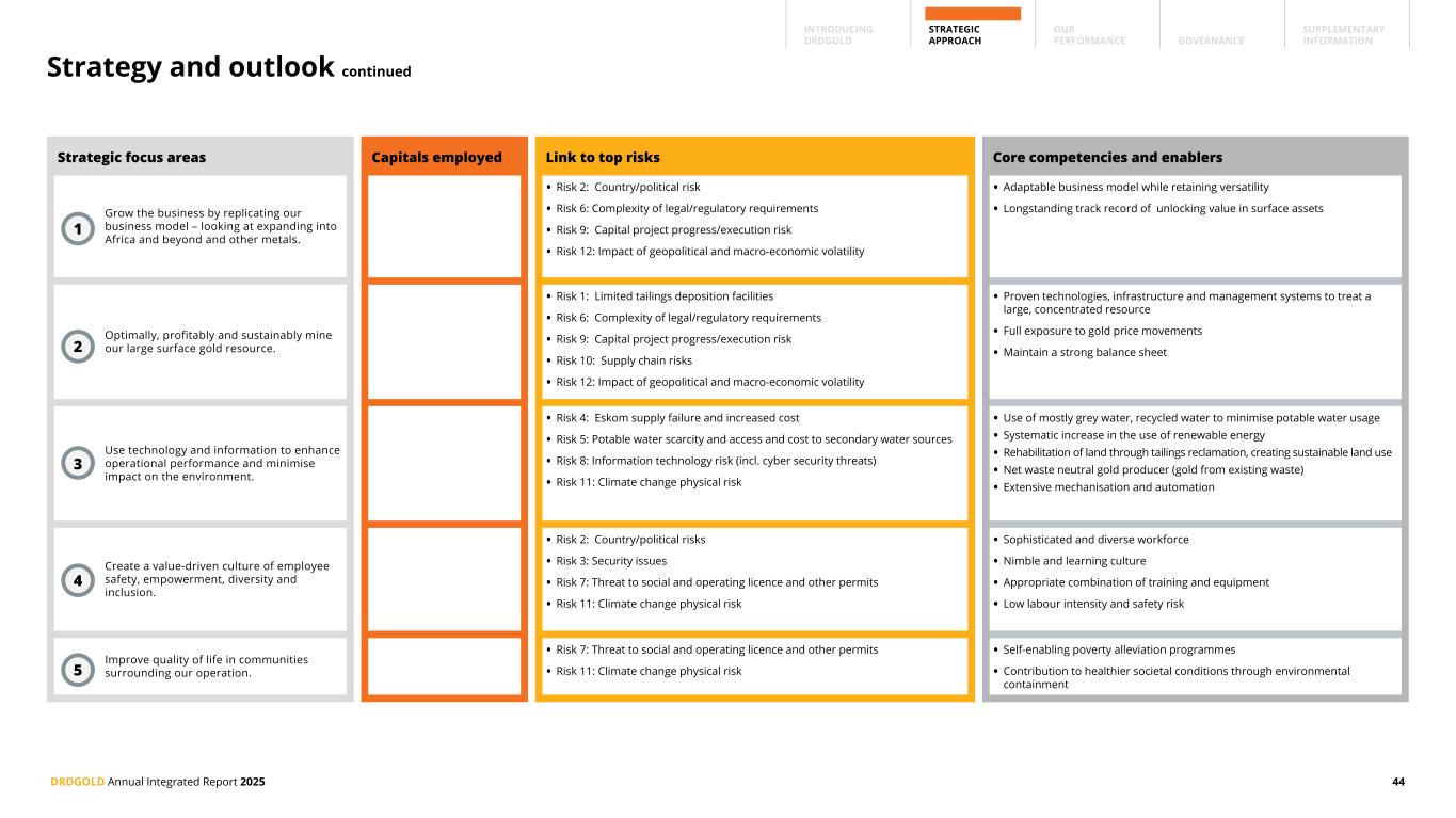 Strategic focus areas Capitals employed Link to top risks Core competencies and enablers Grow the business by replicating our business model – looking at expanding into Africa and beyond and other metals. • Risk 2: Country/political risk • Risk 6: Complexity of legal/regulatory requirements • Risk 9: Capital project progress/execution risk • Risk 12: Impact of geopolitical and macro-economic volatility • Adaptable business model while retaining versatility • Longstanding track record of unlocking value in surface assets Optimally, profitably and sustainably mine our large surface gold resource. • Risk 1: Limited tailings deposition facilities • Risk 6: Complexity of legal/regulatory requirements • Risk 9: Capital project progress/execution risk • Risk 10: Supply chain risks • Risk 12: Impact of geopolitical and macro-economic volatility • Proven technologies, infrastructure and management systems to treat a large, concentrated resource • Full exposure to gold price movements • Maintain a strong balance sheet Use technology and information to enhance operational performance and minimise impact on the environment. • Risk 4: Eskom supply failure and increased cost • Risk 5: Potable water scarcity and access and cost to secondary water sources • Risk 8: Information technology risk (incl. cyber security threats) • Risk 11: Climate change physical risk • Use of mostly grey water, recycled water to minimise potable water usage • Systematic increase in the use of renewable energy • Rehabilitation of land through tailings reclamation, creating sustainable land use • Net waste neutral gold producer (gold from existing waste) • Extensive mechanisation and automation Create a value-driven culture of employee safety, empowerment, diversity and inclusion. • Risk 2: Country/political risks • Risk 3: Security issues • Risk 7: Threat to social and operating licence and other permits • Risk 11: Climate change physical risk • Sophisticated and diverse workforce • Nimble and learning culture • Appropriate combination of training and equipment • Low labour intensity and safety risk Improve quality of life in communities surrounding our operation. • Risk 7: Threat to social and operating licence and other permits • Risk 11: Climate change physical risk • Self-enabling poverty alleviation programmes • Contribution to healthier societal conditions through environmental containment INTRODUCING DRDGOLD STRATEGIC APPROACH OUR PERFORMANCE GOVERNANCE SUPPLEMENTARY INFORMATION Strategy and outlook continued DRDGOLD Annual Integrated Report 2025 44 1 4 3 2 5